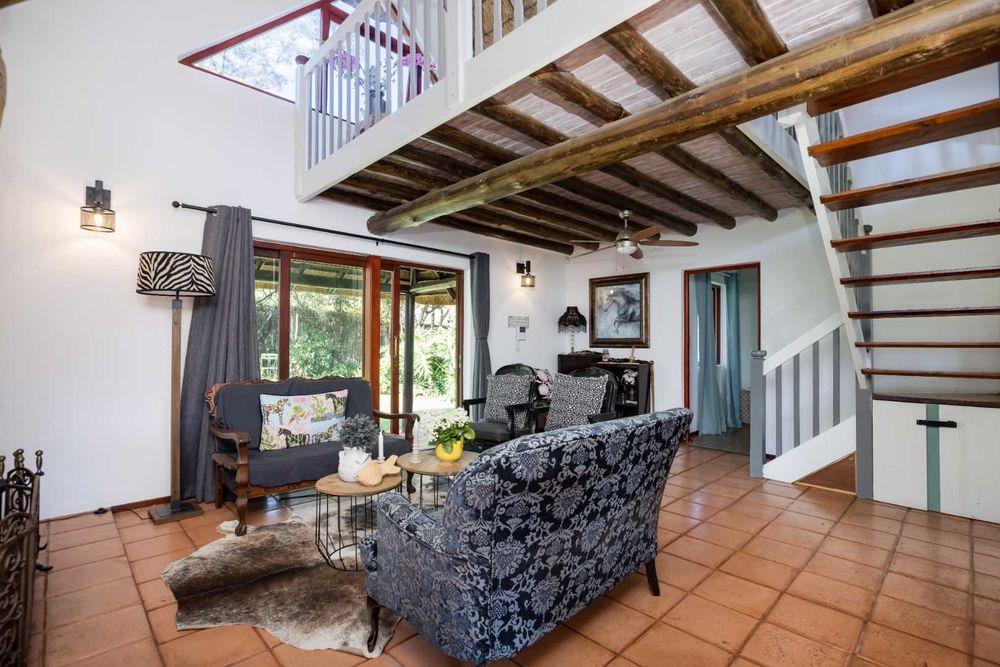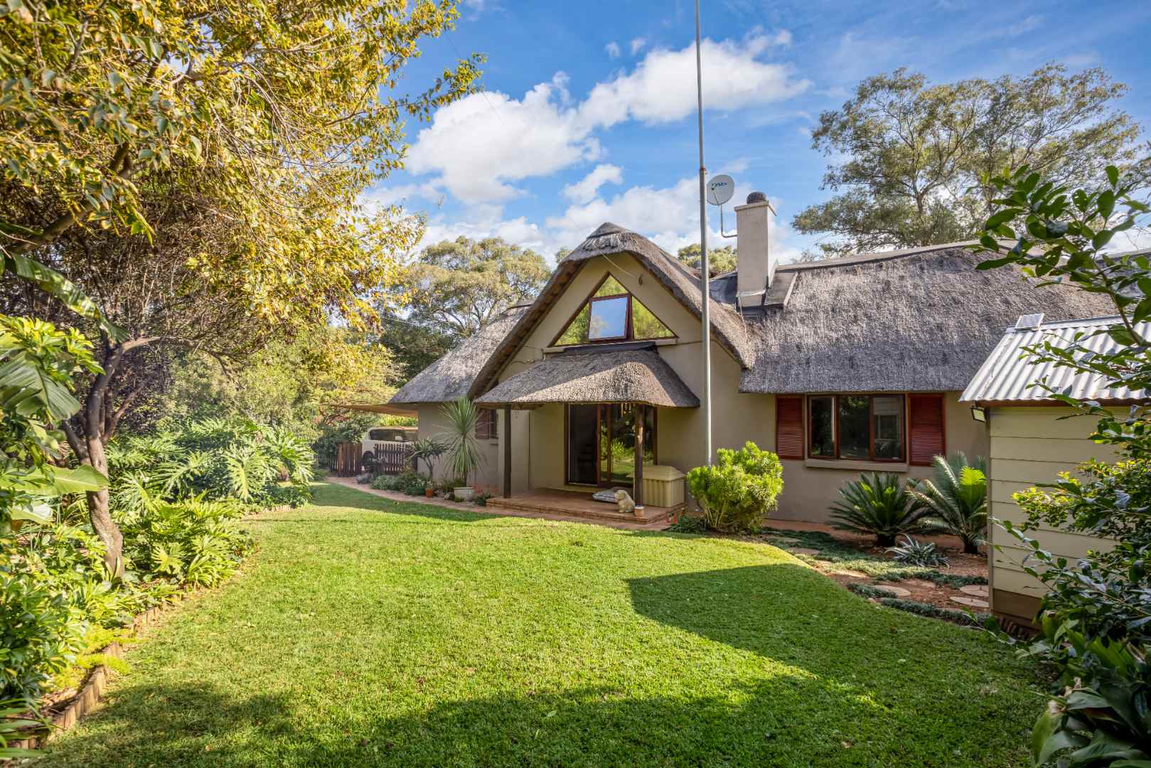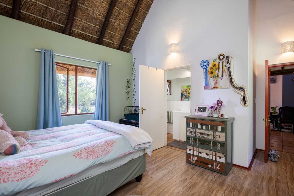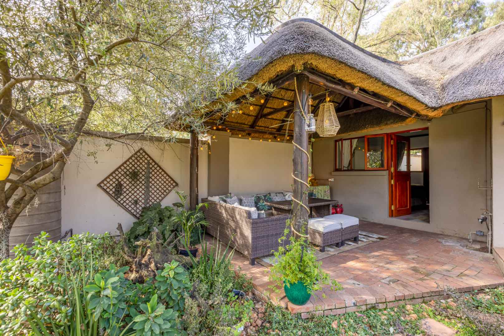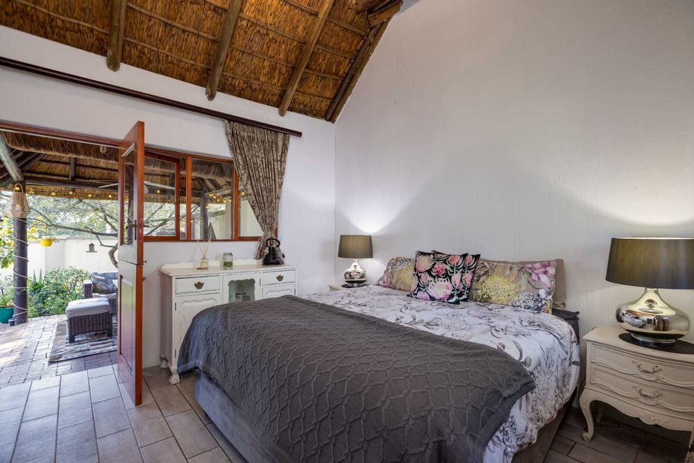An entertainer's dream thatched outdoor patio is surrounded by a manicured garden, is lovely and tree-lined giving you and your family the privacy and tranquillity you all deserve. Added onto the patio is an additional utility room which can be utilised for various options, a work from home space or a games room.