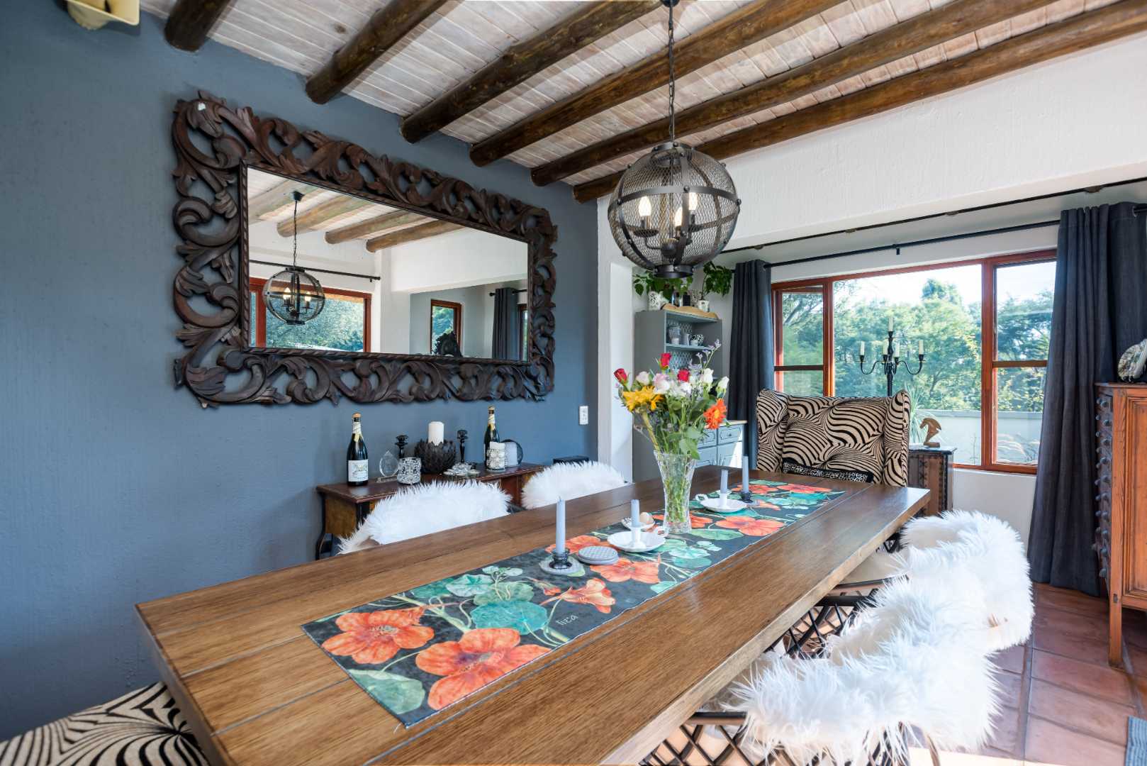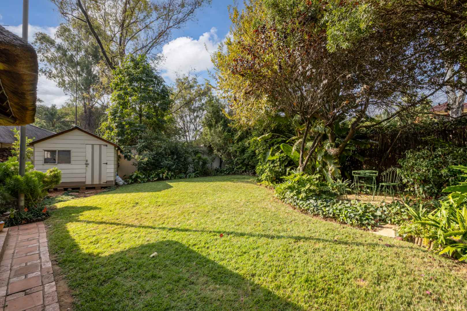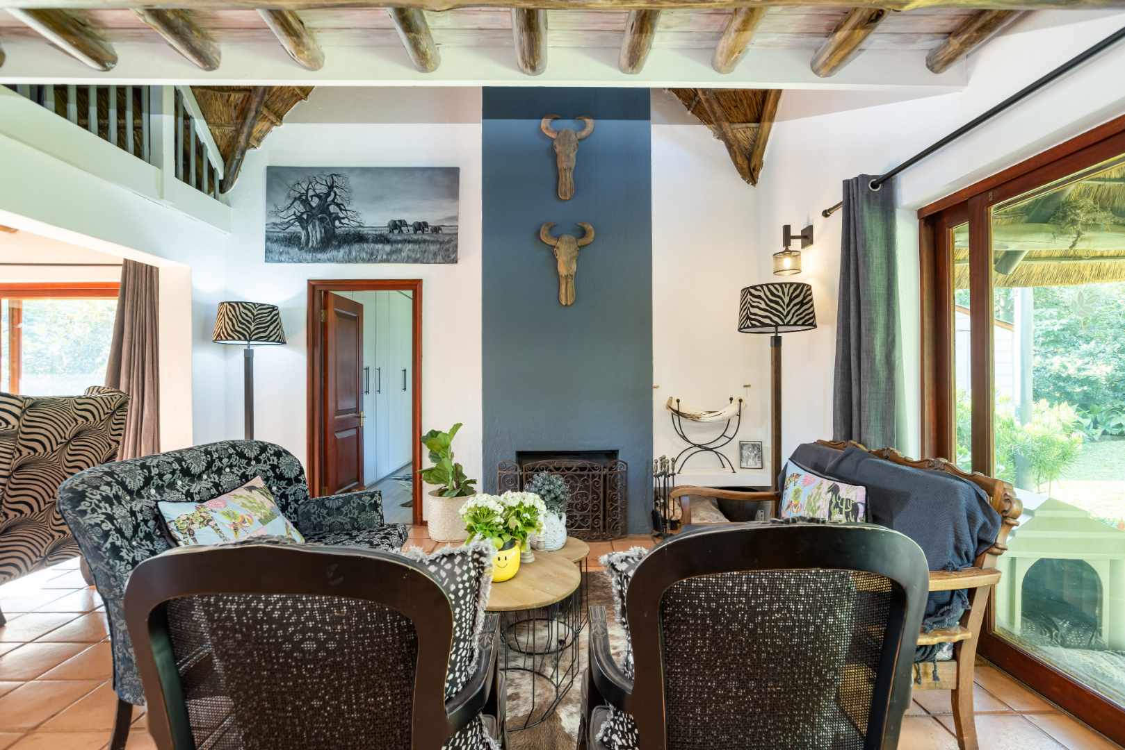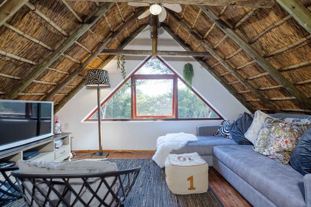 An entertainer's dream thatched outdoor patio is surrounded by a manicured garden, is lovely and tree-lined giving you and your family the privacy and tranquillity you all deserve. Added onto the patio is an additional utility room which can be utilised for various options, a work from home space or a games room.