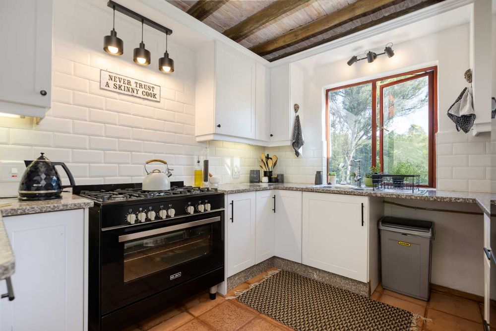 A welcoming entrance flows onto an open plan lounge boasting a wood burning fireplace. The open concept dining area opens with big sliders onto your picturesque outdoor garden. Newly fitted kitchen boasts granite countertops, a breakfast nook, dual hobs electric and gas with extractor fan, under counter space for 2 appliances, plus ample built-in cupboards.