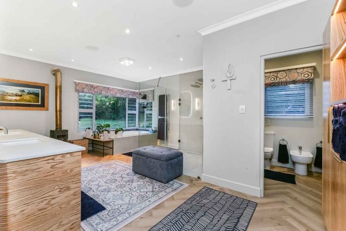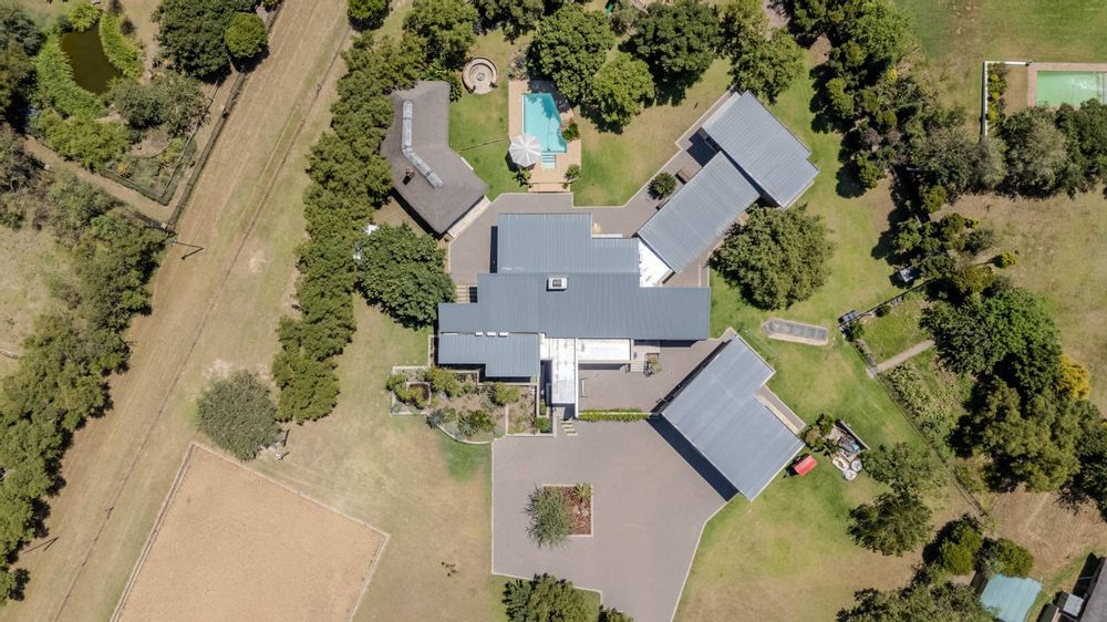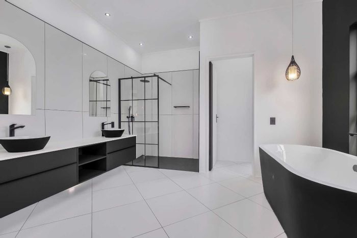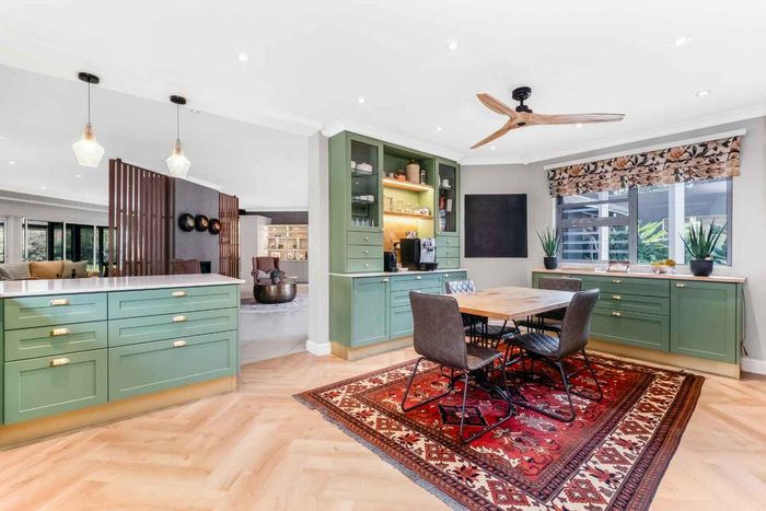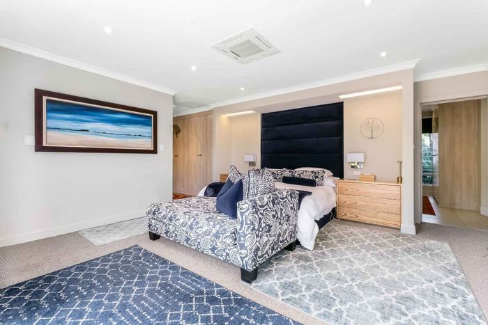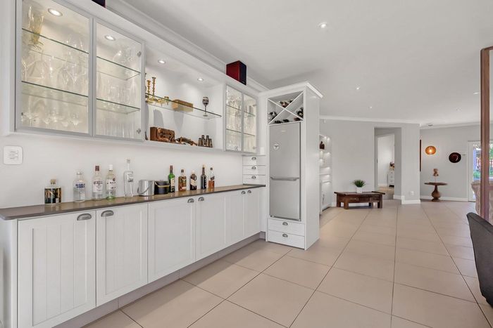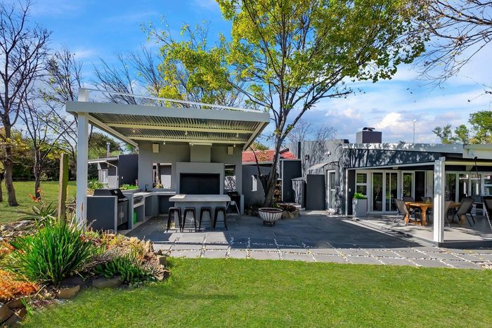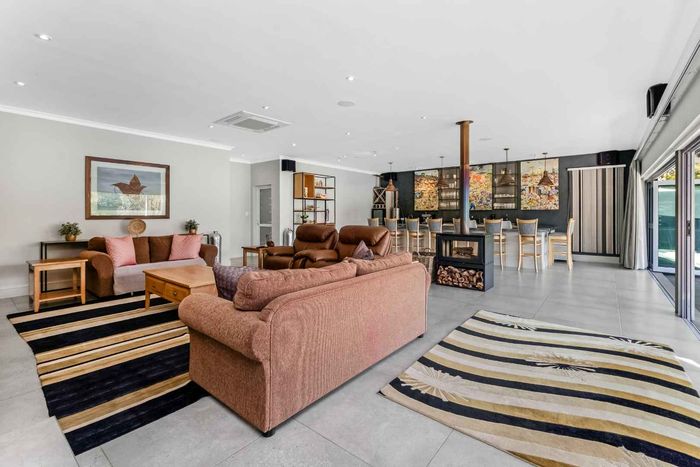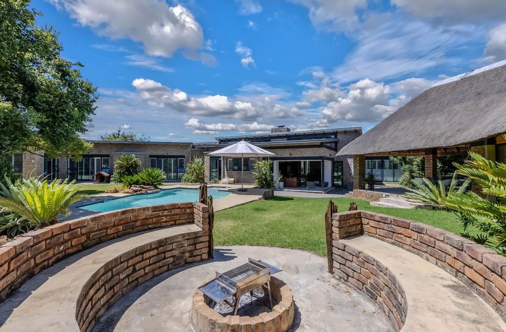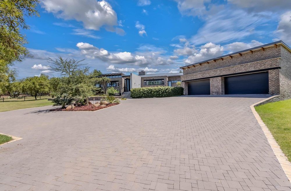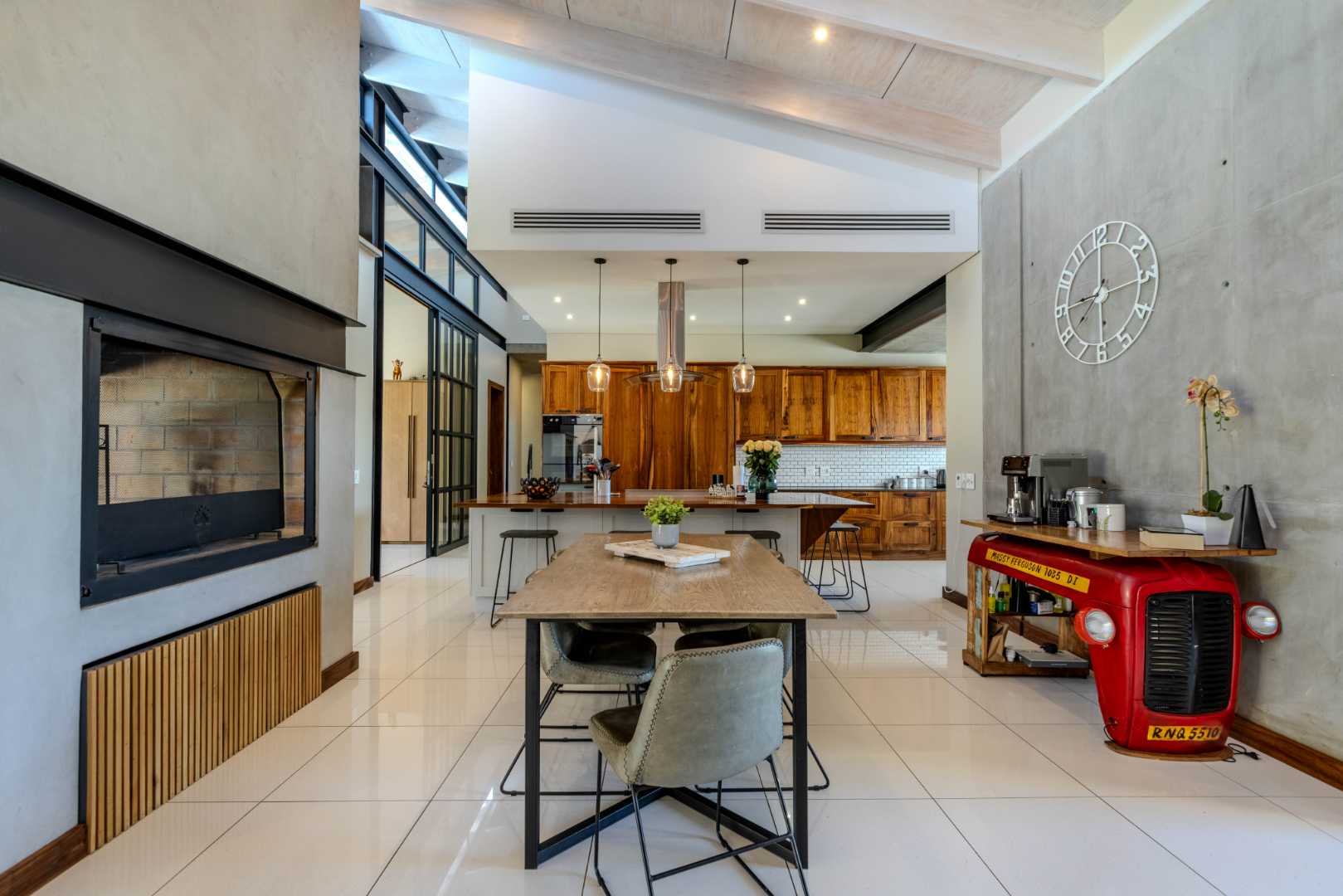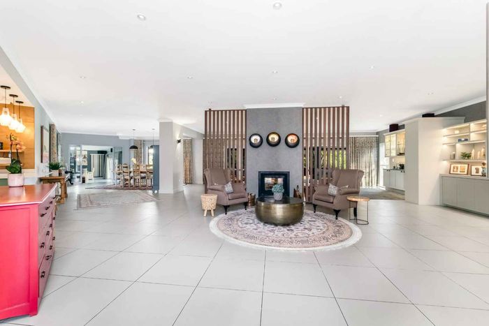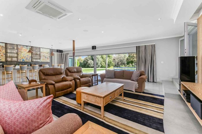 Found at the bottom to a quiet cul-de-sac, this modern designed single-levelled family home just simply won't allow you to stop staring. Eye-catching and inviting double volume entrance with gorgeous lighting, flows seamlessly onto the spacious formal lounge and dining area boasting a substantial wood burning fireplace, exquisitely appointed with bespoke furnishings throughout. These areas have double volume ceilings with exposed trusses and hold chandeliers opening up with supersized glass sliding doors onto the extravagant garden, overlooking the heated swimming pool and massive entertainment area and games room - Brilliantly flexible for indoor/outdoor entertaining. The cozy family lounge opens onto a section of the garden making for the perfect family unwinding sessions. Enormous open air kitchen designed for convenience with Caesarstone counter tops, centre island with gas hob and electric oven, prep bowl, breakfast bar, double door plumbed fridge space, separate scullery area with under counter space for your appliances, walk-in pantry plus ample built-in solid wood cupboards.