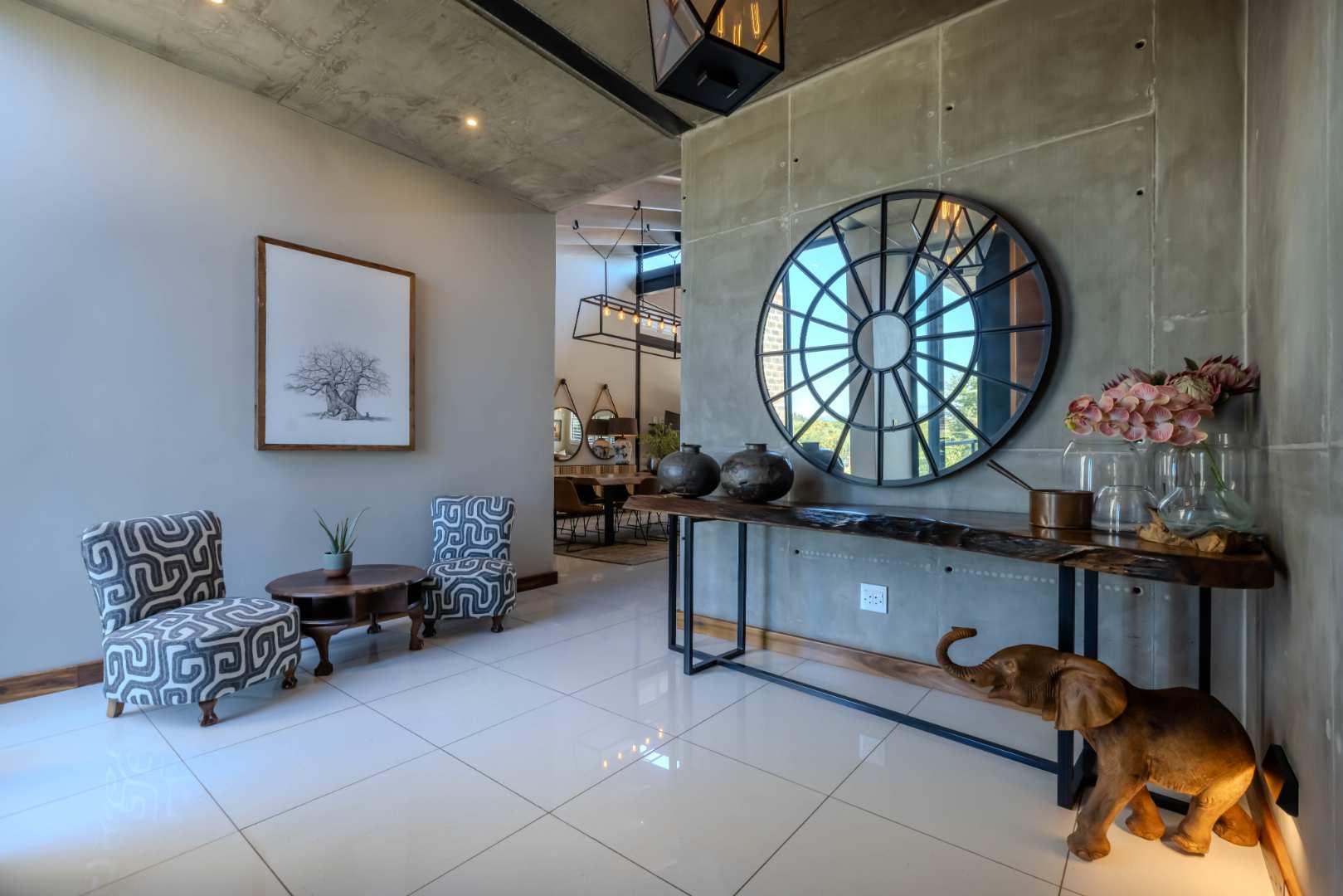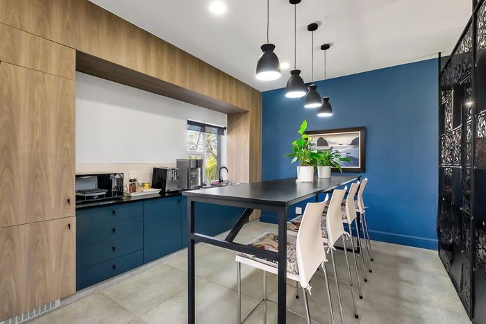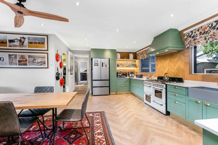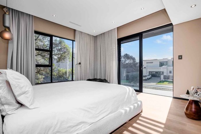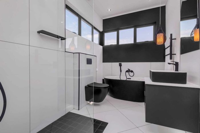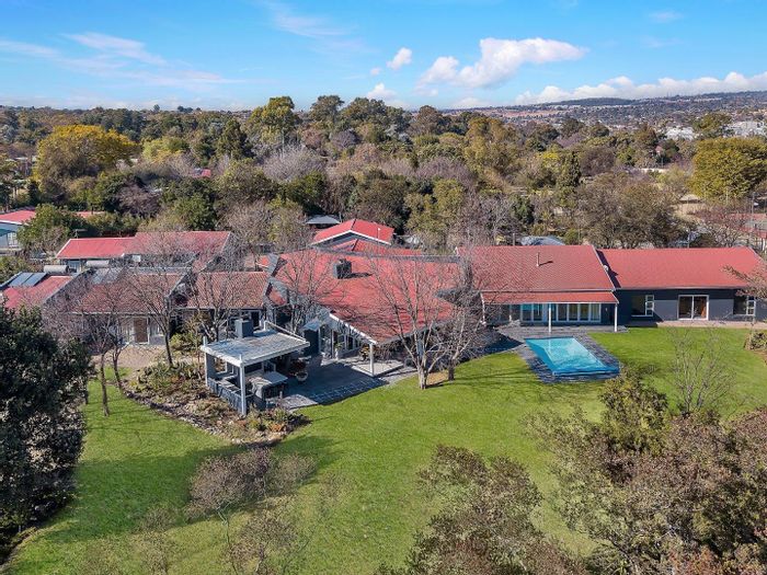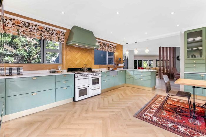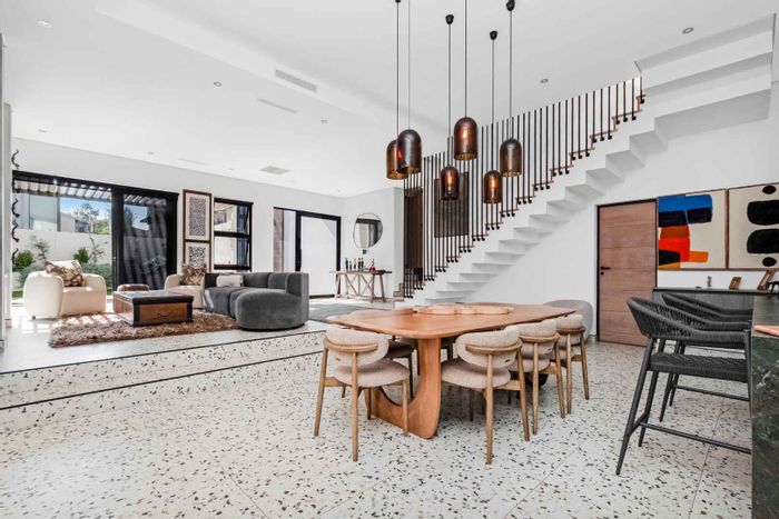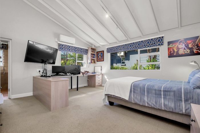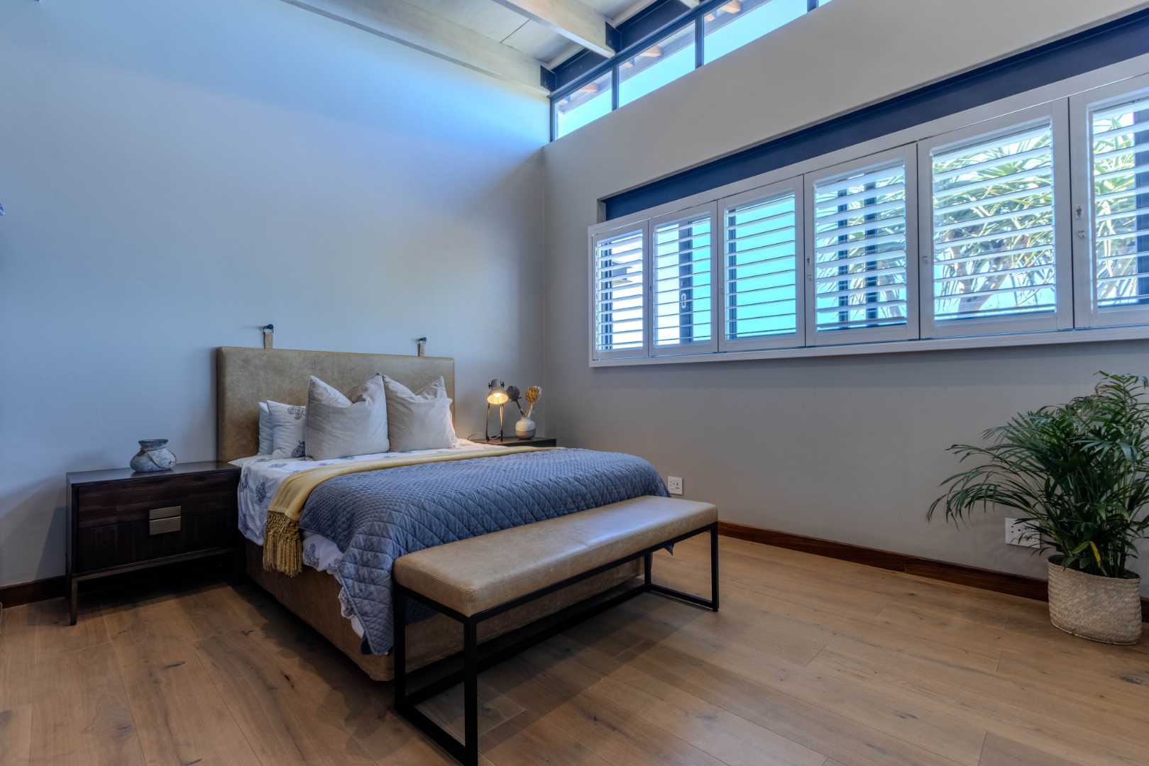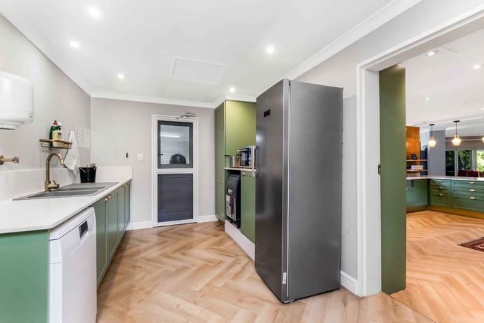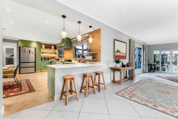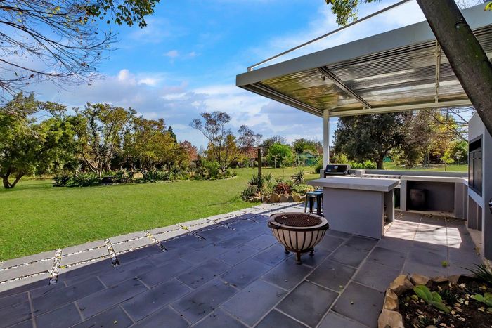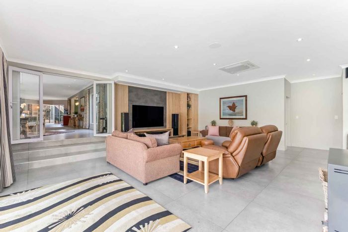 Found at the bottom to a quiet cul-de-sac, this modern designed single-levelled family home just simply won't allow you to stop staring. Eye-catching and inviting double volume entrance with gorgeous lighting, flows seamlessly onto the spacious formal lounge and dining area boasting a substantial wood burning fireplace, exquisitely appointed with bespoke furnishings throughout. These areas have double volume ceilings with exposed trusses and hold chandeliers opening up with supersized glass sliding doors onto the extravagant garden, overlooking the heated swimming pool and massive entertainment area and games room - Brilliantly flexible for indoor/outdoor entertaining. The cozy family lounge opens onto a section of the garden making for the perfect family unwinding sessions. Enormous open air kitchen designed for convenience with Caesarstone counter tops, centre island with gas hob and electric oven, prep bowl, breakfast bar, double door plumbed fridge space, separate scullery area with under counter space for your appliances, walk-in pantry plus ample built-in solid wood cupboards.