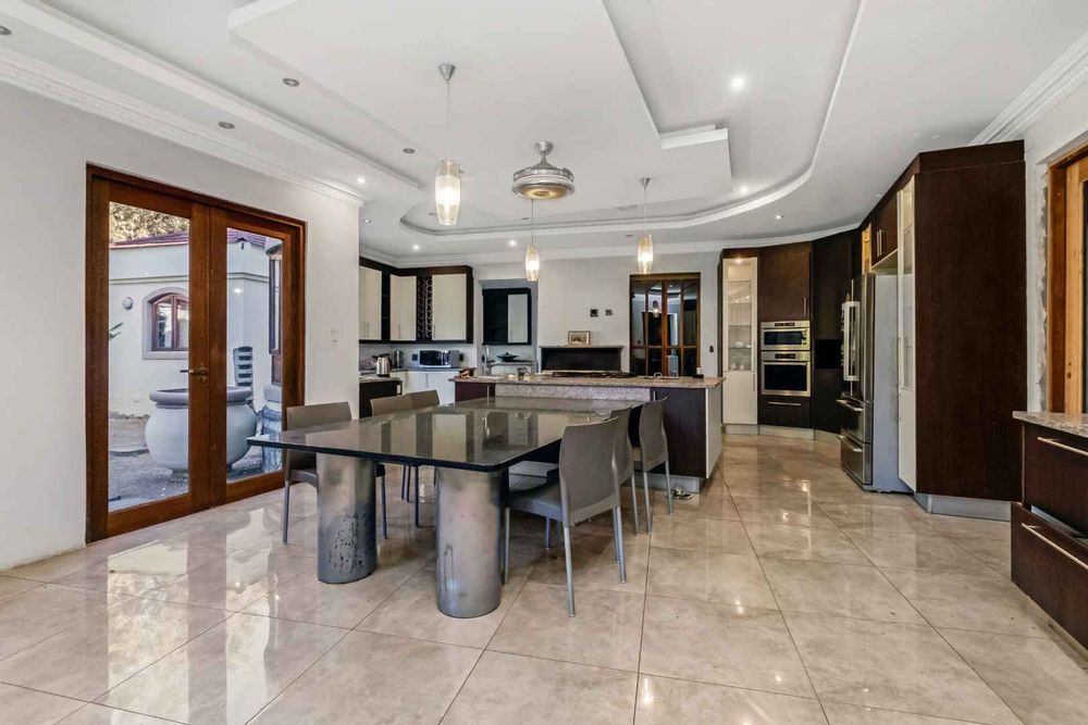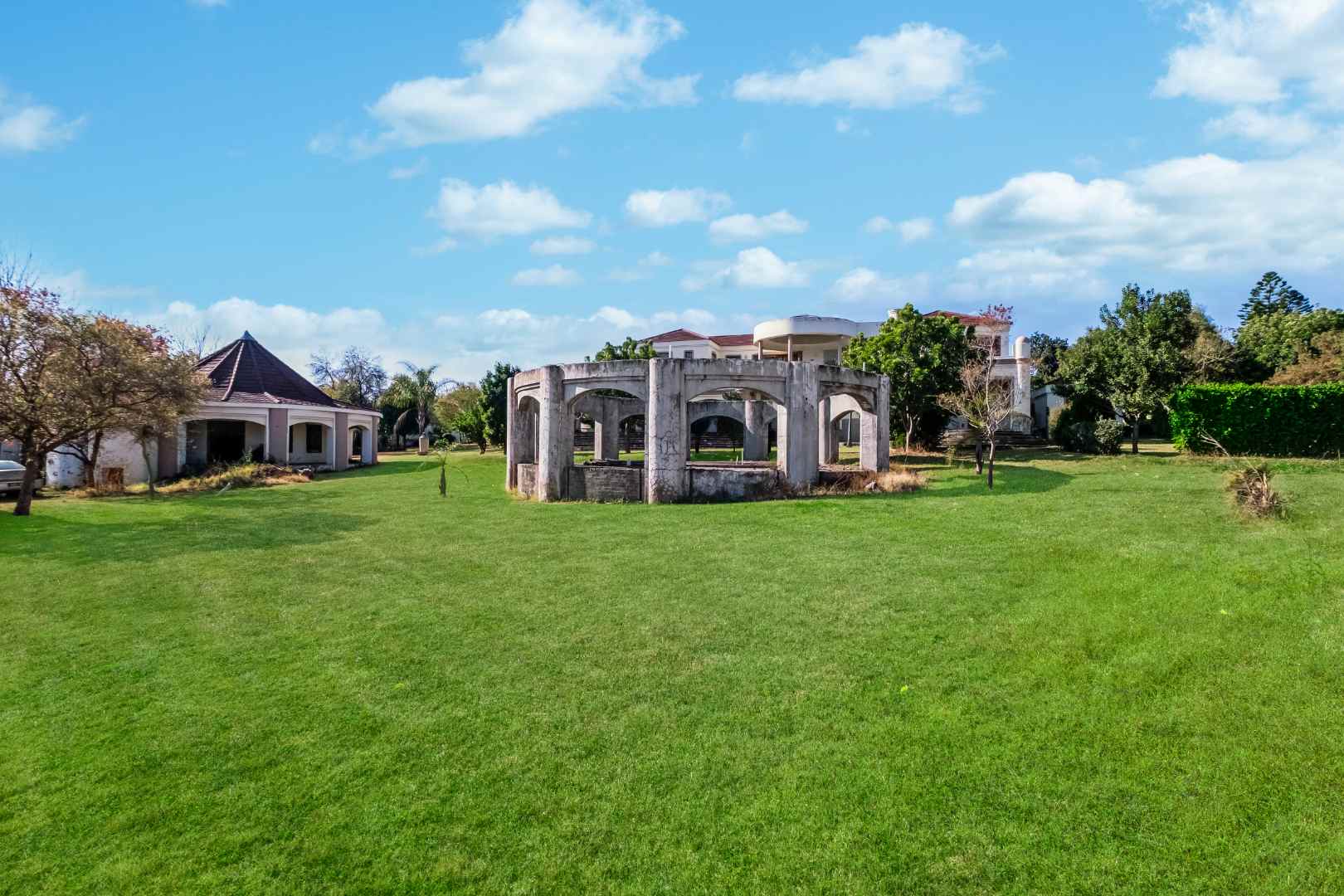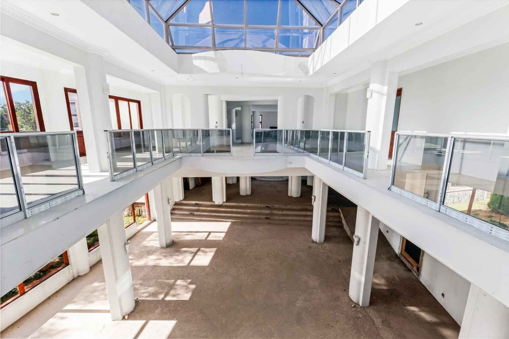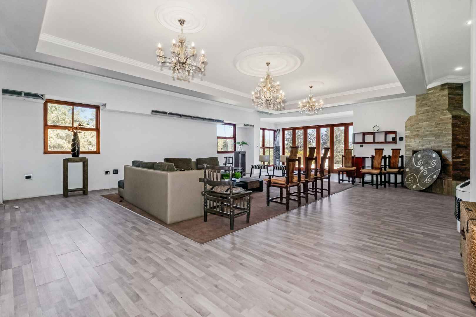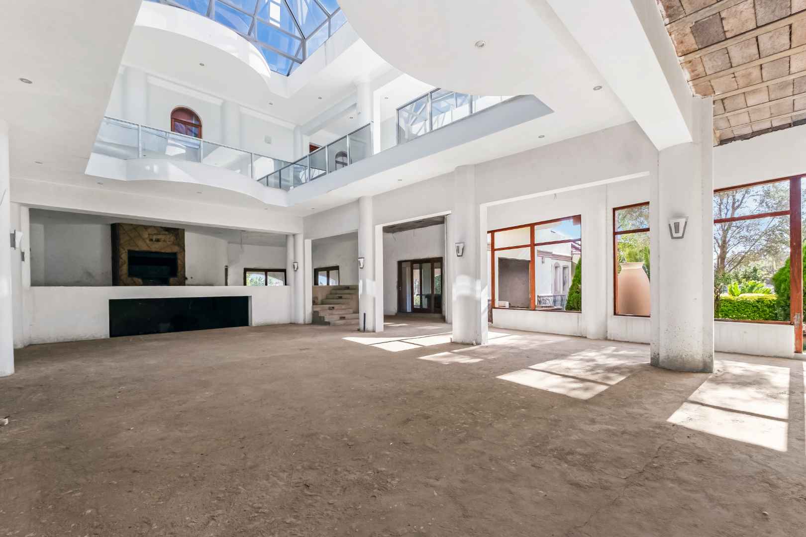 The main homestead boasts a welcoming light and bright entrance hall boasting a statement staircase to set the tone of what’s ahead. Open plan concept living spaces all boasting big bold statement fireplaces plus a study or work from home office space is tucked away behind your reception areas. All the reception areas are thoughtfully positioned around what the owner originally envisioned as an indoor swimming pool, creating a unique central feature that unites the living and entertaining spaces. The covered entertainers patio complete with a built-in braai, offers yet another perfect space for gatherings and year-round enjoyment. A massive kitchen area, with ample built-in cupboards space, gas hob and electric ovens, breakfast bar, with the main kitchen offering a separate scullery and laundry area that can accommodate all your appliances. The guest cloakroom is neatly tucked away.