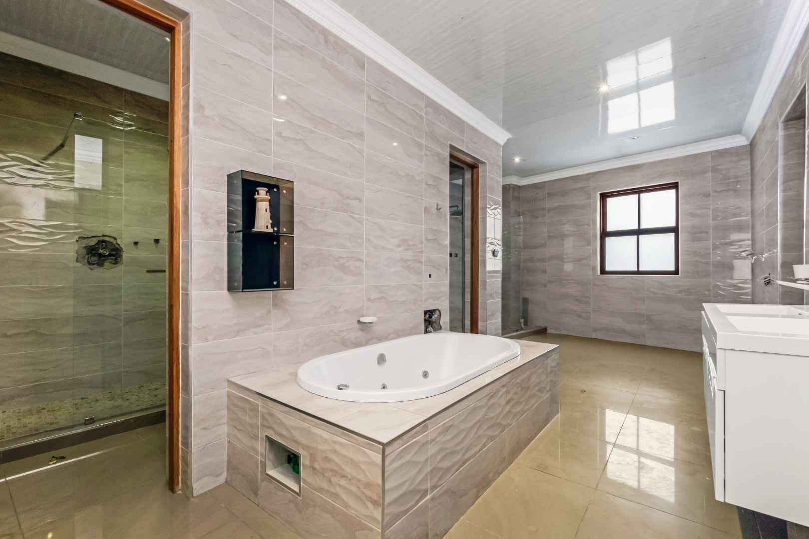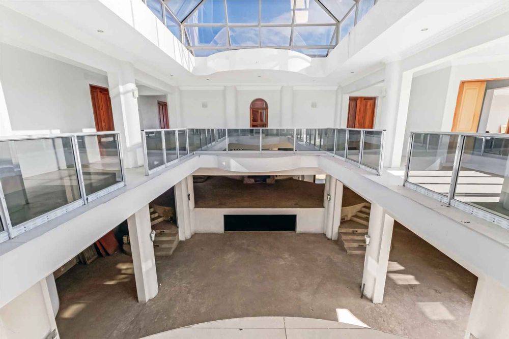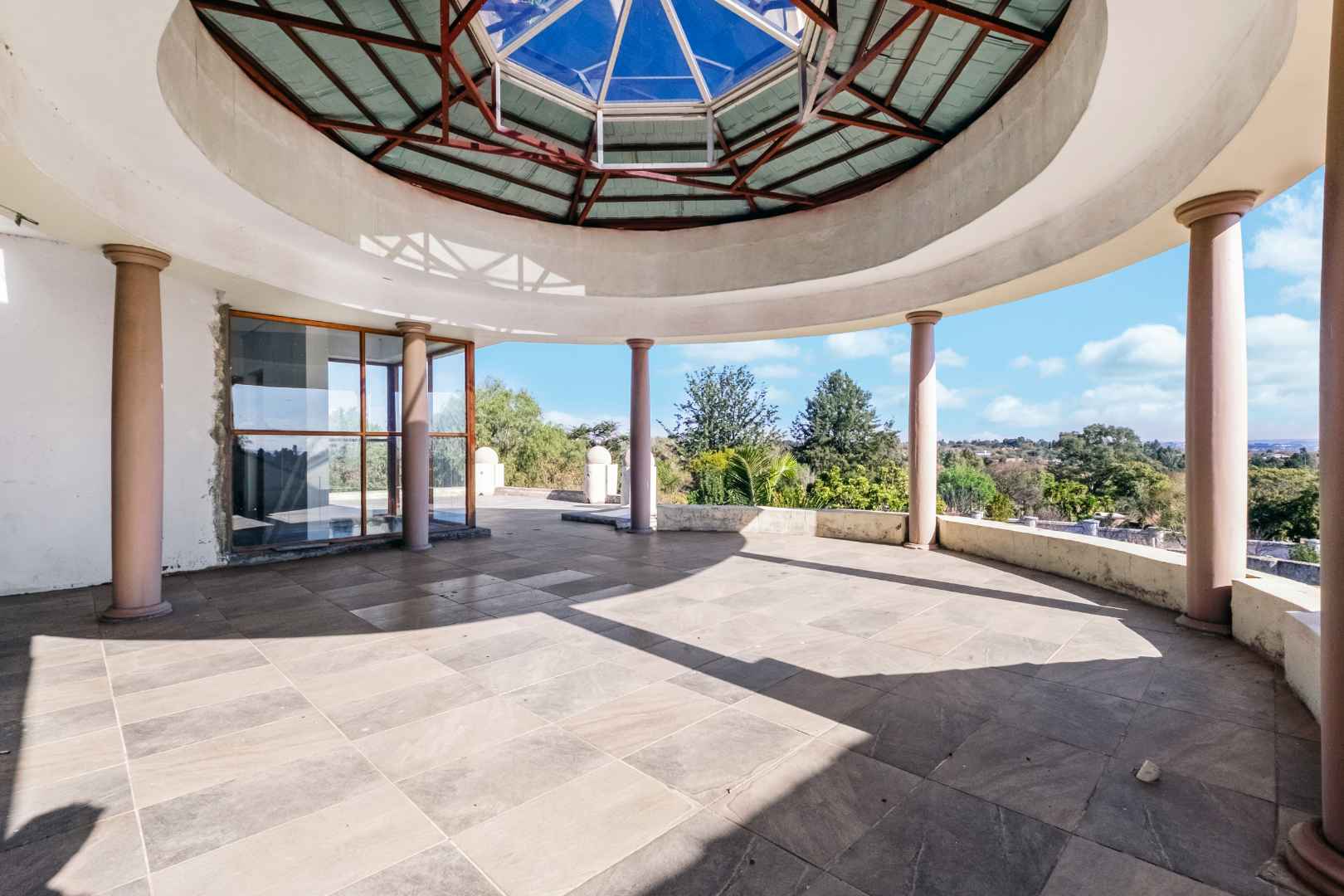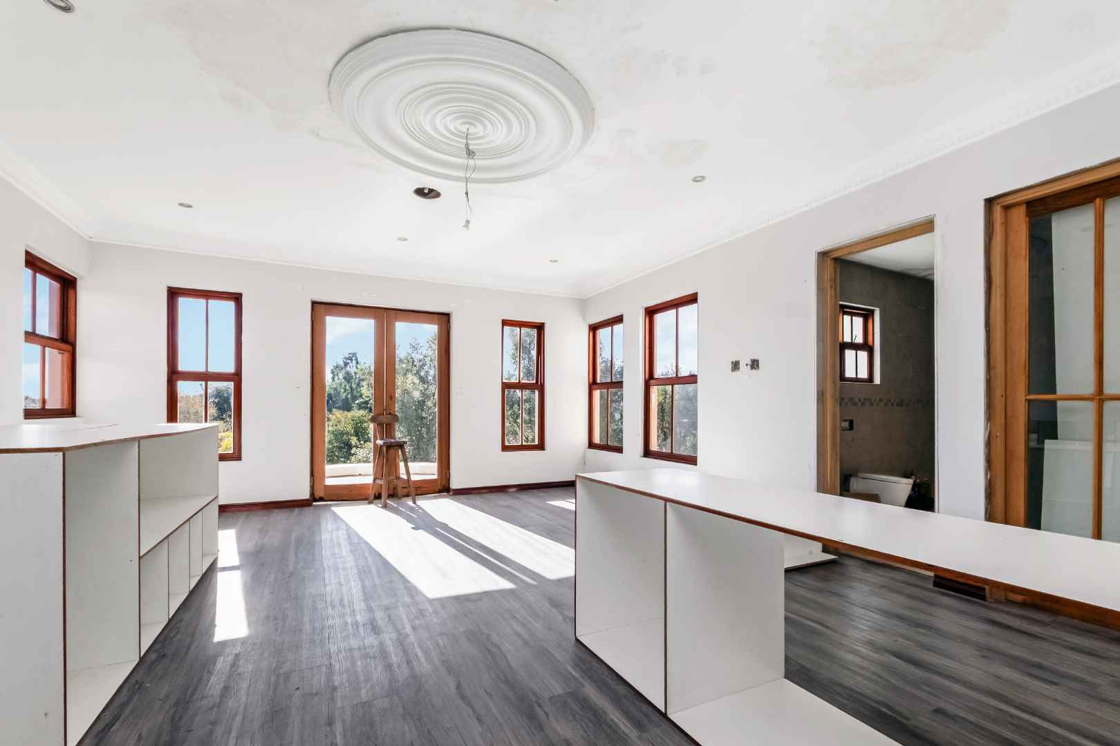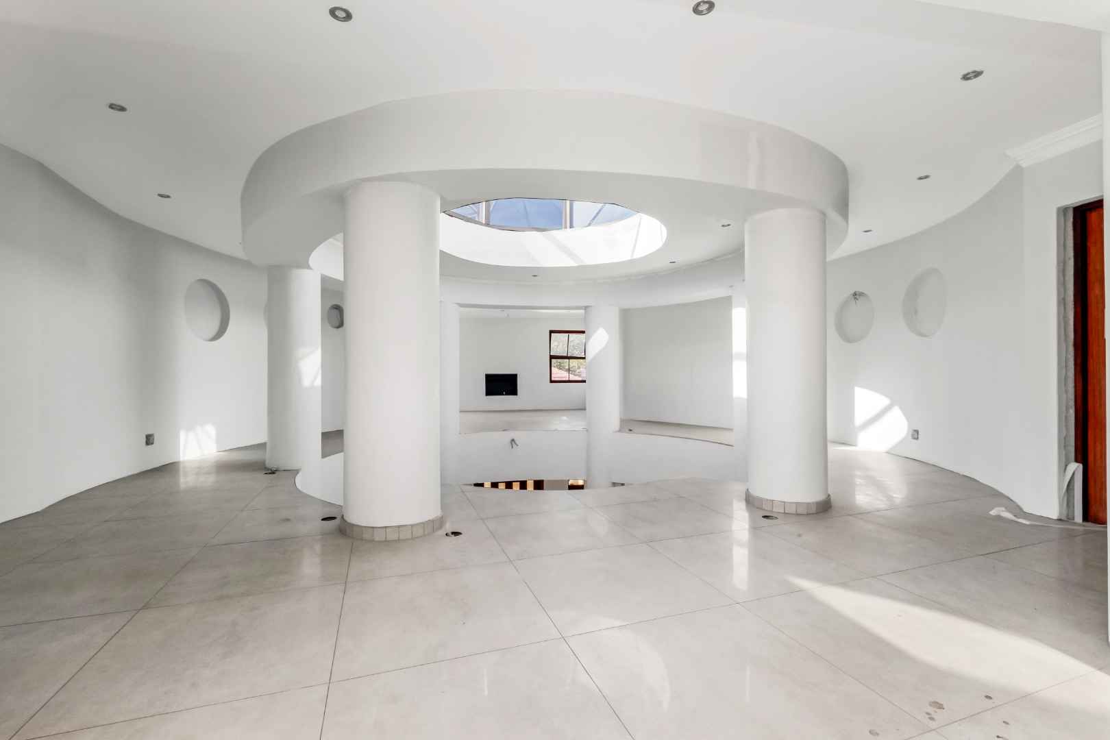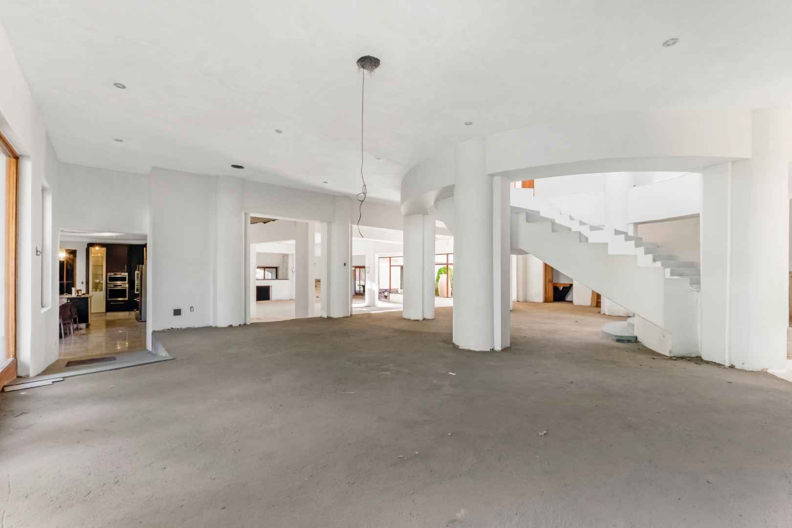 The main homestead boasts a welcoming light and bright entrance hall boasting a statement staircase to set the tone of what’s ahead. Open plan concept living spaces all boasting big bold statement fireplaces plus a study or work from home office space is tucked away behind your reception areas. All the reception areas are thoughtfully positioned around what the owner originally envisioned as an indoor swimming pool, creating a unique central feature that unites the living and entertaining spaces. The covered entertainers patio complete with a built-in braai, offers yet another perfect space for gatherings and year-round enjoyment. A massive kitchen area, with ample built-in cupboards space, gas hob and electric ovens, breakfast bar, with the main kitchen offering a separate scullery and laundry area that can accommodate all your appliances. The guest cloakroom is neatly tucked away.