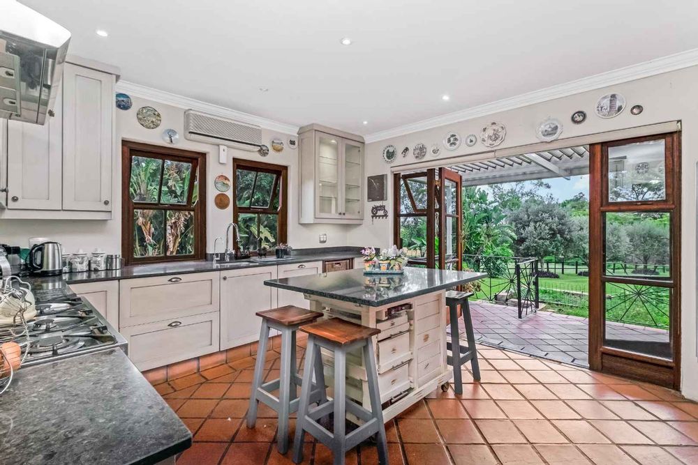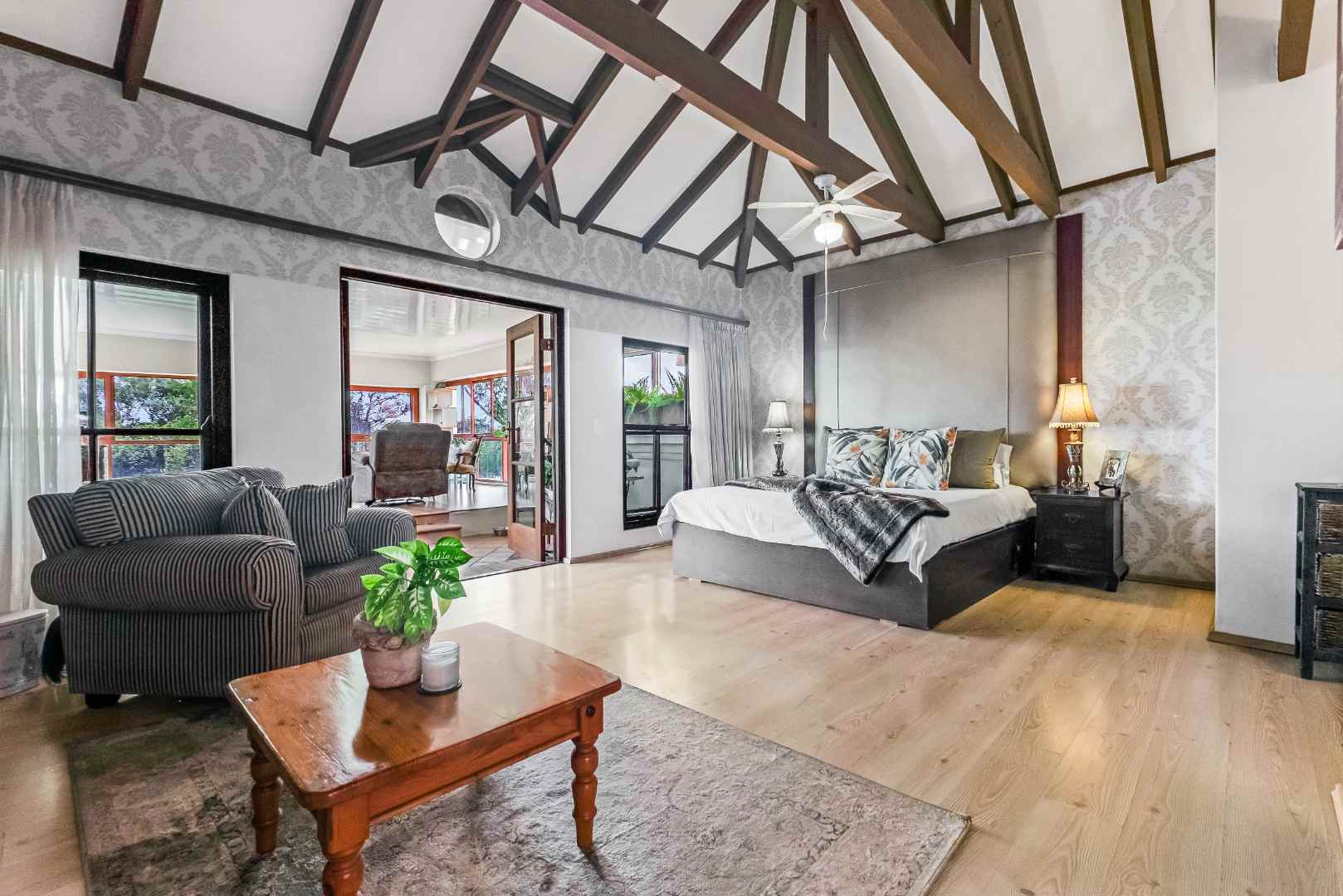 The private dining area is intimate yet spacious and feels refined, calm and quietly impressive. A spacious country style kitchen with granite counter tops, breakfast bar/centre island, prep bowl, gas hob with electric oven plus extractor, separate scullery / laundry space where all your appliances are accommodated, plus ample built-in cupboards. Adjacent to the kitchen is a beautiful informal dining area where you can sit in the mornings and evenings as a family and enjoy your meals together whilst listening to the birds that the garden attracts. The kitchen area opens onto the expansive patio, but this time overlooking the well maintained veggie patch. A family lounge is tucked away and a great space for the family to relax and unwind. The downstairs floor plan is complete with 3 sun-filled bedrooms plus 2 bathrooms (one is en-suite) plus a guest cloakroom and under the stairs storage.