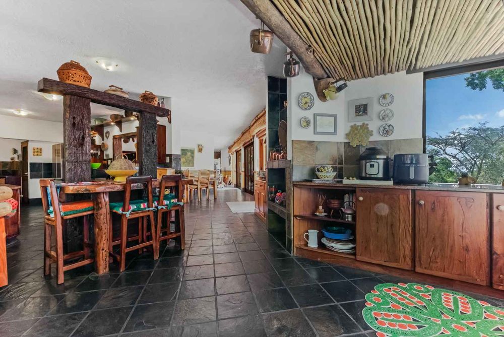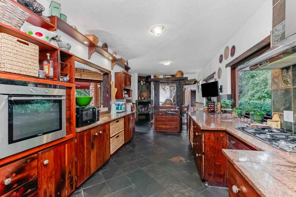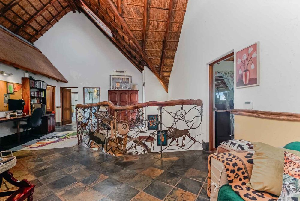 This vast, well-maintained property offers the following: African blue slate, wooden windows and railway sleeper lintels throughout the main residence, double automated garage with loft / workshop which has direct access into the home, covered carports to accommodate 8 vehicles on the property, solar PV (2x10.65KWH batteries, 8.8 KWH invertor, 7.4 KWH x 16 solar panels), heat pump providing 525 litres hot water through 3 geysers, prepaid electricity, electric fence plus alarm system, 2 french drains plus septic tank, double staff accommodation with small kitchenette, plus the home and cottage is fibre enabled.