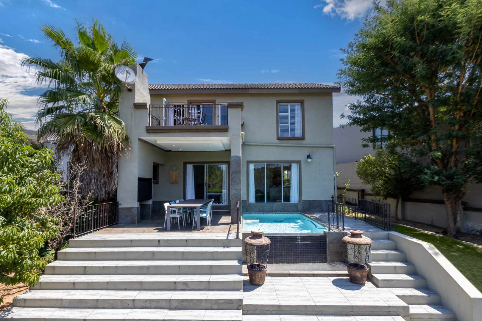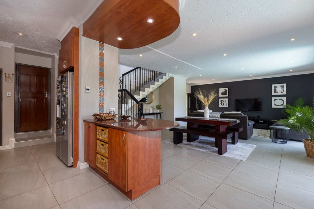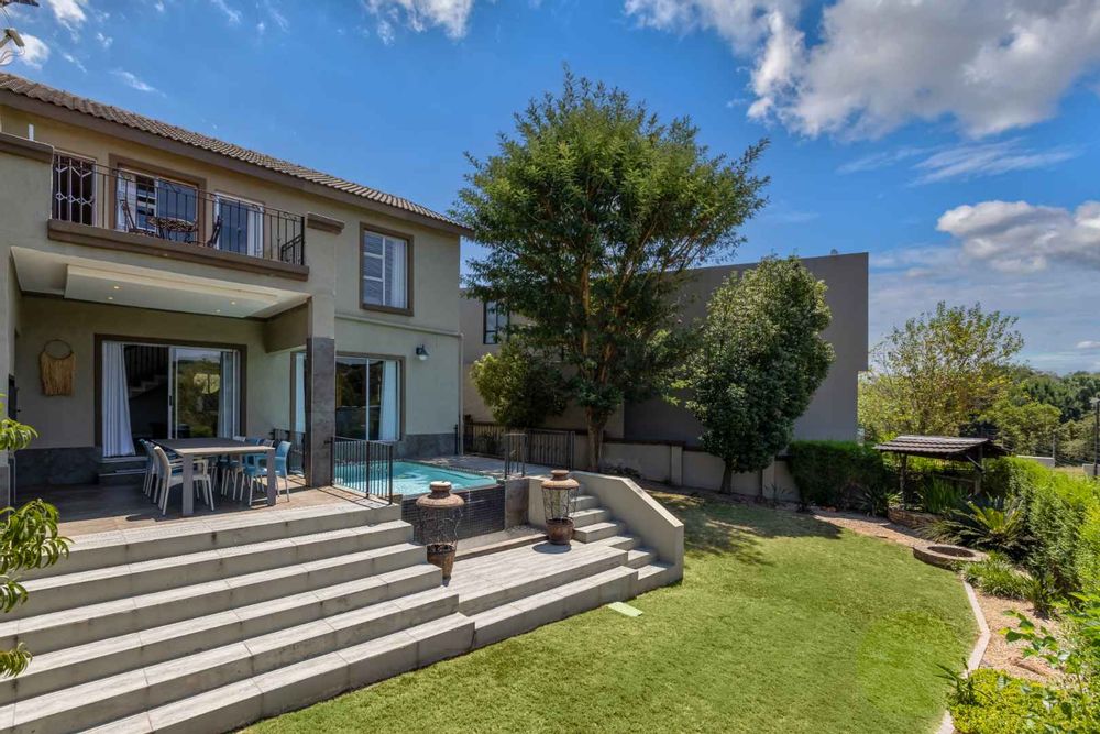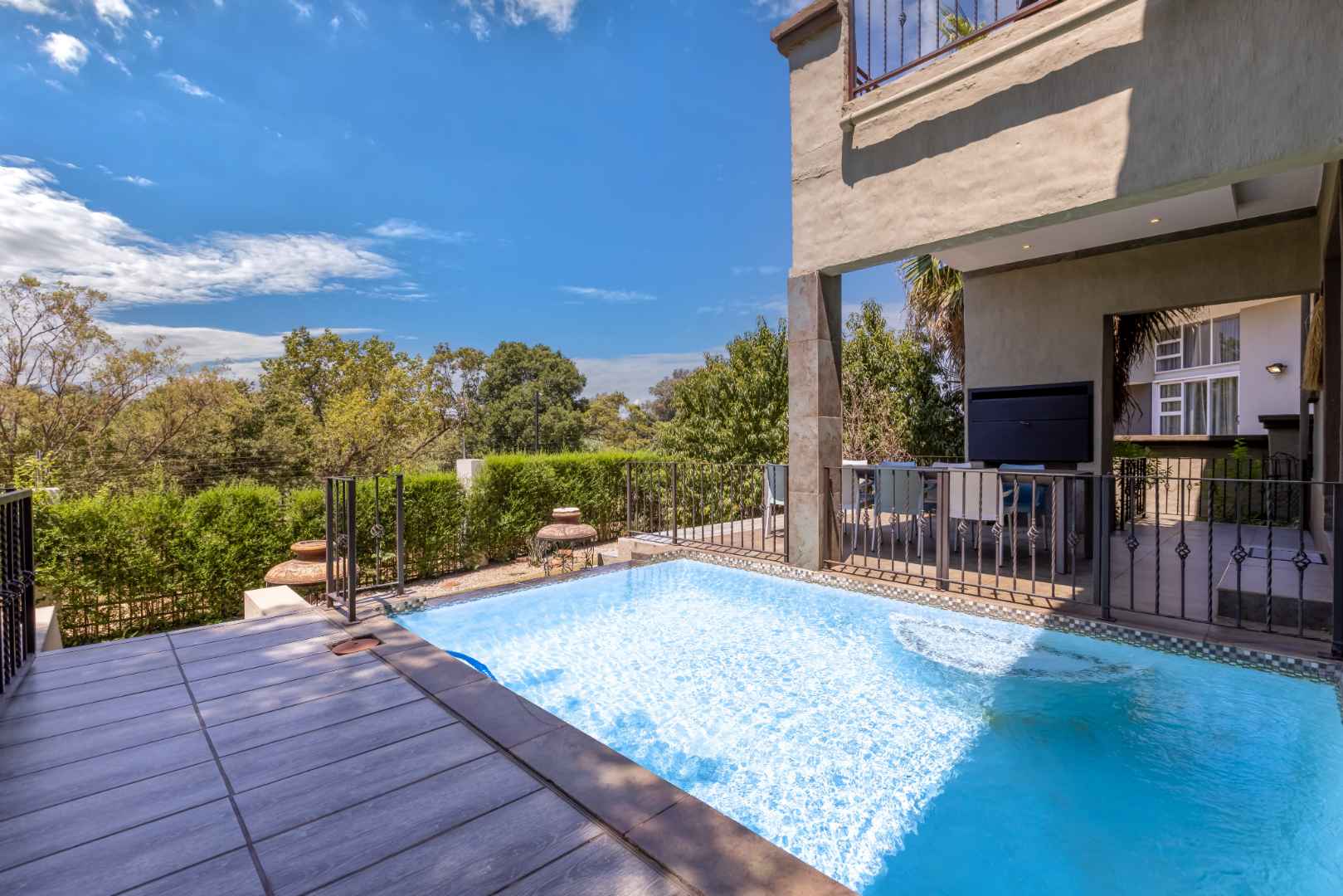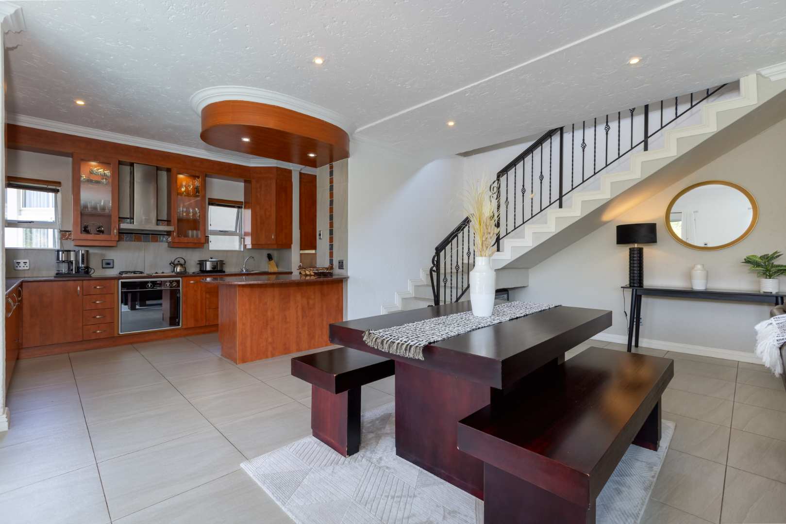 A warm and inviting entrance flows onto an open plan family lounge and dining area, seamlessly connecting to an open plan kitchen boasting granite countertops, a breakfast bar, electric and gas hob with oven and extractor fan, prep bowl, plumbed double door fridge space, separate scullery with under counter space for your appliances, plus ample built-in cupboards and display cabinets. A stunning covered patio with a built-in braai is elevated and overlooks the infinity swimming pool and manicured wrap around garden – an ideal space to entertain all year round. The guest cloakroom is neatly tucked away and completes the downstairs floor plan.