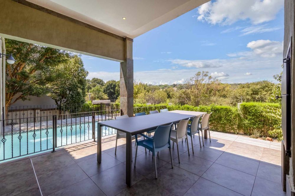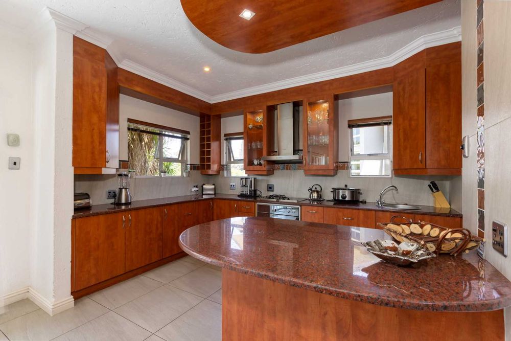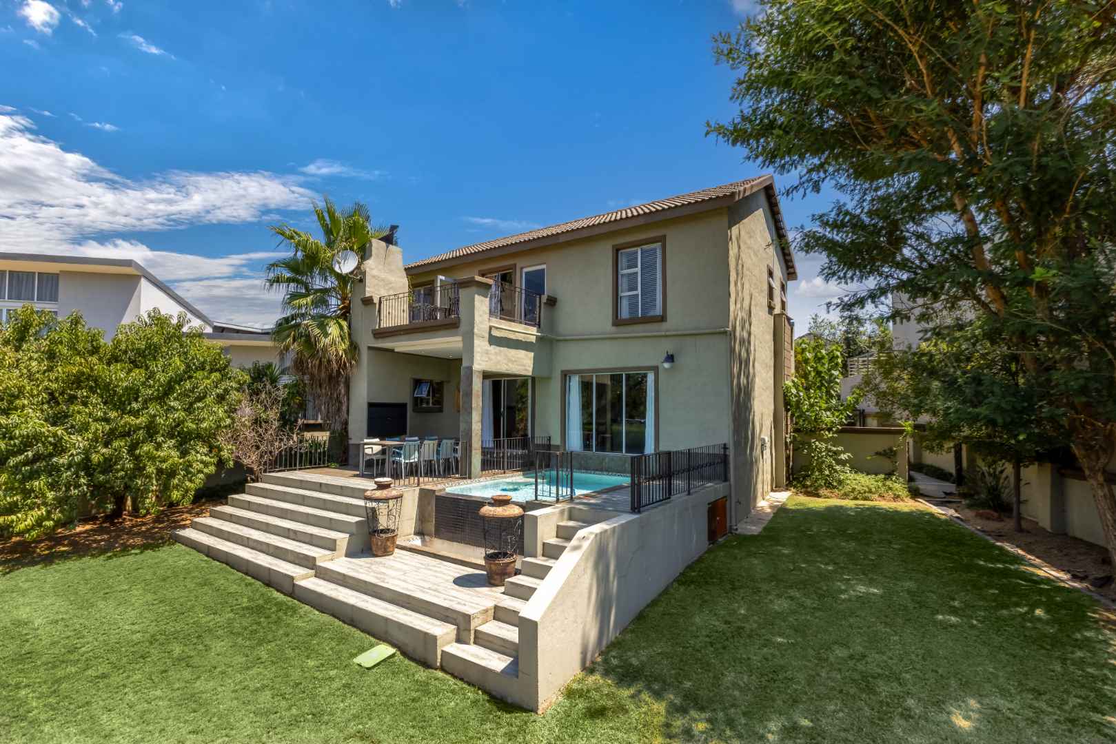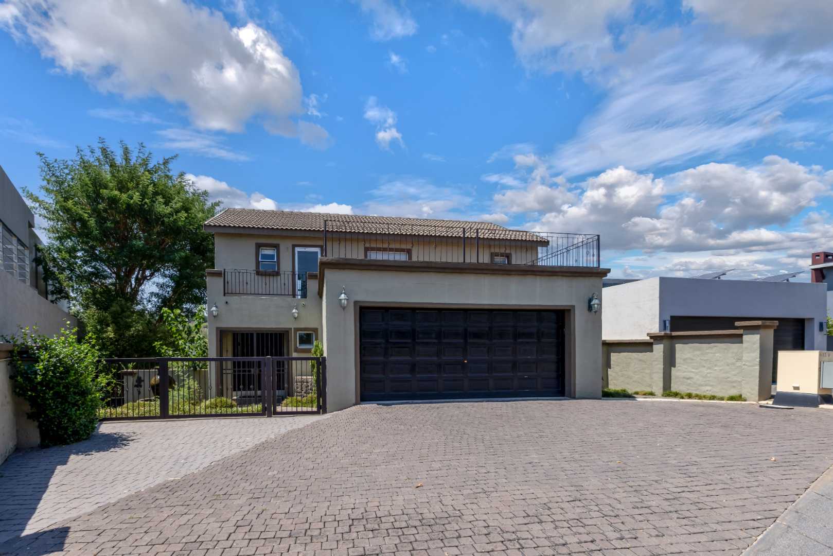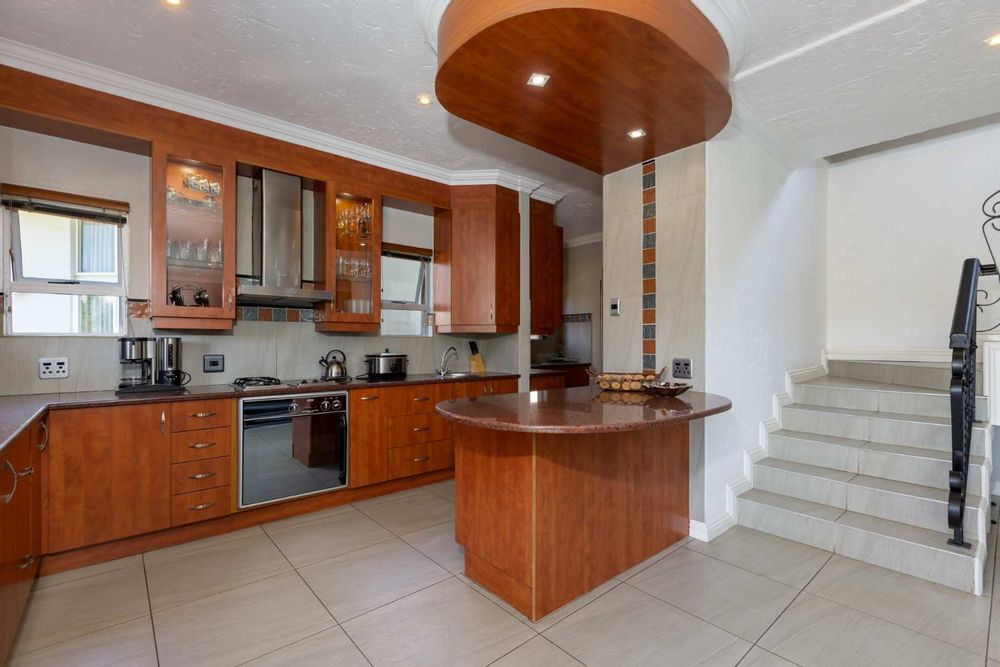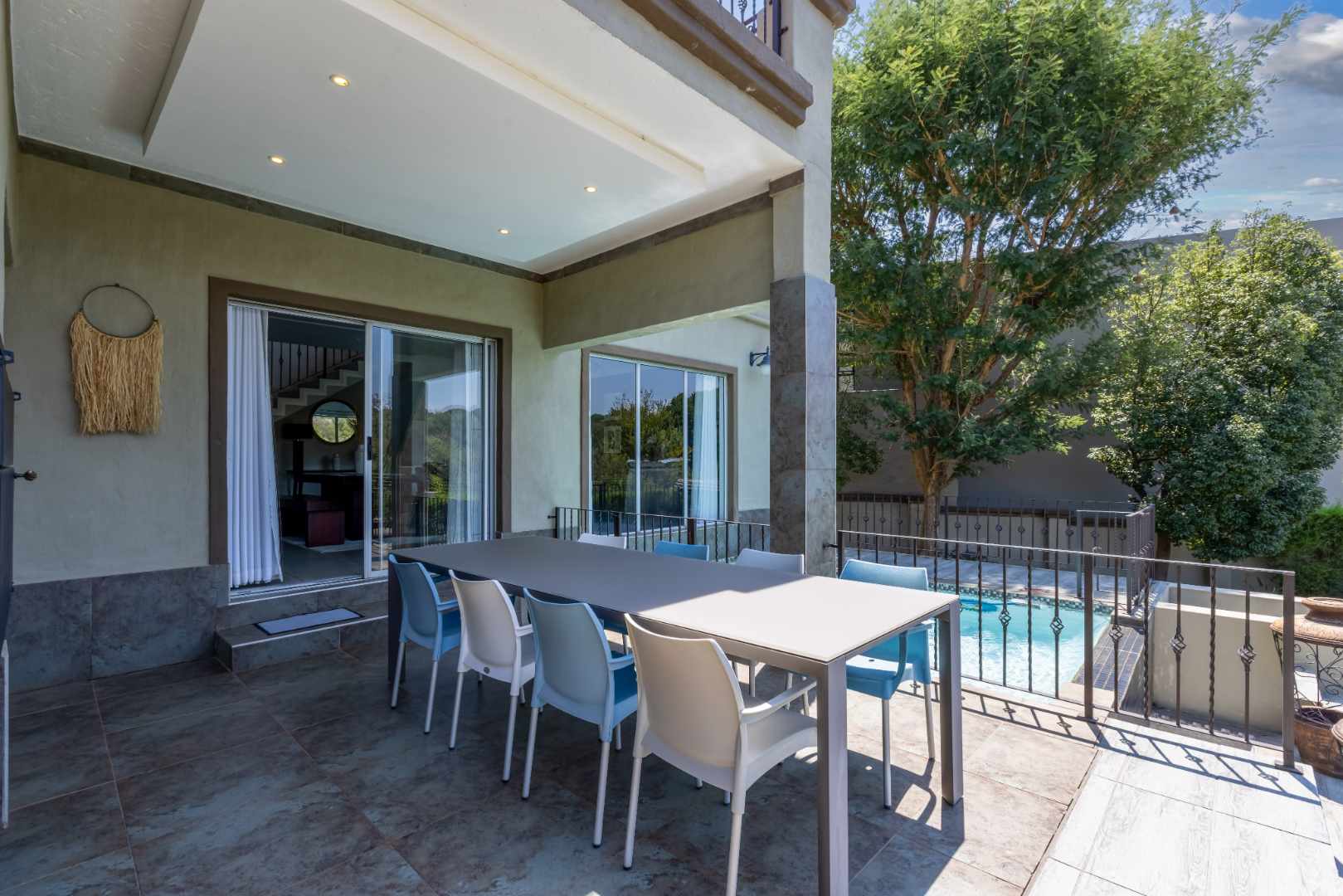 A warm and inviting entrance flows onto an open plan family lounge and dining area, seamlessly connecting to an open plan kitchen boasting granite countertops, a breakfast bar, electric and gas hob with oven and extractor fan, prep bowl, plumbed double door fridge space, separate scullery with under counter space for your appliances, plus ample built-in cupboards and display cabinets. A stunning covered patio with a built-in braai is elevated and overlooks the infinity swimming pool and manicured wrap around garden – an ideal space to entertain all year round. The guest cloakroom is neatly tucked away and completes the downstairs floor plan.