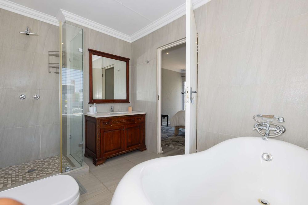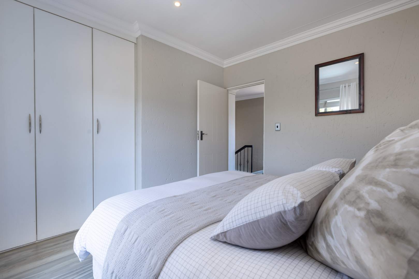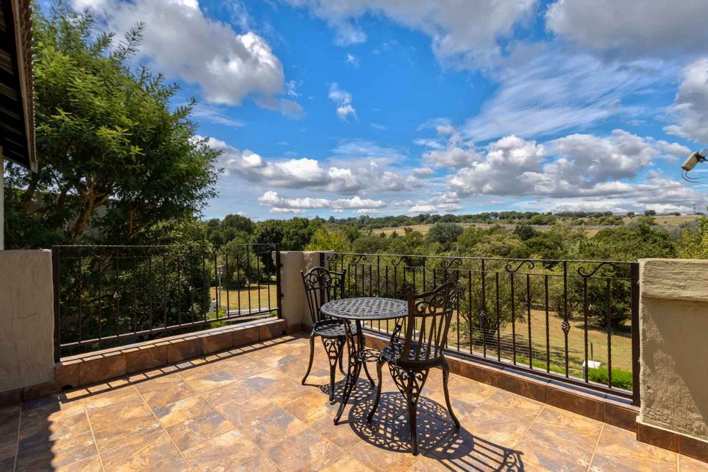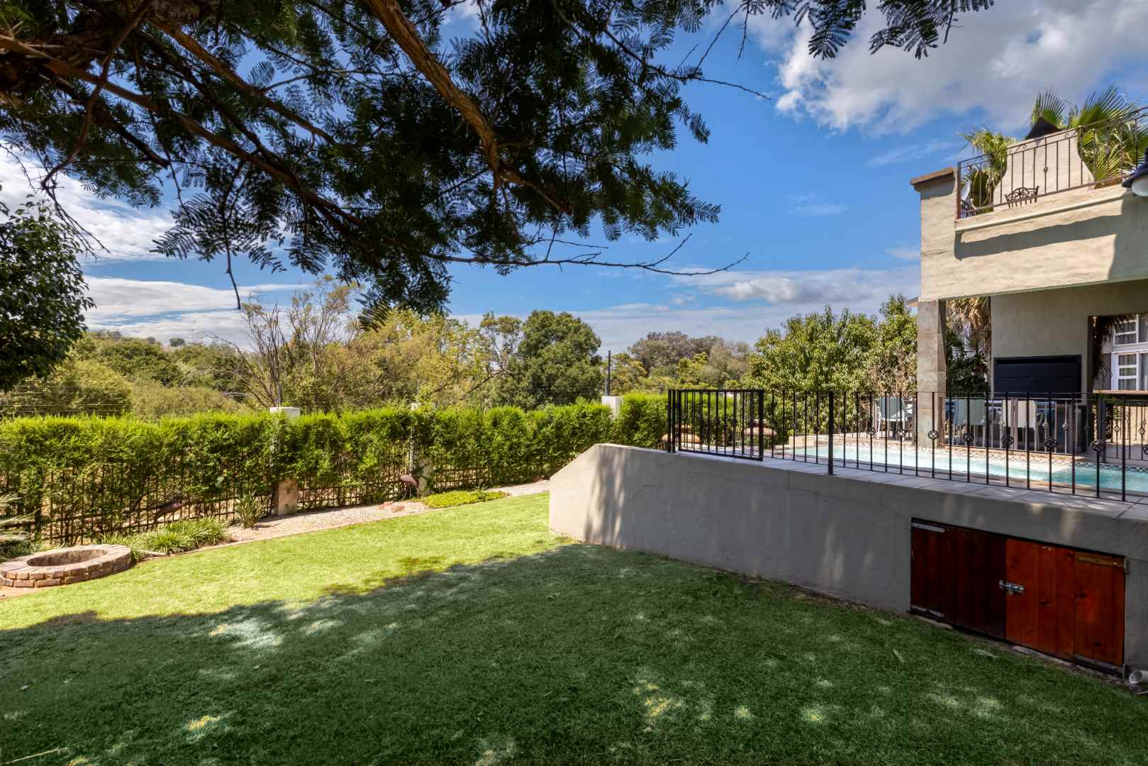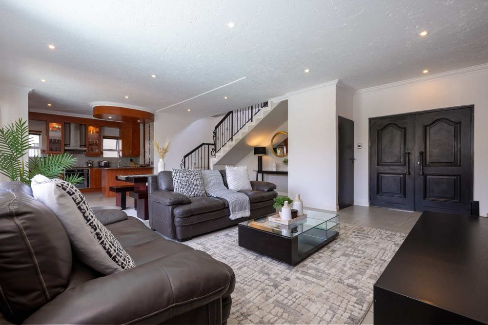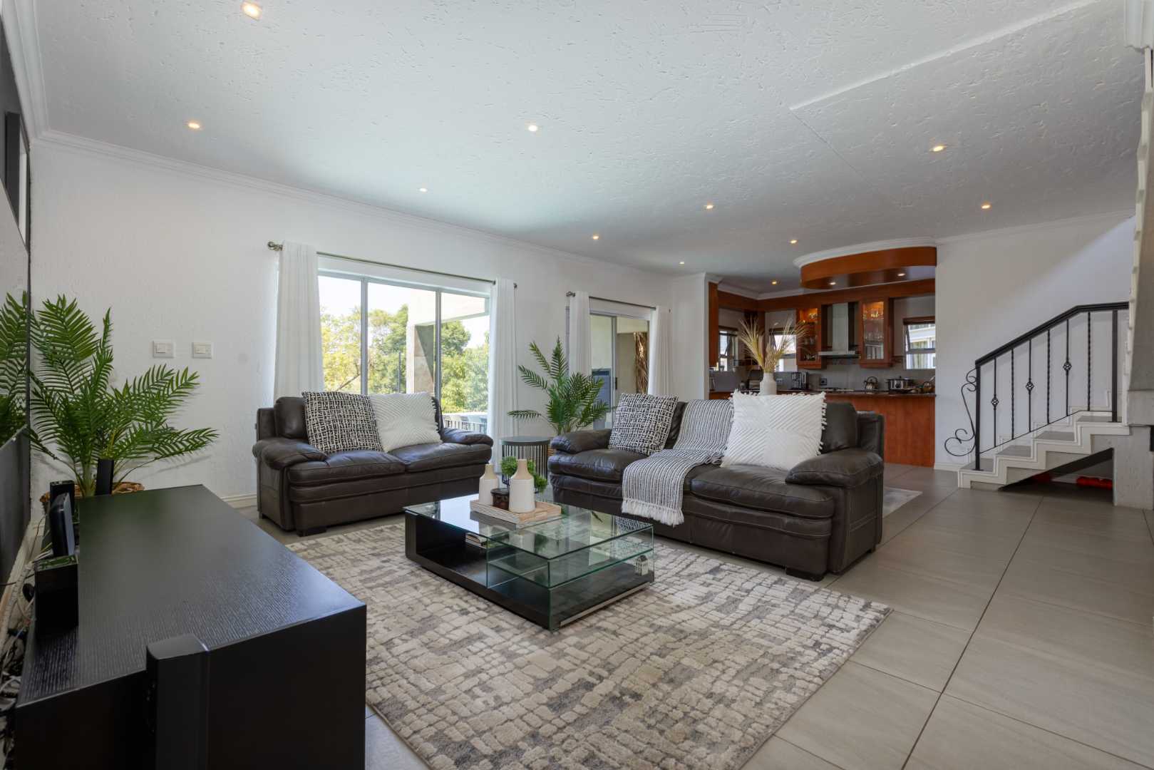 A warm and inviting entrance flows onto an open plan family lounge and dining area, seamlessly connecting to an open plan kitchen boasting granite countertops, a breakfast bar, electric and gas hob with oven and extractor fan, prep bowl, plumbed double door fridge space, separate scullery with under counter space for your appliances, plus ample built-in cupboards and display cabinets. A stunning covered patio with a built-in braai is elevated and overlooks the infinity swimming pool and manicured wrap around garden – an ideal space to entertain all year round. The guest cloakroom is neatly tucked away and completes the downstairs floor plan.