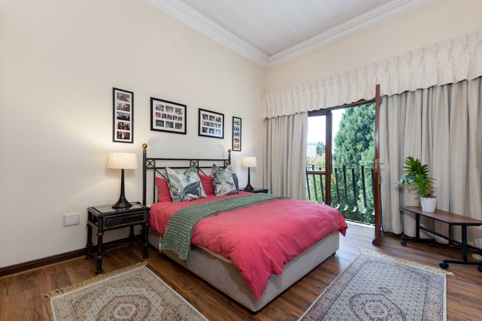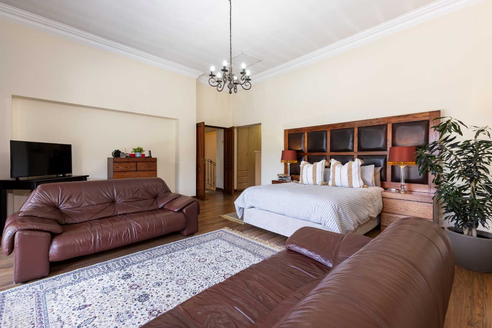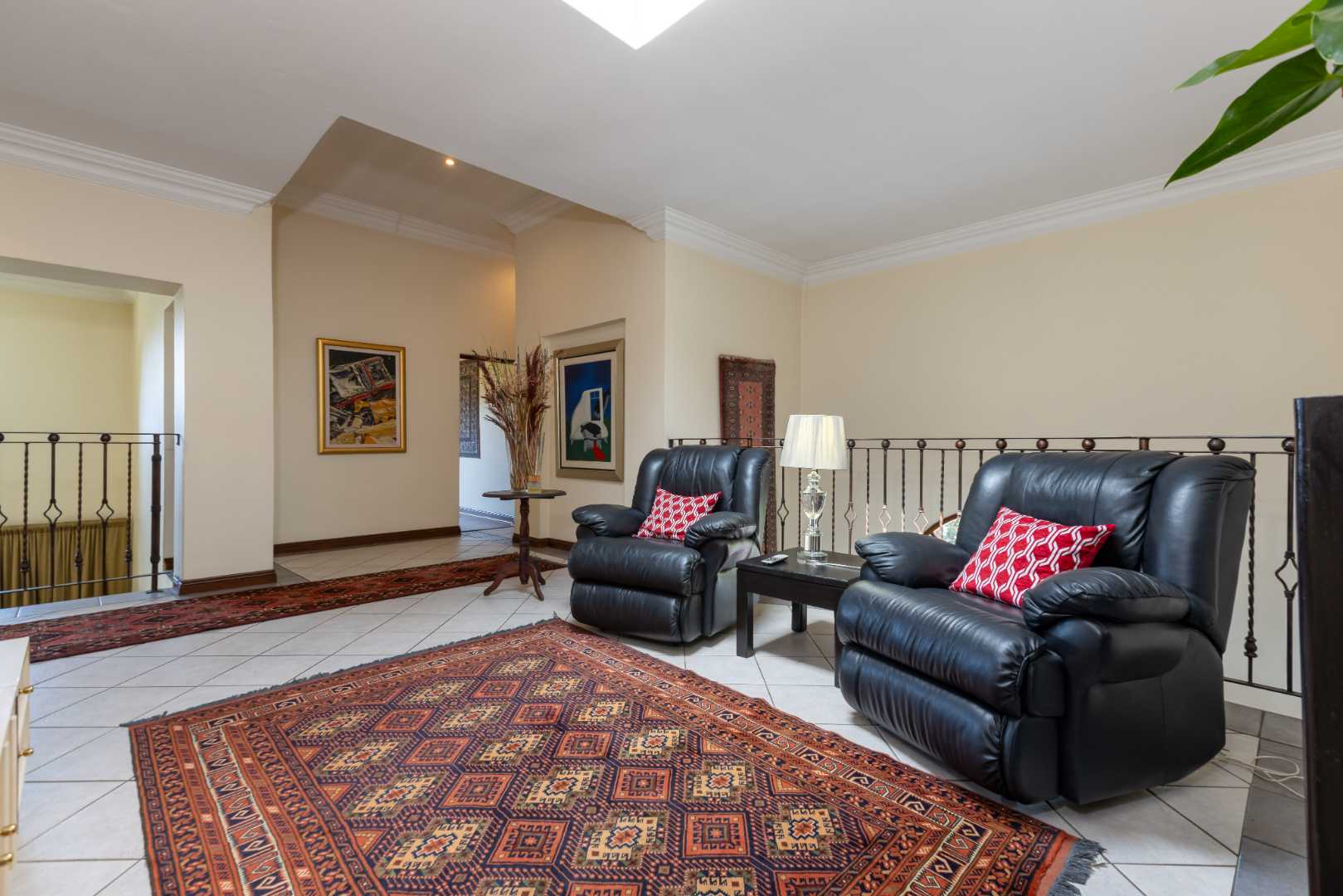 A grand home with flow being a key element, boasts soaring ceilings and elegant finishes. A magnificent entrance hall lures you to a formal lounge with triple volume ceilings with an eye-catching chandelier. This spills onto an entertainer’s patio offering the utmost privacy and a picturesque view of the sparkling blue swimming pool and pristine garden. A cosy family lounge is bathed in natural sunlight and opens onto a sun-dappled terrace. Spacious open plan kitchen with granite counter top's, a breakfast bar, gas hob and electric hob with an extractor fan, eye-level oven, separate scullery area with under counter space that can accommodate all your appliances, plus ample built-in cupboards. The dining area is adjacent to the kitchen and offers a classy space, ideal when entertaining family, friends and business associates. The floor plan downstairs is complete with a guest bathroom and under staircase storage space.