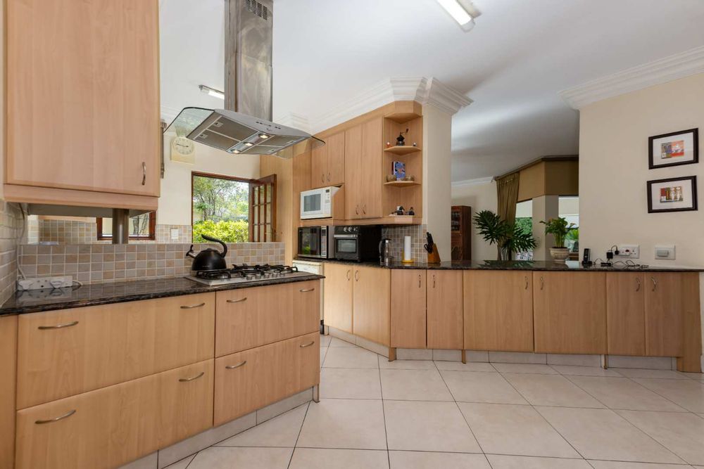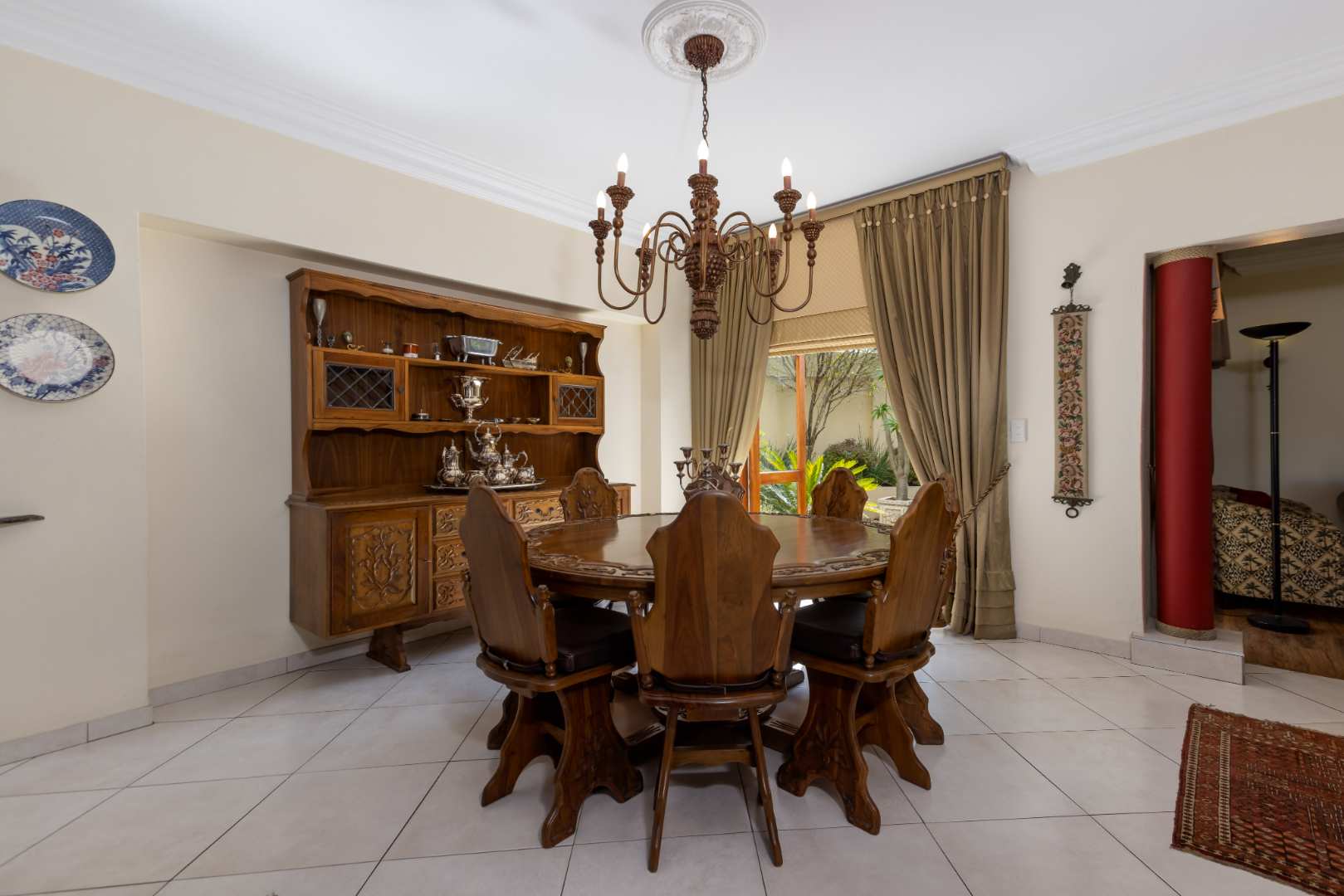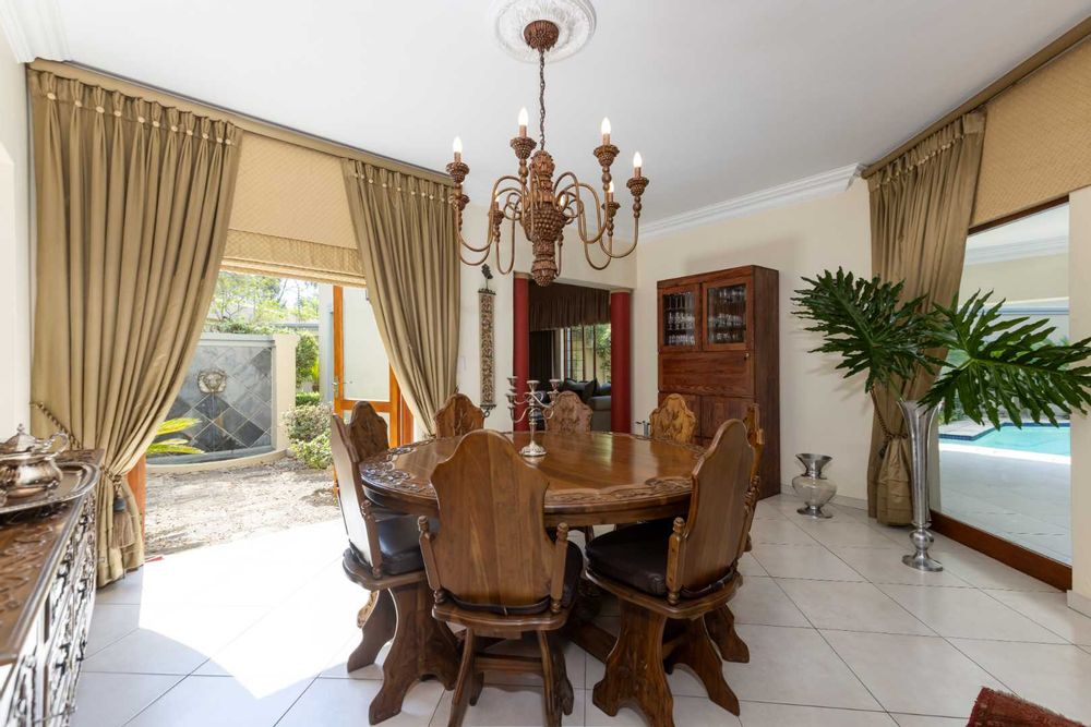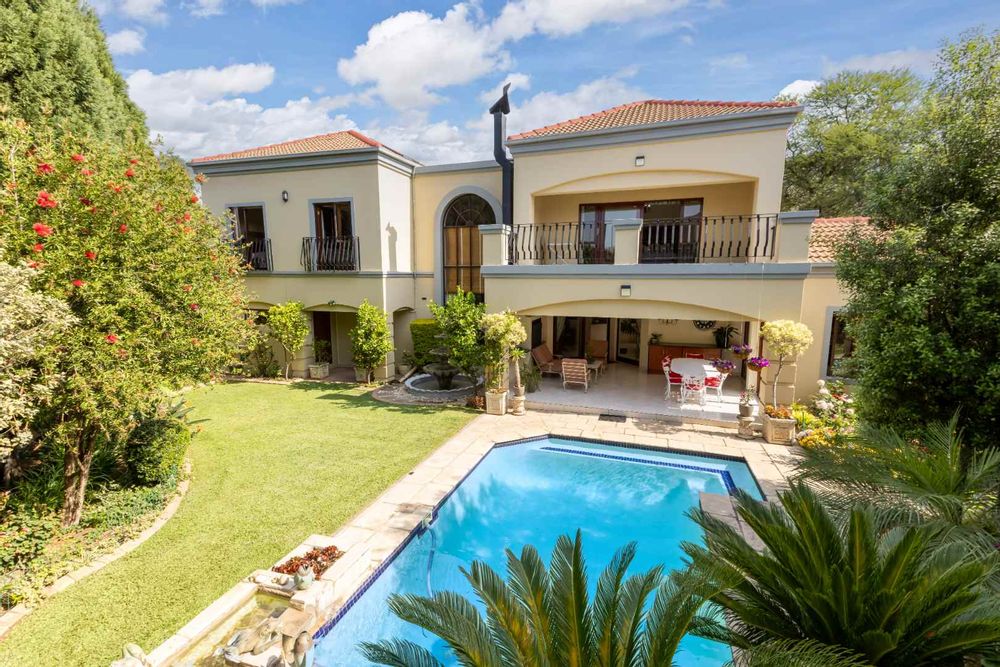 A grand home with flow being a key element, boasts soaring ceilings and elegant finishes. A magnificent entrance hall lures you to a formal lounge with triple volume ceilings with an eye-catching chandelier. This spills onto an entertainer’s patio offering the utmost privacy and a picturesque view of the sparkling blue swimming pool and pristine garden. A cosy family lounge is bathed in natural sunlight and opens onto a sun-dappled terrace. Spacious open plan kitchen with granite counter top's, a breakfast bar, gas hob and electric hob with an extractor fan, eye-level oven, separate scullery area with under counter space that can accommodate all your appliances, plus ample built-in cupboards. The dining area is adjacent to the kitchen and offers a classy space, ideal when entertaining family, friends and business associates. The floor plan downstairs is complete with a guest bathroom and under staircase storage space.