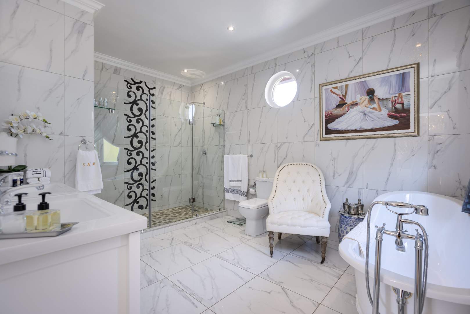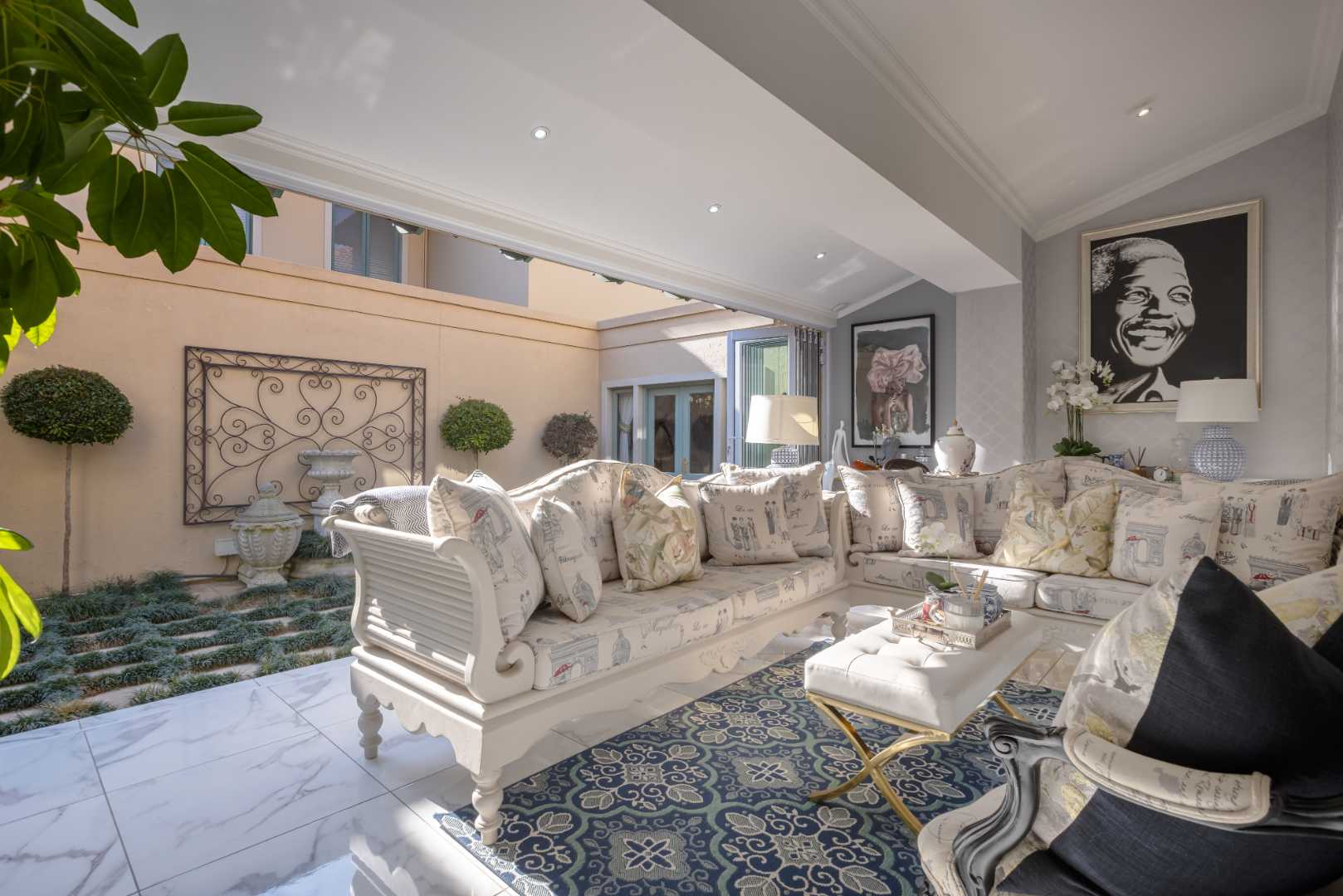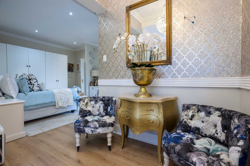 This exquisitely presented home will just simply blow you away, absolutely nothing to do but simply move-in. Alluring entrance hall flows onto a formal lounge with a bold feature wood burning fireplace and spills onto the manicured garden. A private quaint study is just off the formal lounge. An elegant open plan dining area with eye-catching dazzling chandelier leads out onto a picturesque courtyard area boasting the most exquisite Hydrangea flower beds with an array of pinks and greens. Enthralling enclosed entertainers patio opens up with stacking doors onto the garden and sparkling blue swimming pool. Awe-inspiring equipped state-of-the-art kitchen with imported marble counter tops, special handmade cabinetry, gas and electric hob with oven and extractor fan, breakfast bar and nook, coffee station, double door fridge space, separate scullery serves as an extension of the kitchen and can accommodate all your appliances. Guest cloakroom is neatly tucked away under the staircase which leads you to the upstairs level.