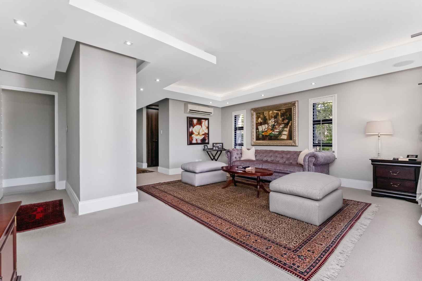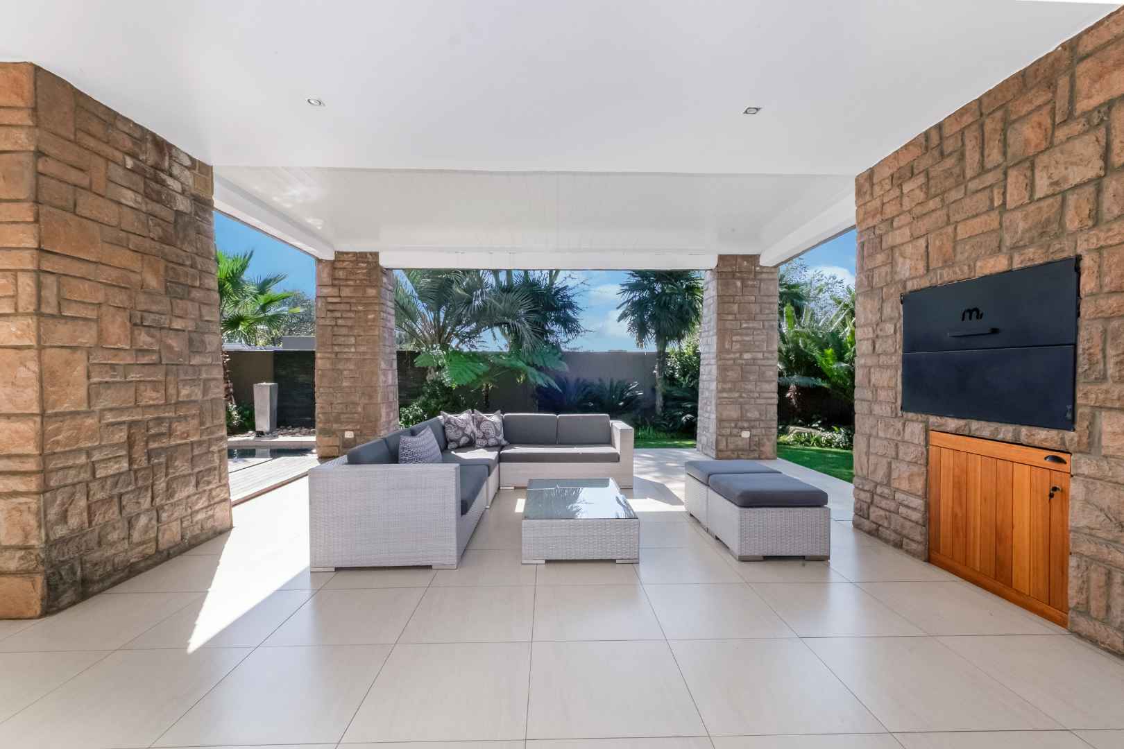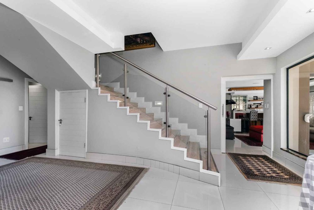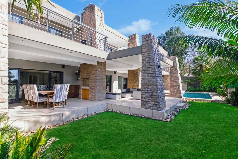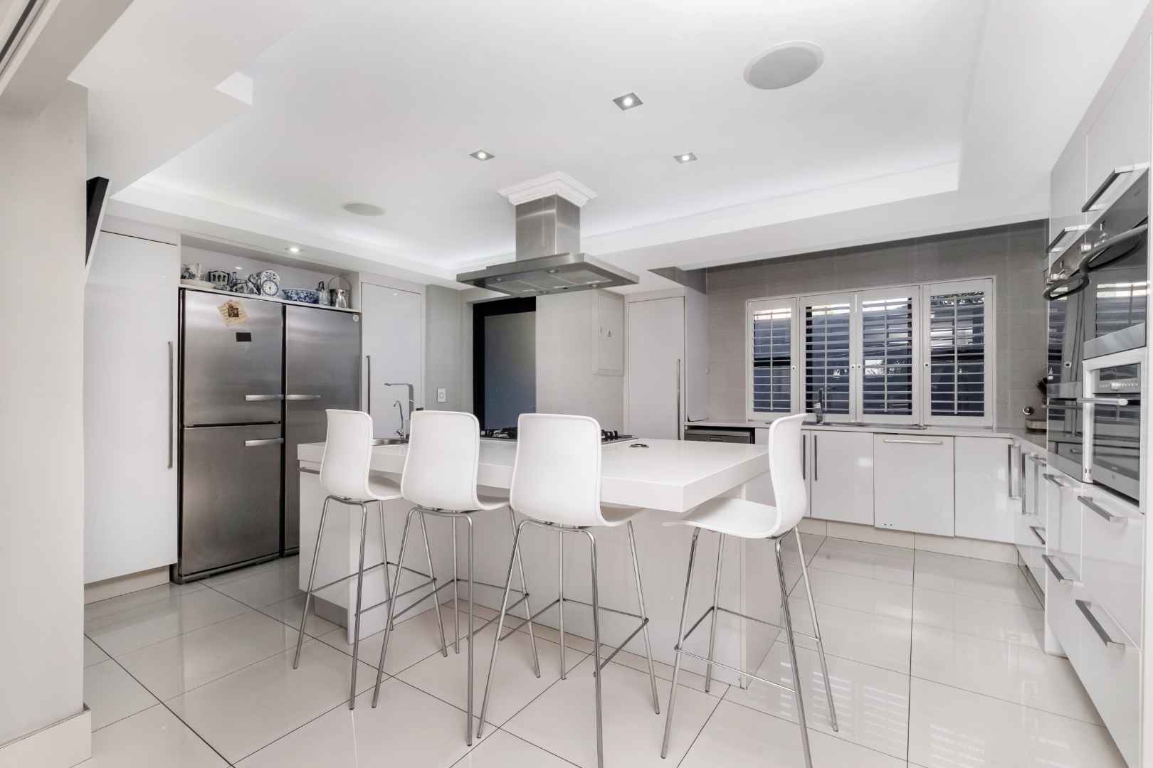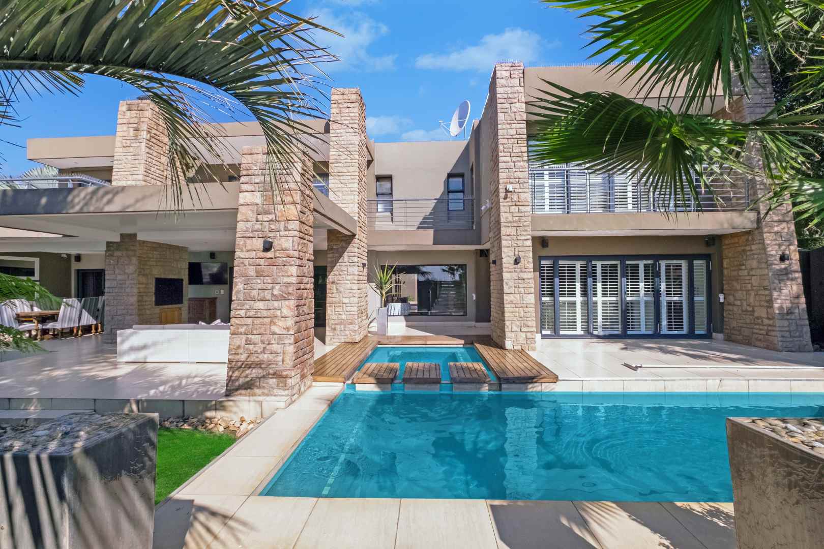 A gorgeous entrance boasting love and light flows onto 3 grand living spaces, all oozing with loads of natural rays of light and an indoor / outdoor living space feeling. This home is perfect for family living and entertaining. A open plan dining and lounge area with an eye-catching gas fireplace spills out with sliding doors onto the wrap around entertainers patio with a built-in braai boasting a pretty outlook of the manicured irrigated garden and sparkling decked swimming pool - creating a beautiful ambiance for your evening dinners. Entertainers Lounge and fitted pub is an ideal cigar lounge setup, boasting rich finishes, ambient lighting, and a premium bar. Designed for comfort and sophistication, it offers the perfect retreat for connoisseurs and casual guests alike.. Whether for private events, quiet indulgence, or lively social gatherings, this space delivers timeless elegance and an unforgettable atmosphere. Awe-inspiring open concept kitchen boasts Caesarstone countertops, MIELE gas hob with electric eye-level ovens and extractor fan, convection microwave, double door fridge space, prep-bowl, a separate laundry with under counter space for 3 appliances, a pantry cupboard, breakfast bar/centre island, plus ample built-in soft touch cupboard space. The downstairs floor plan is complete with a guest suite with an en-suite bathroom spilling into a private open patio, a private study, under staircase storage space and a guest cloakroom.