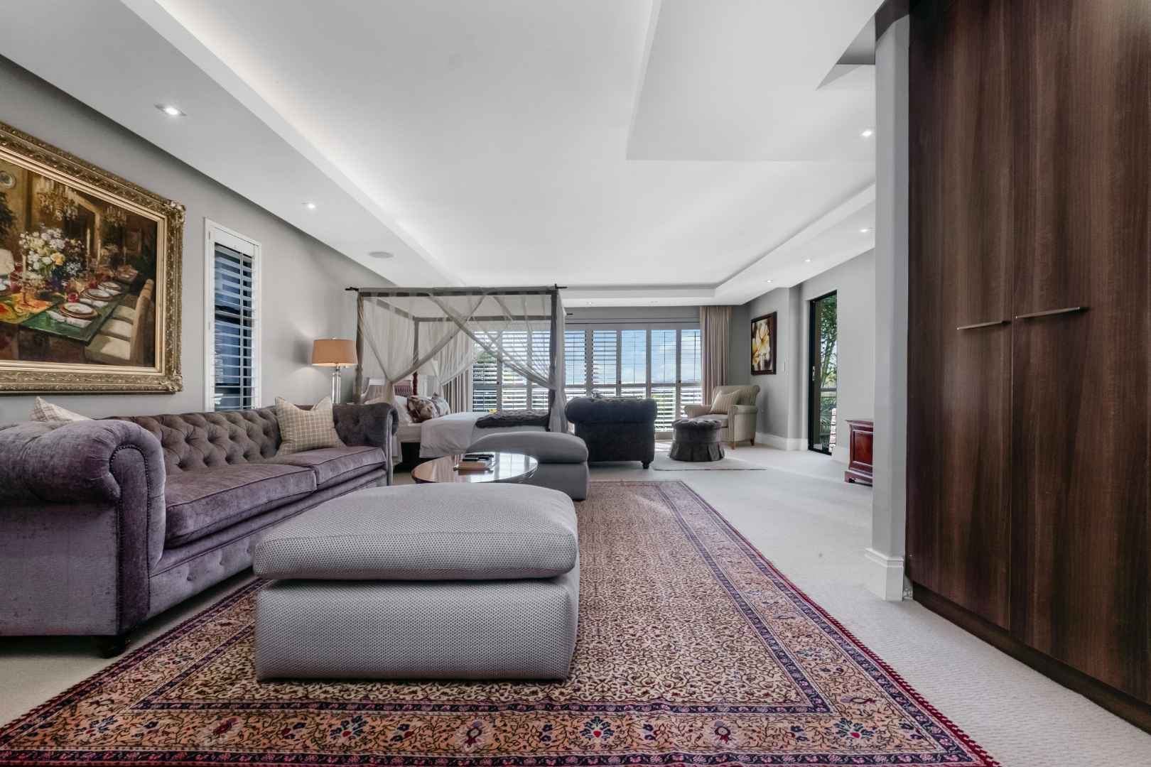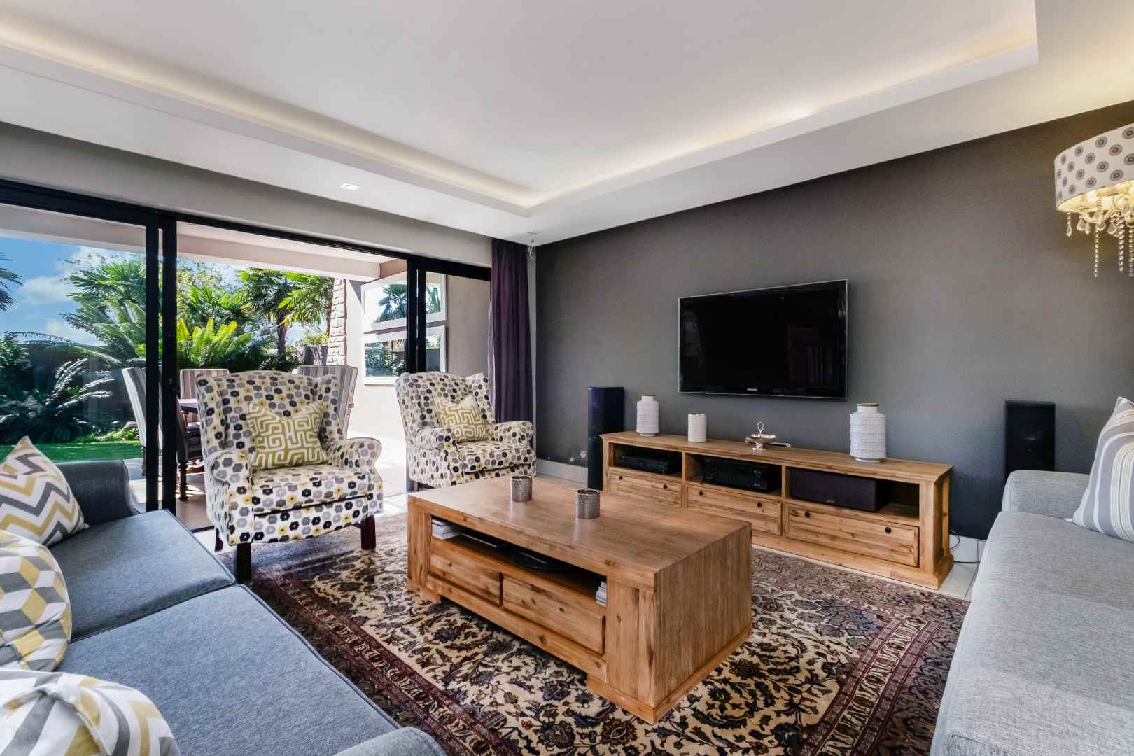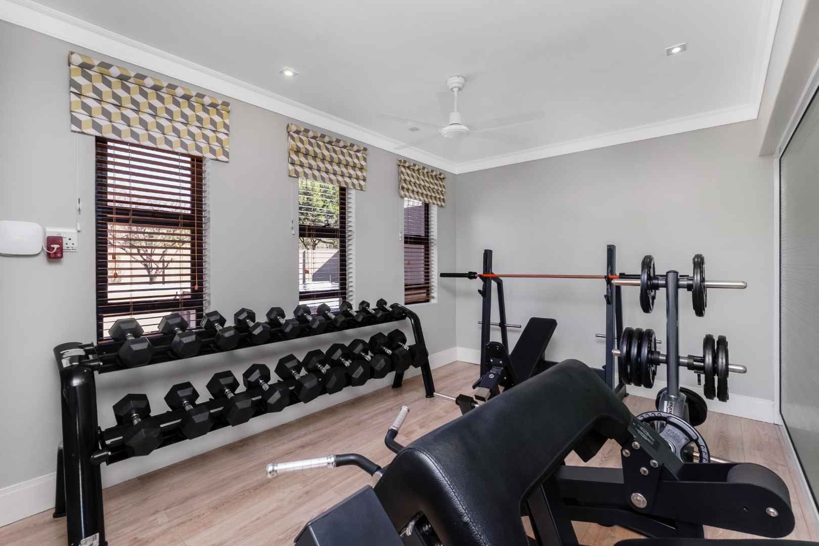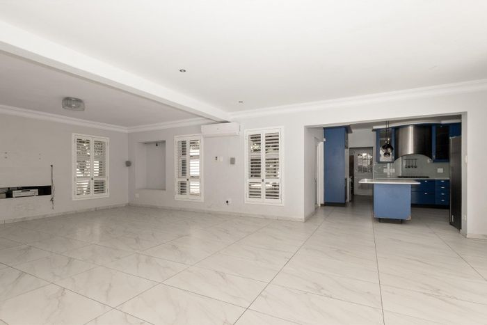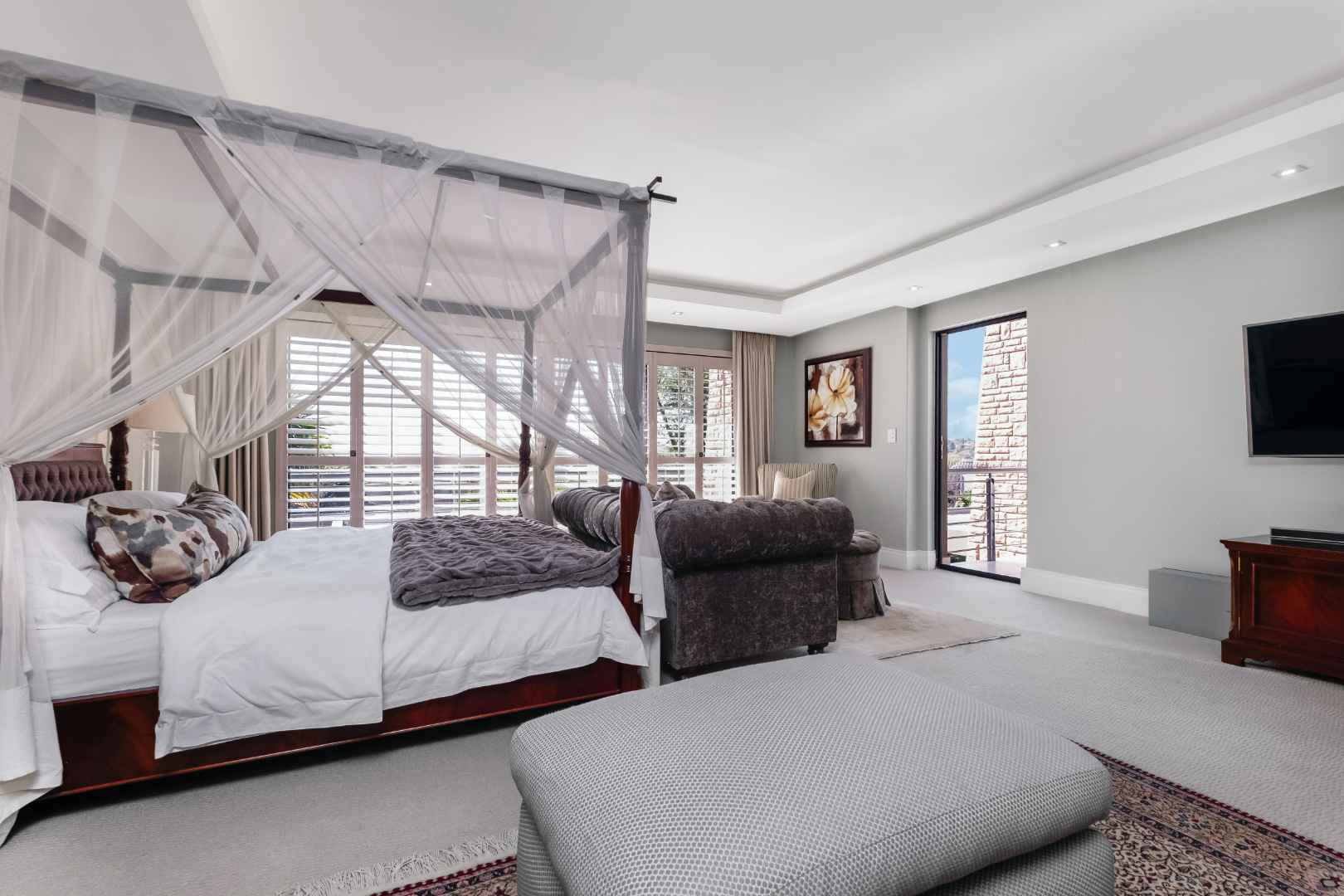 A gorgeous entrance boasting love and light flows onto 3 grand living spaces, all oozing with loads of natural rays of light and an indoor / outdoor living space feeling. This home is perfect for family living and entertaining. A open plan dining and lounge area with an eye-catching gas fireplace spills out with sliding doors onto the wrap around entertainers patio with a built-in braai boasting a pretty outlook of the manicured irrigated garden and sparkling decked swimming pool - creating a beautiful ambiance for your evening dinners. Entertainers Lounge and fitted pub is an ideal cigar lounge setup, boasting rich finishes, ambient lighting, and a premium bar. Designed for comfort and sophistication, it offers the perfect retreat for connoisseurs and casual guests alike.. Whether for private events, quiet indulgence, or lively social gatherings, this space delivers timeless elegance and an unforgettable atmosphere. Awe-inspiring open concept kitchen boasts Caesarstone countertops, MIELE gas hob with electric eye-level ovens and extractor fan, convection microwave, double door fridge space, prep-bowl, a separate laundry with under counter space for 3 appliances, a pantry cupboard, breakfast bar/centre island, plus ample built-in soft touch cupboard space. The downstairs floor plan is complete with a guest suite with an en-suite bathroom spilling into a private open patio, a private study, under staircase storage space and a guest cloakroom.