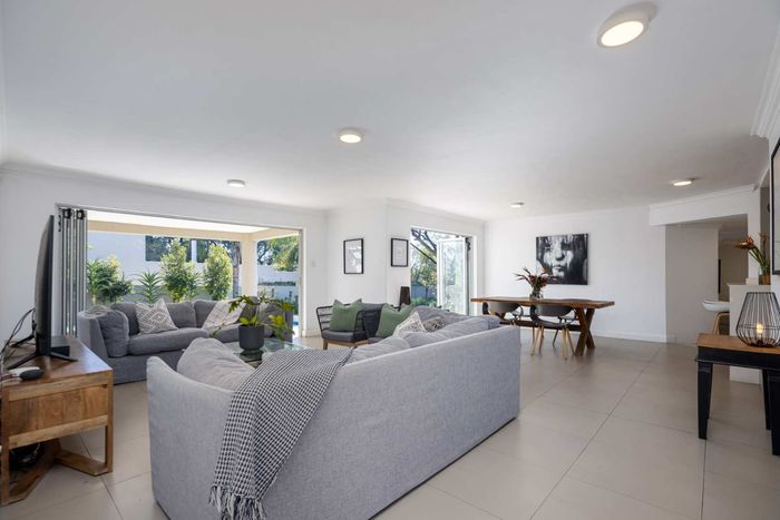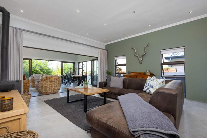 Light-filled, relaxed family living in Waterfall Country Village Estate with open-plan flow and enclosed patio overlooking a tree-lined manicured garden; includes guest suite and double automated garage.