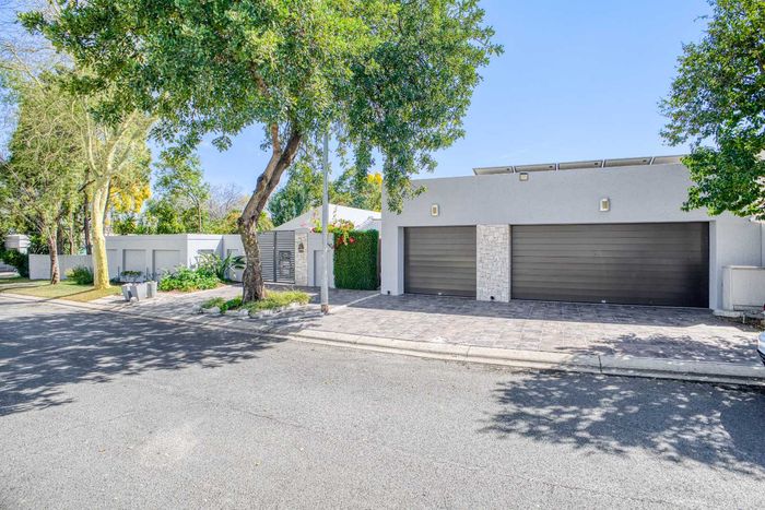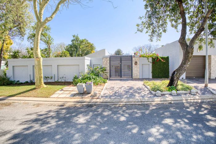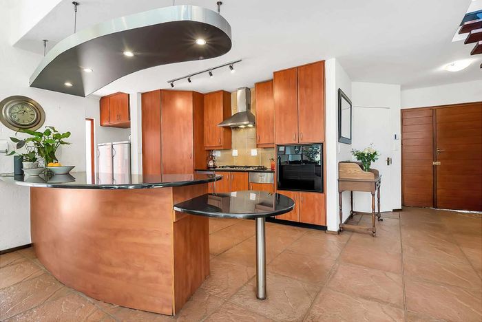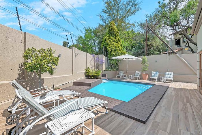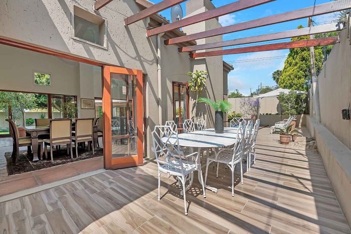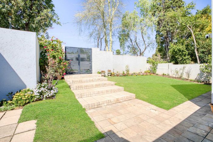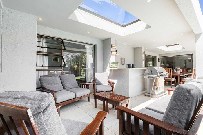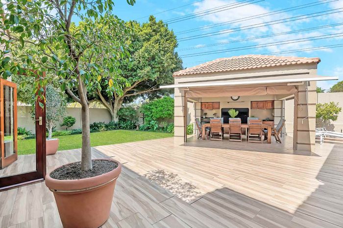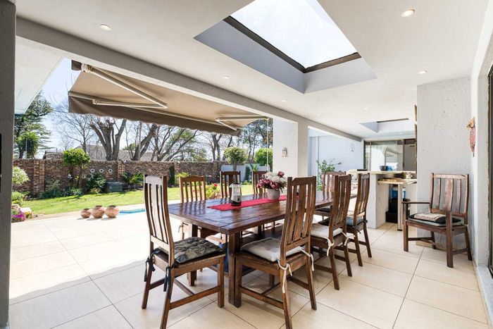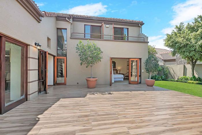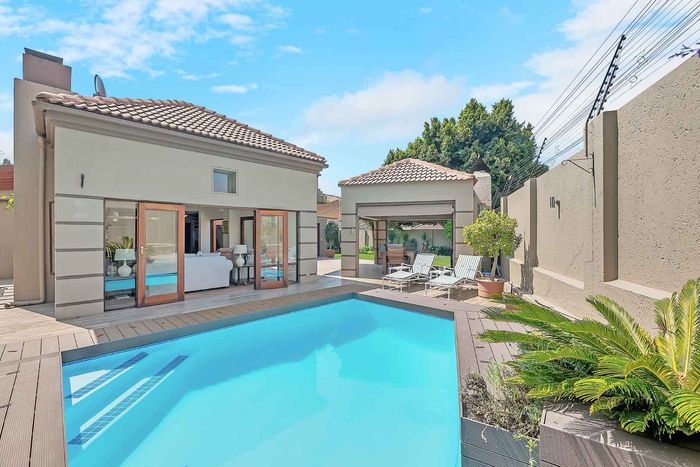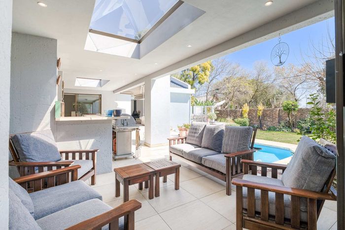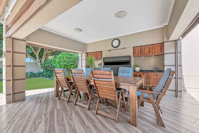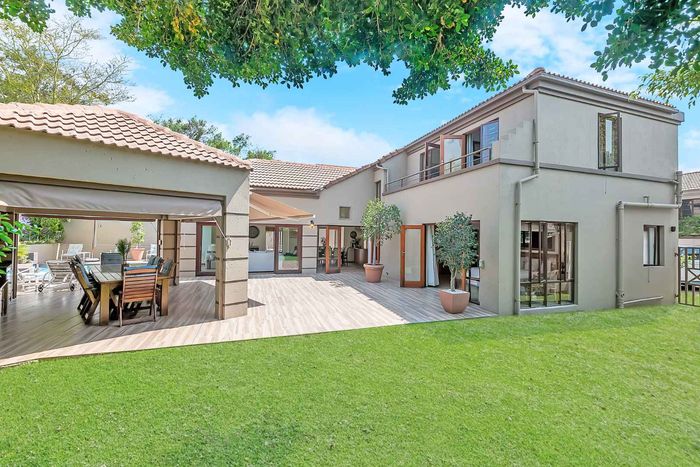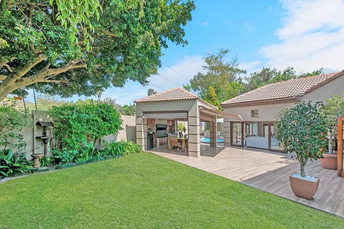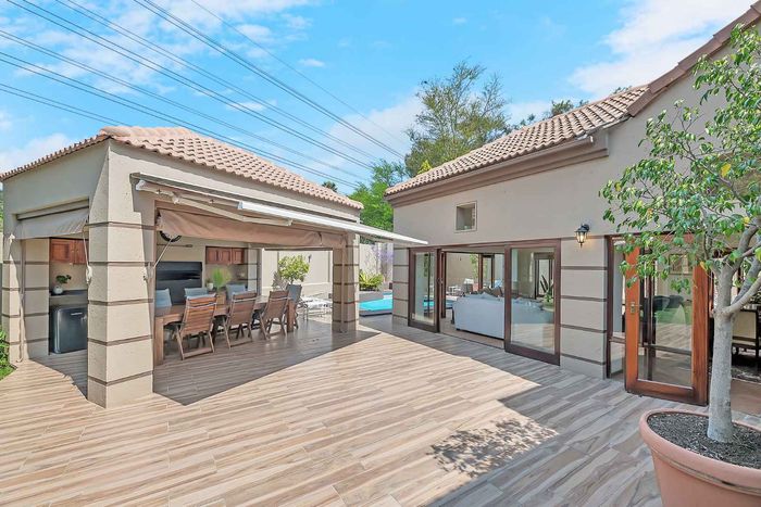 Entertainer's north-facing retreat in sociable Fourways Gardens — large garden, covered patio with bar and pool, dream kitchen, study with garden views, solar backup and 3 garages.