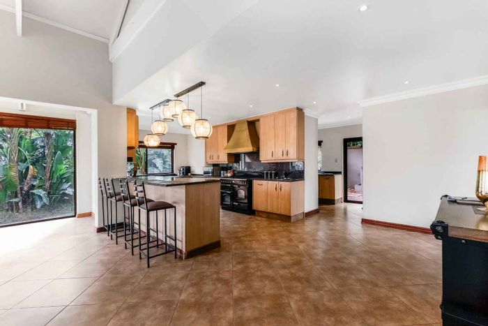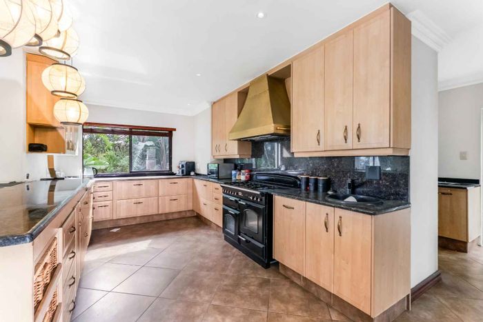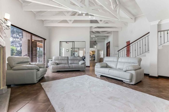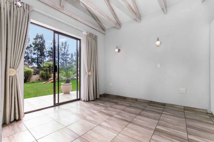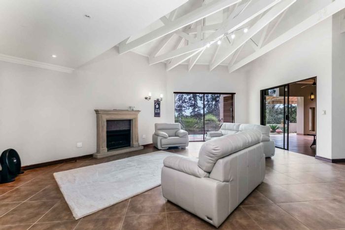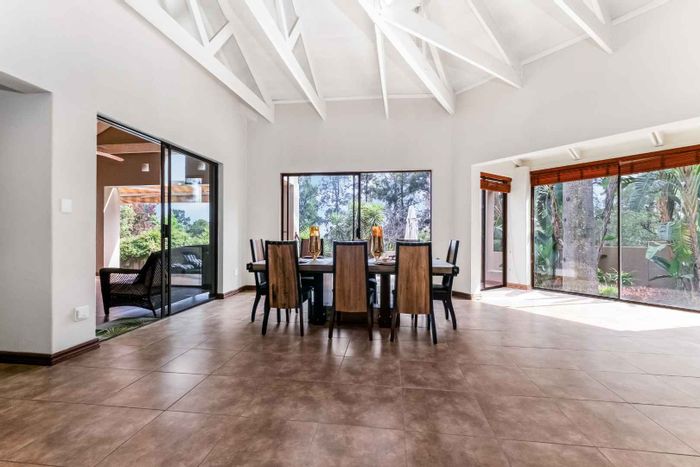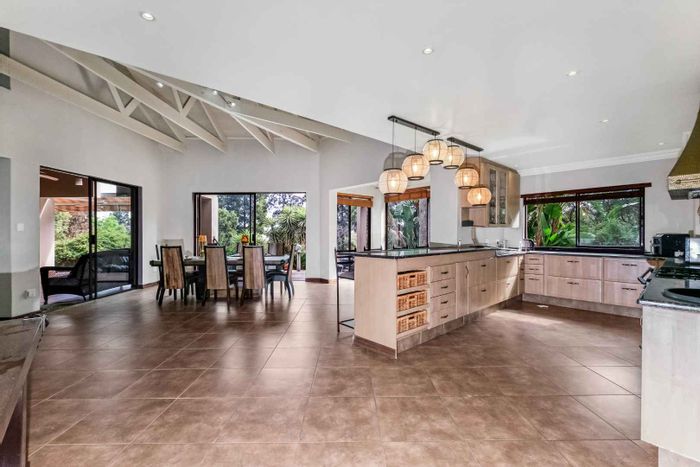 Entertainer's oasis in leafy Dainfern Golf Estate with rim-flow pool, Koi pond and expansive covered patio; chef's country kitchen, exposed roof trusses, self-contained flatlet. 4 beds, 4.5 baths, 2 garages.