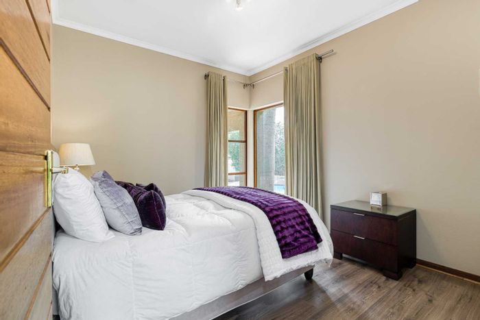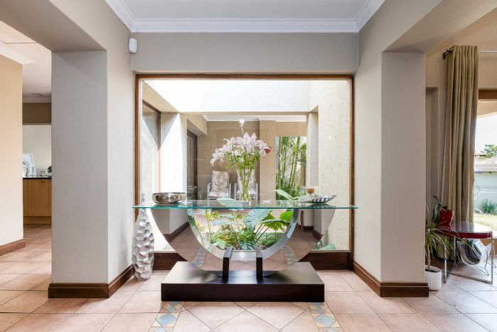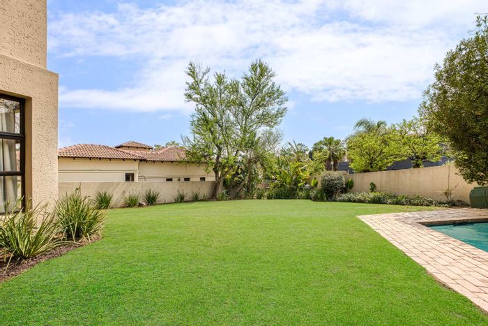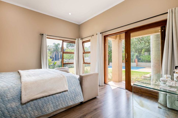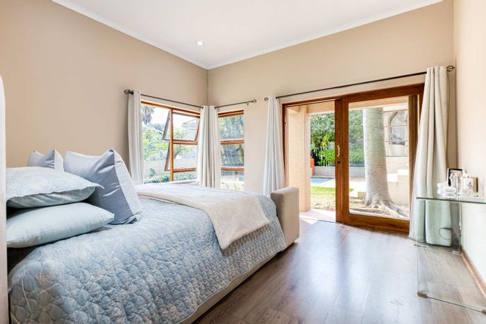 Resort-style entertaining on a private greenbelt in Dainfern Valley, with expansive garden and infinity-edge pool; open-plan kitchen, pyjama lounge, four bedrooms, 3.5 baths and double garage.