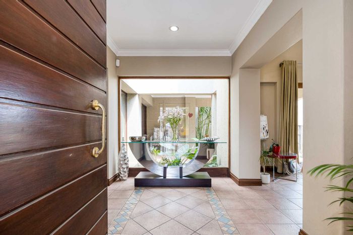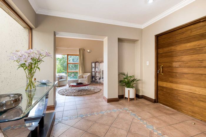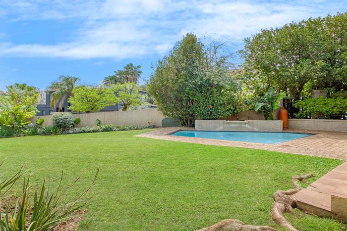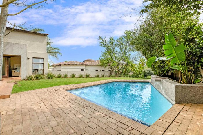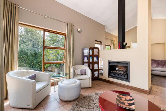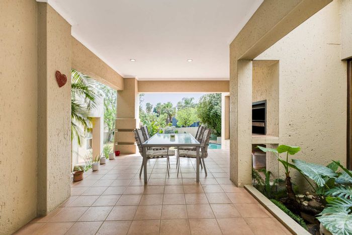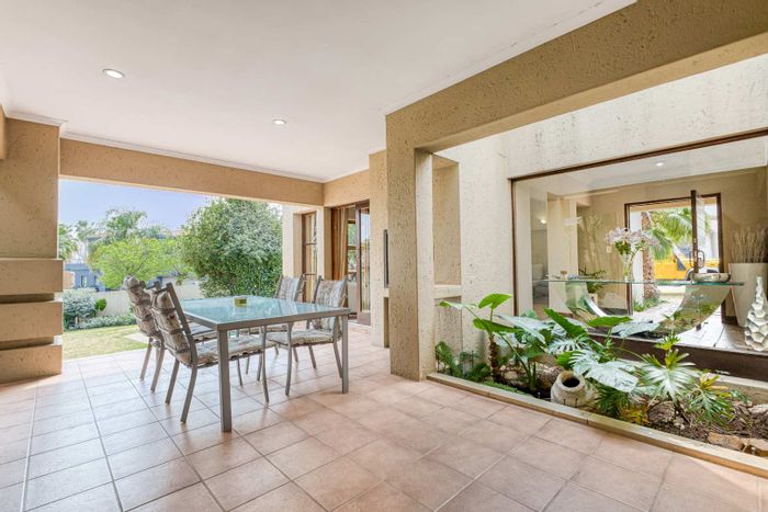 Single-level lifestyle living in Dainfern Ridge Estate, with a sunlit atrium, double-sided gas fireplace, private garden and pool, covered patio with wood/charcoal braai — 3 beds, 2.5 baths, double garage.