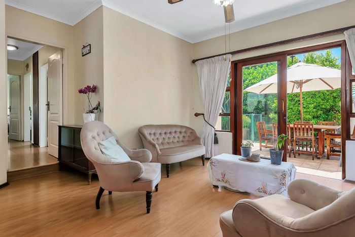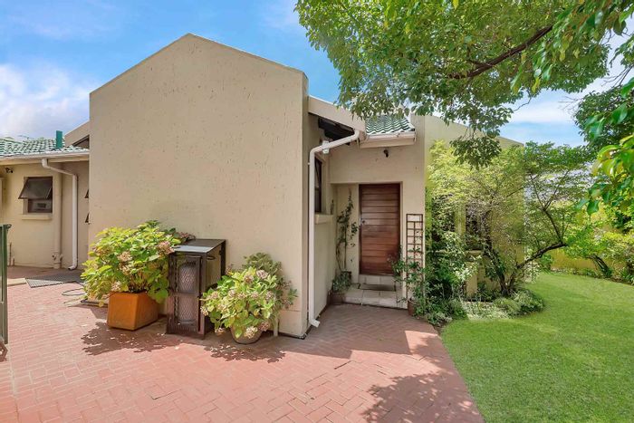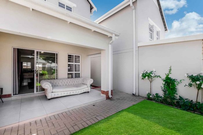 Relaxed indoor-outdoor living in exclusive Stonefields Estate, Fourways — covered patio overlooking a landscaped garden perfect for entertaining. Three bedrooms, two baths and single garage.