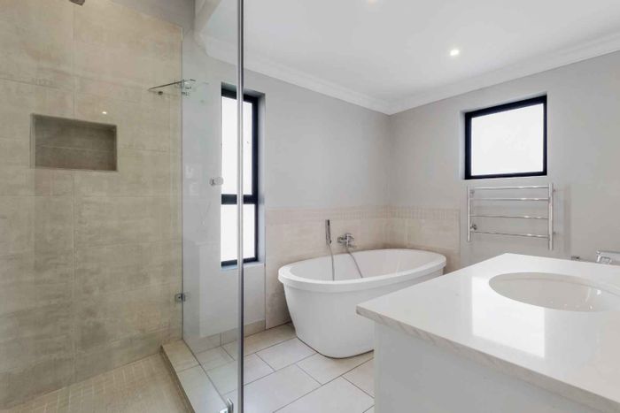Entertainer’s dream in Helderfontein lifestyle estate: gourmet kitchen, covered indoor/outdoor patio, modern bar and landscaped garden. Five en-suite bedrooms, master with walk-through dresser and balcony, four garages.