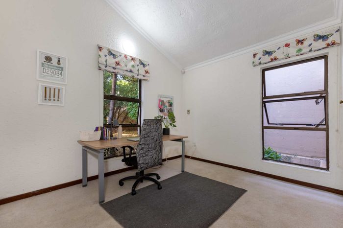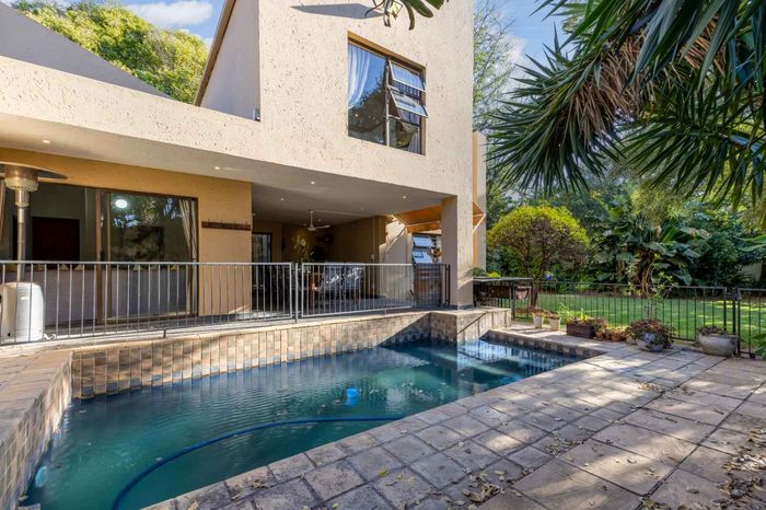 Relaxed family living amid Fernridge Estate’s leafy trails and Dainfern Square convenience; covered patio with wood-built braai and pool, four bedrooms with en-suite bathrooms and double garage.