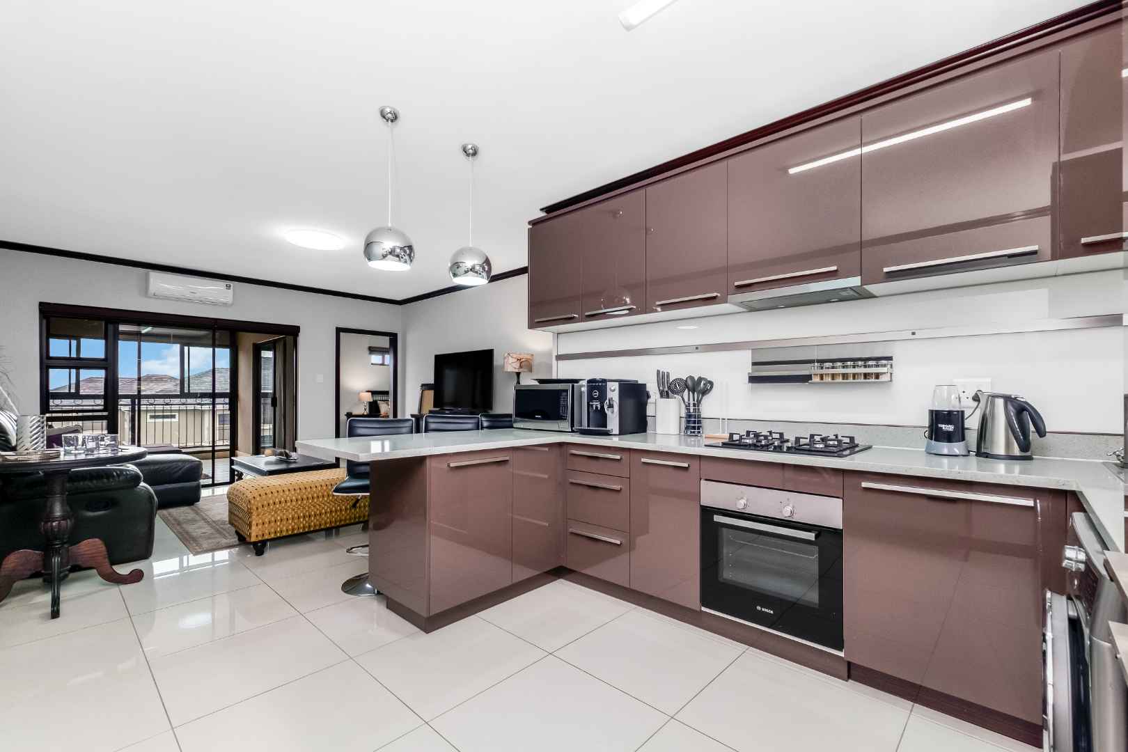 The modern open-plan kitchen is beautifully finished with Caesarstone countertops, a gas hob, breakfast bar, and integrated fridge and dishwasher, offering both functionality and sleek design.