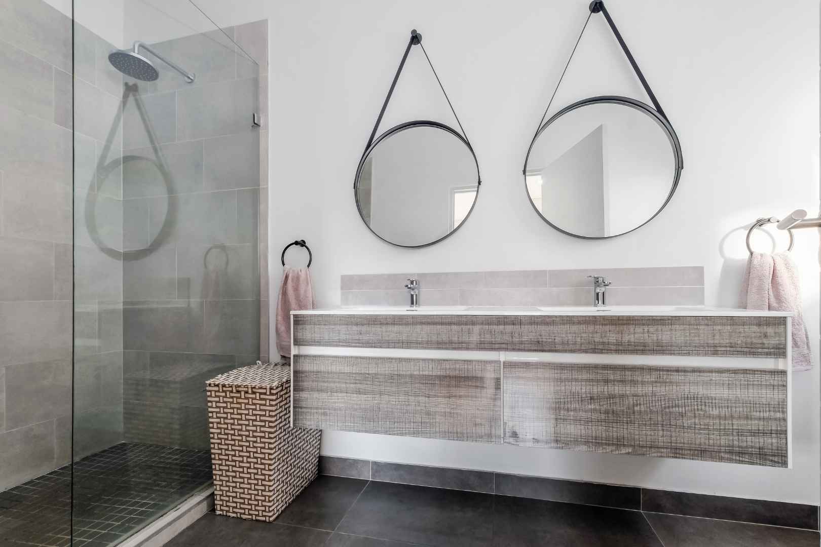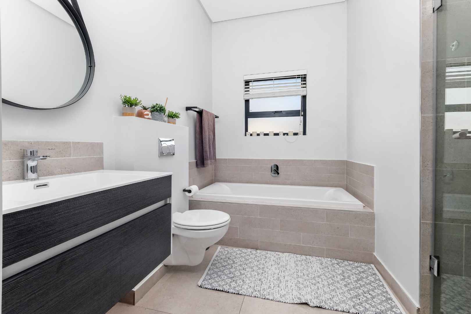 Upstairs, you’ll find three light and airy bedrooms and two contemporary bathrooms both serviced by gas geysers. The master suite features an ensuite with a large shower and double vanity while the remaining bedrooms share a full bathroom with both a tub and shower.