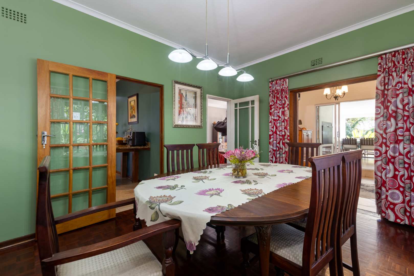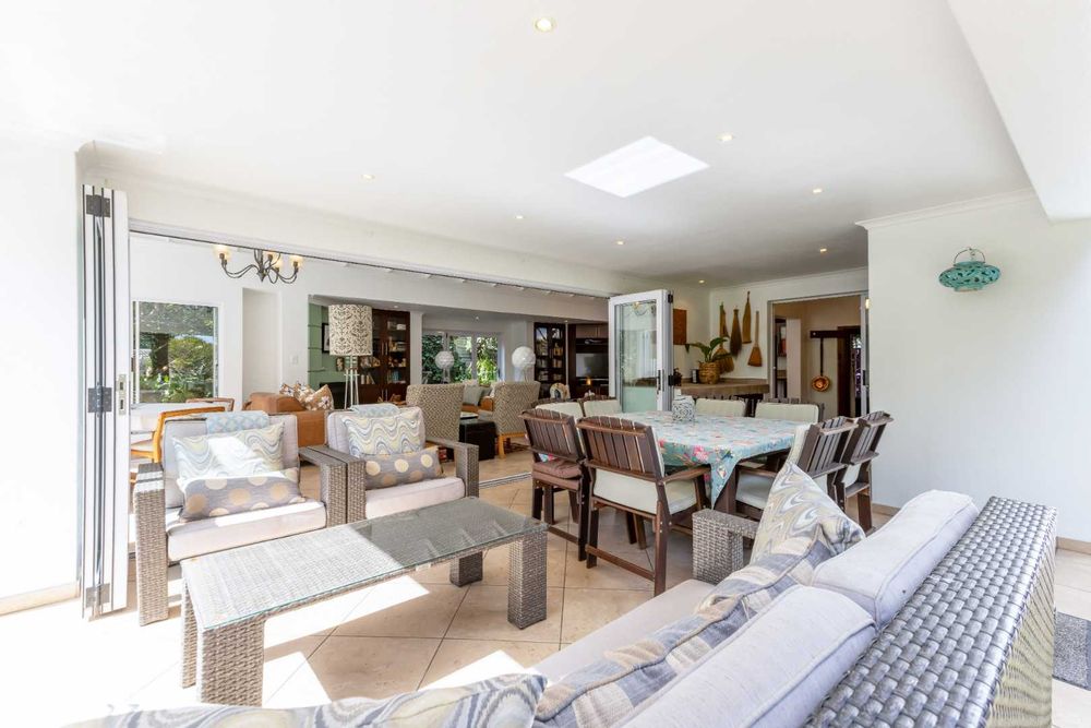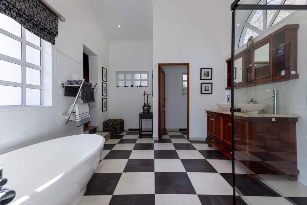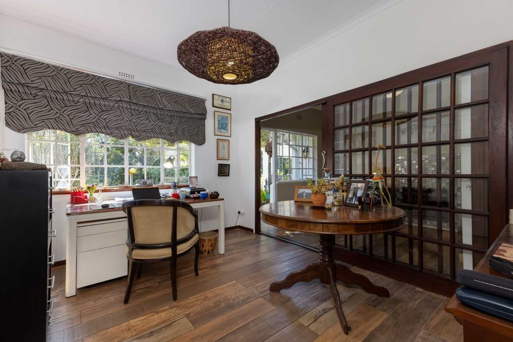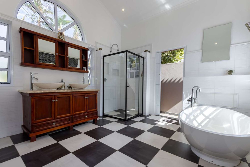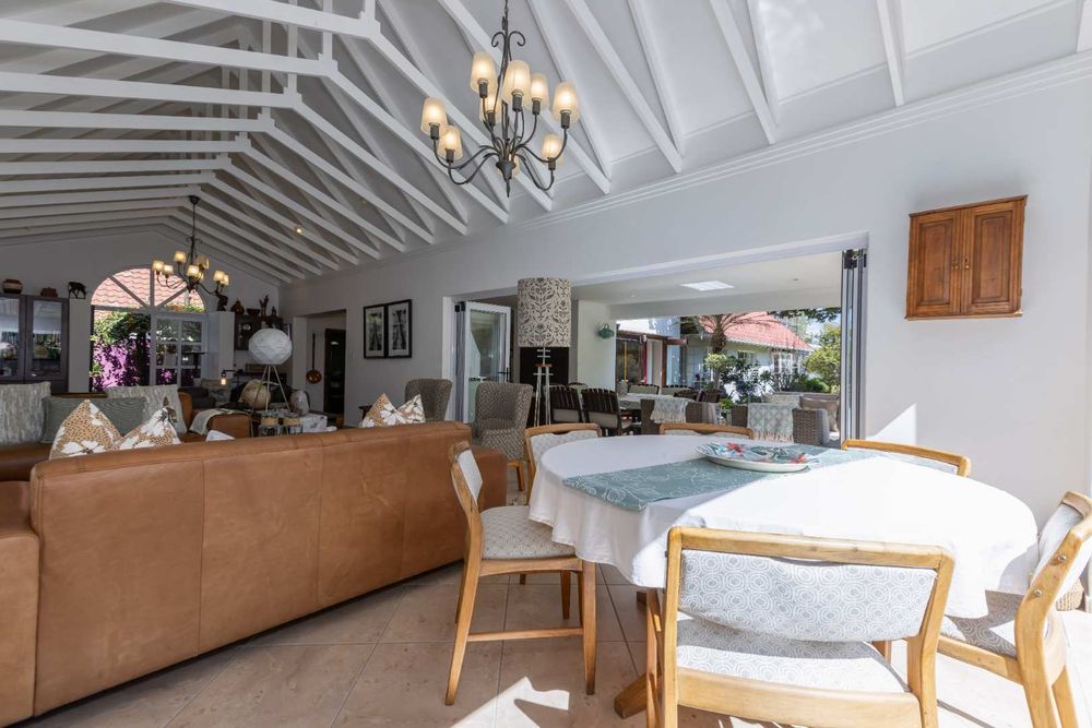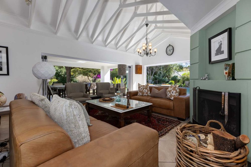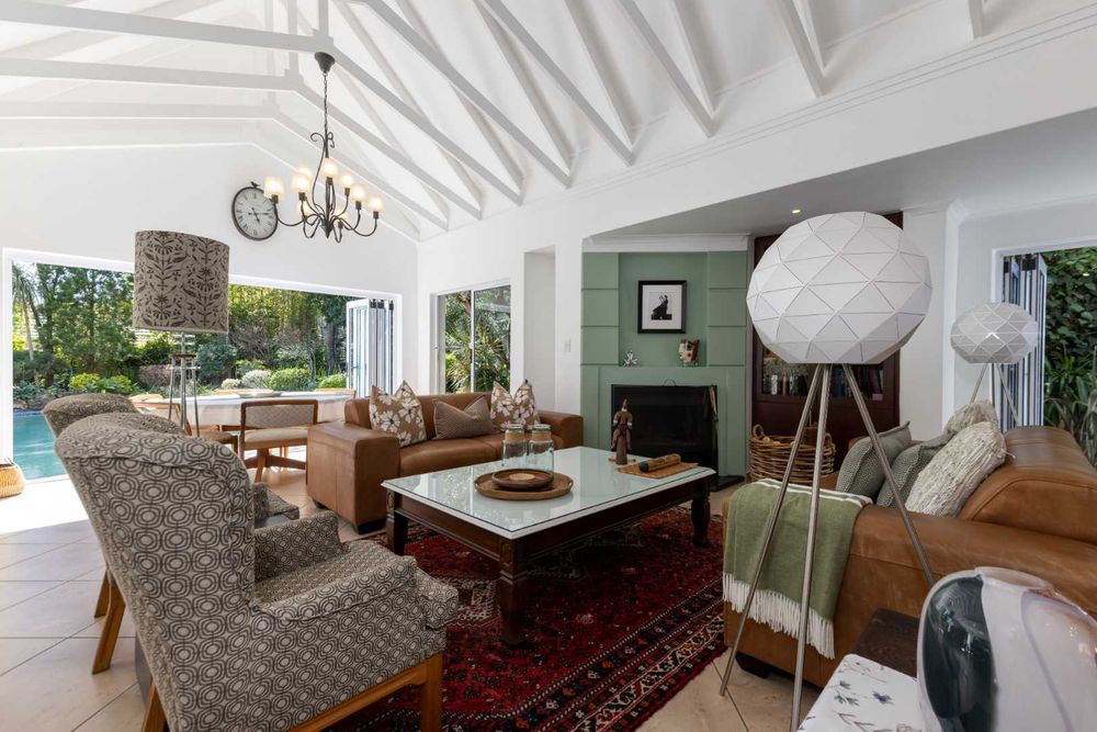 A welcoming entrance hall flows onto your reception areas -flow being your key element in this gorgeous family home. A sizeable open family lounge with crisp white exposed trusses gives you an open and breezy feeling. This space boasts a wood burning fireplace and spills out onto your entertainers patio, overlooking the manicured irrigated garden and sparkling swimming pool. The formal dining area is situated adjacent to the well- equipped kitchen and boasts granite countertops, SMEG gas hob, electric oven plus extractor fan, breakfast nook, single door fridge space, separate scullery area with under counter space to accommodate 3 of your appliances, plus ample built-in cupboards. A formal lounge area with a gas fireplace has a picturesque view of the garden bringing the outside in as you open your frameless stacking doors.