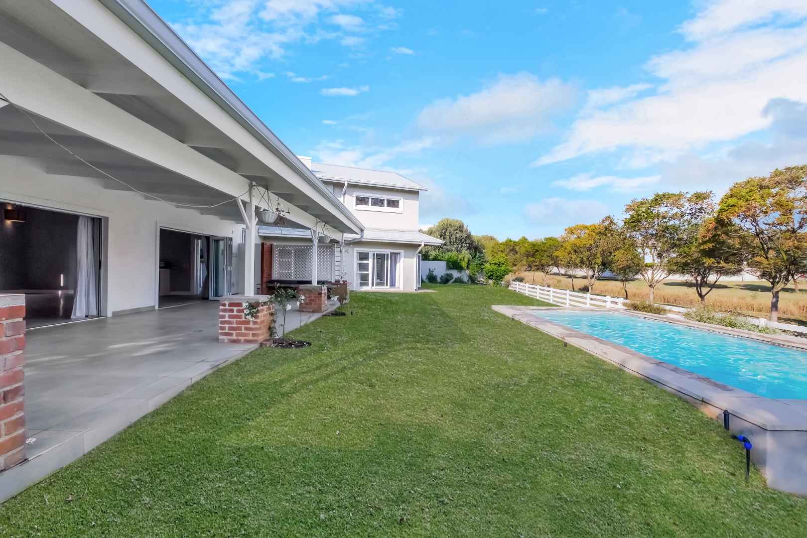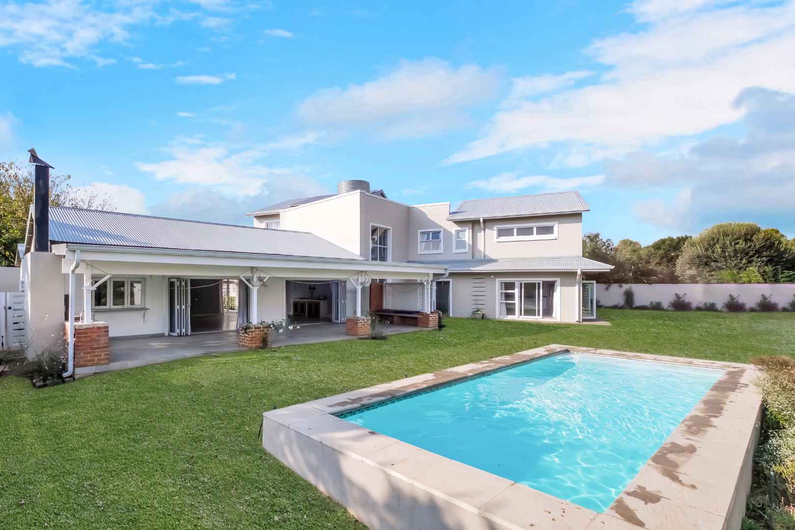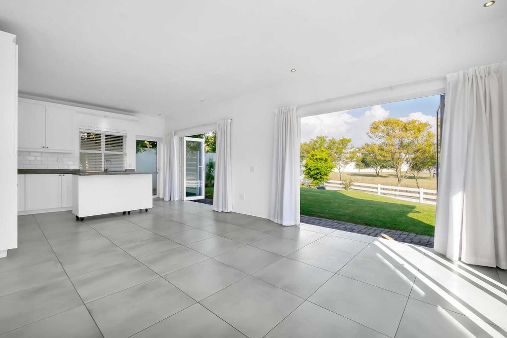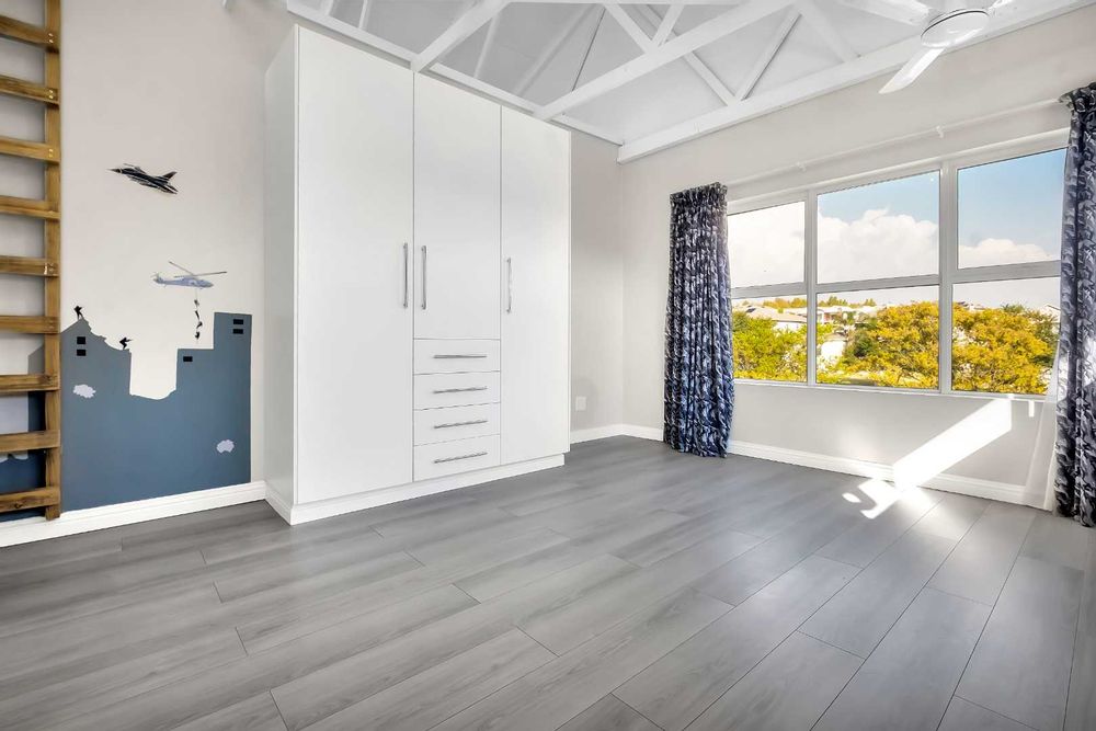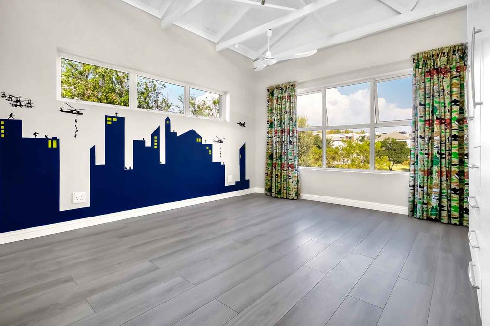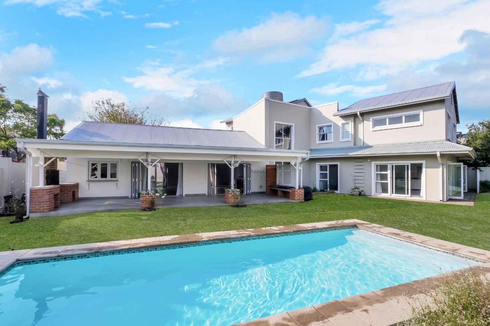 This impressive home for an extended family overlooking a dam is in the sought after Cedar Creek Estate. With its welcoming exposed trusses, the home boosts spacious light and bright open plan reception rooms with stacking doors opening to large entertainer patio with a built-in braai over-looking an inviting pool and mature garden. The well-appointed country style kitchen has a central island with a washing basin ideal for food preparation, Smeg 6 burner gas hob, granite tops, separate scullery, ample cupboard storage and space for 2 appliances.