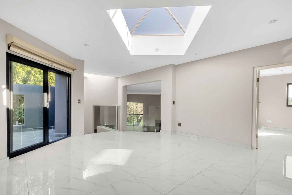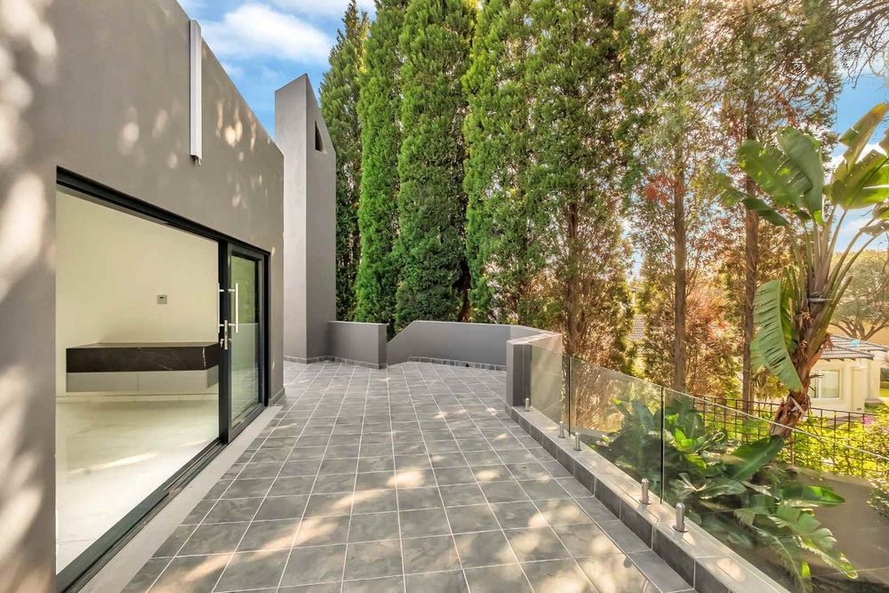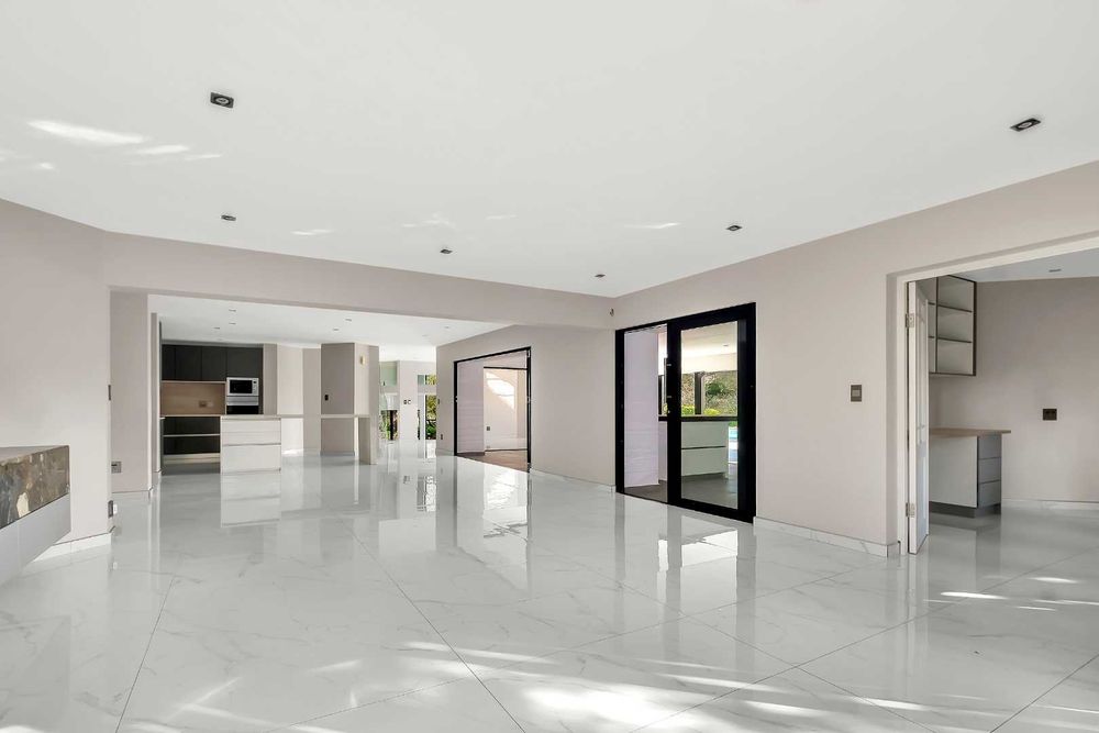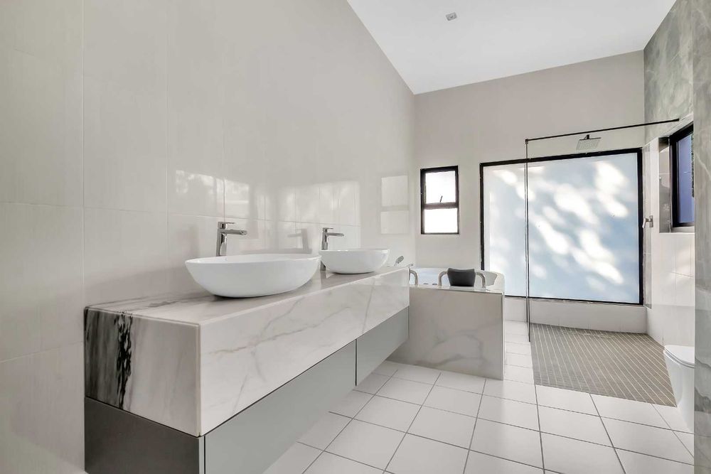 The expansive entertaining spaces provide the perfect setting for hosting unforgettable gatherings. The ultramodern and extremely functional kitchen is equipped with a stainless-steel gas hob and ample cupboard space together with a lovely eat-in breakfast nook. Showcasing flawless elegance and ideally configured for large scale family living and dining, with stacking aluminium doors providing a seamless indoor/outdoor flow onto the gloriously elevated patio, boasting views over the greenbelt, this home is sure to impress.