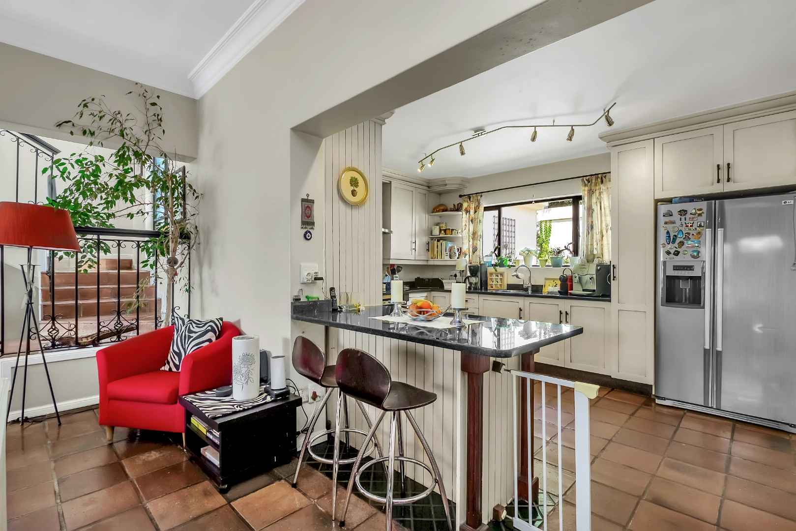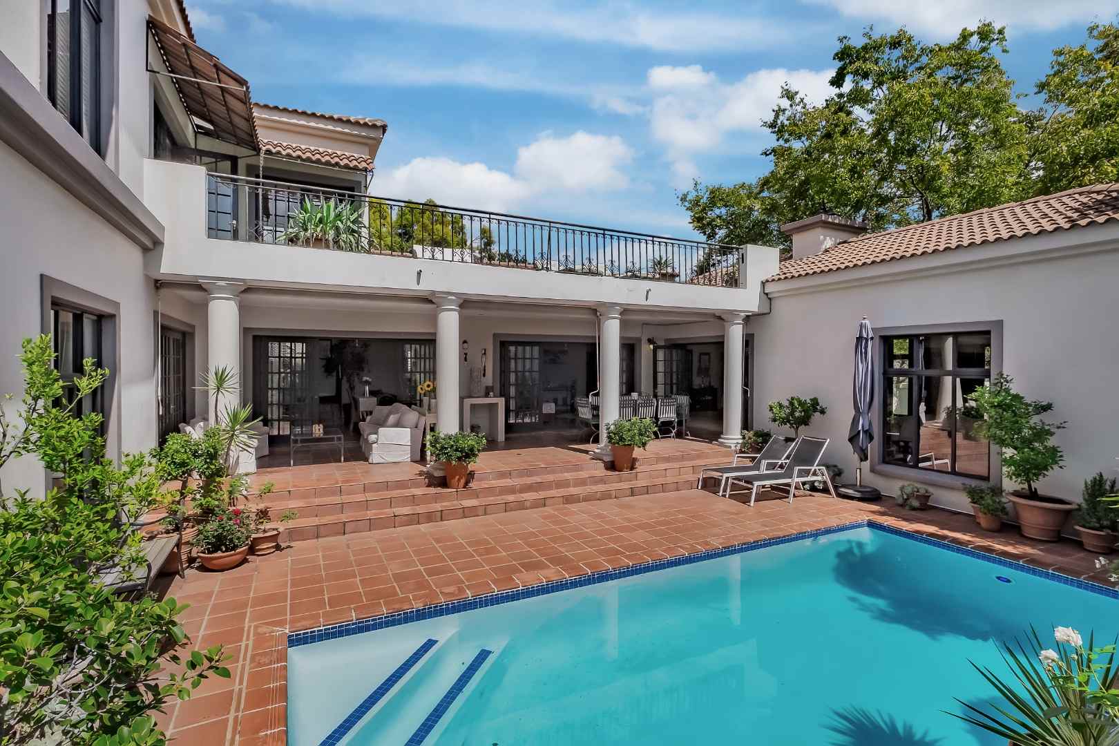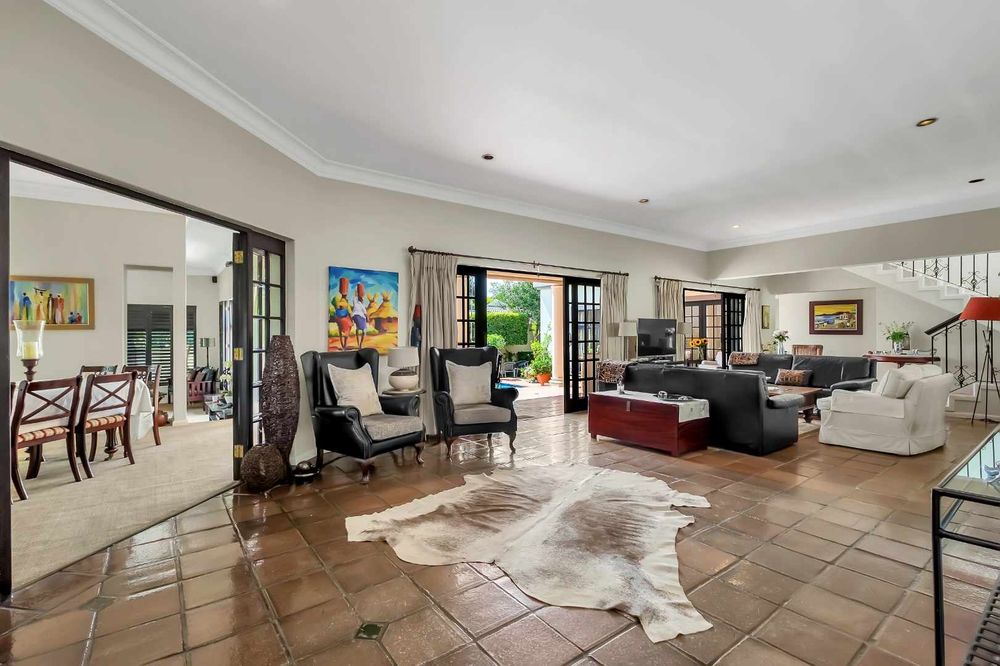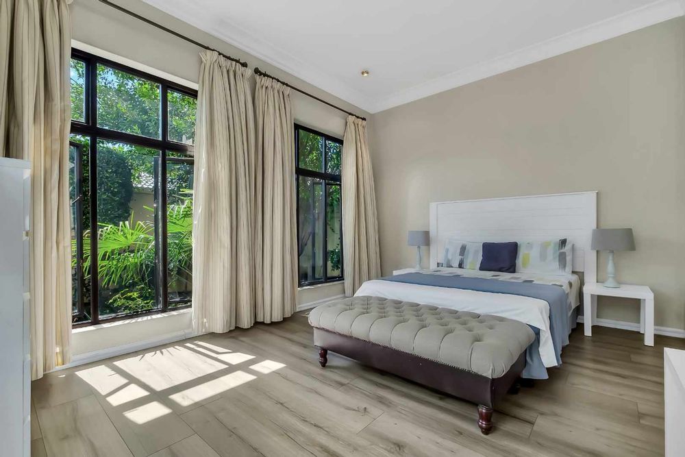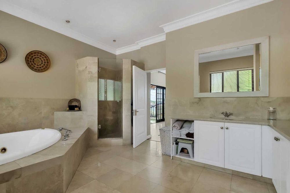 The four bedrooms are generously sized and thoughtfully distributed to maximise privacy. Upstairs, the master suite is a luxurious retreat complete with an air-conditioning unit, an open dresser and an en-suite bathroom fitted with a double vanity. Enjoy elevated views across Dainfern from the master suite balcony. Downstairs, three additional bedrooms fitted with built-in cabinetry, all sharing a central spacious bathroom.