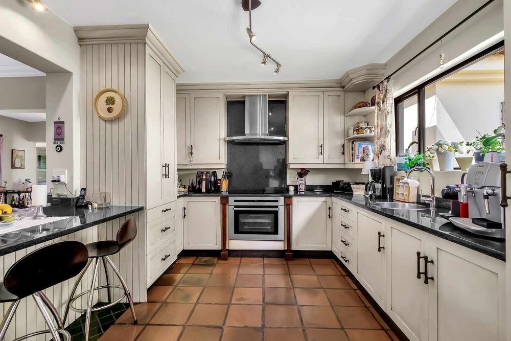The gourmet kitchen is equipped with an AEG cooker; granite countertops and ample cabinetry. The expansive countertop area and breakfast bar make this kitchen a true centerpiece, perfect for creating all culinary masterpieces. A separate scullery adjacent to the kitchen, completes this gem.