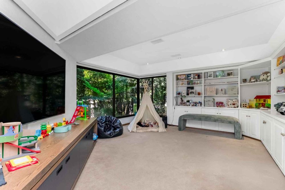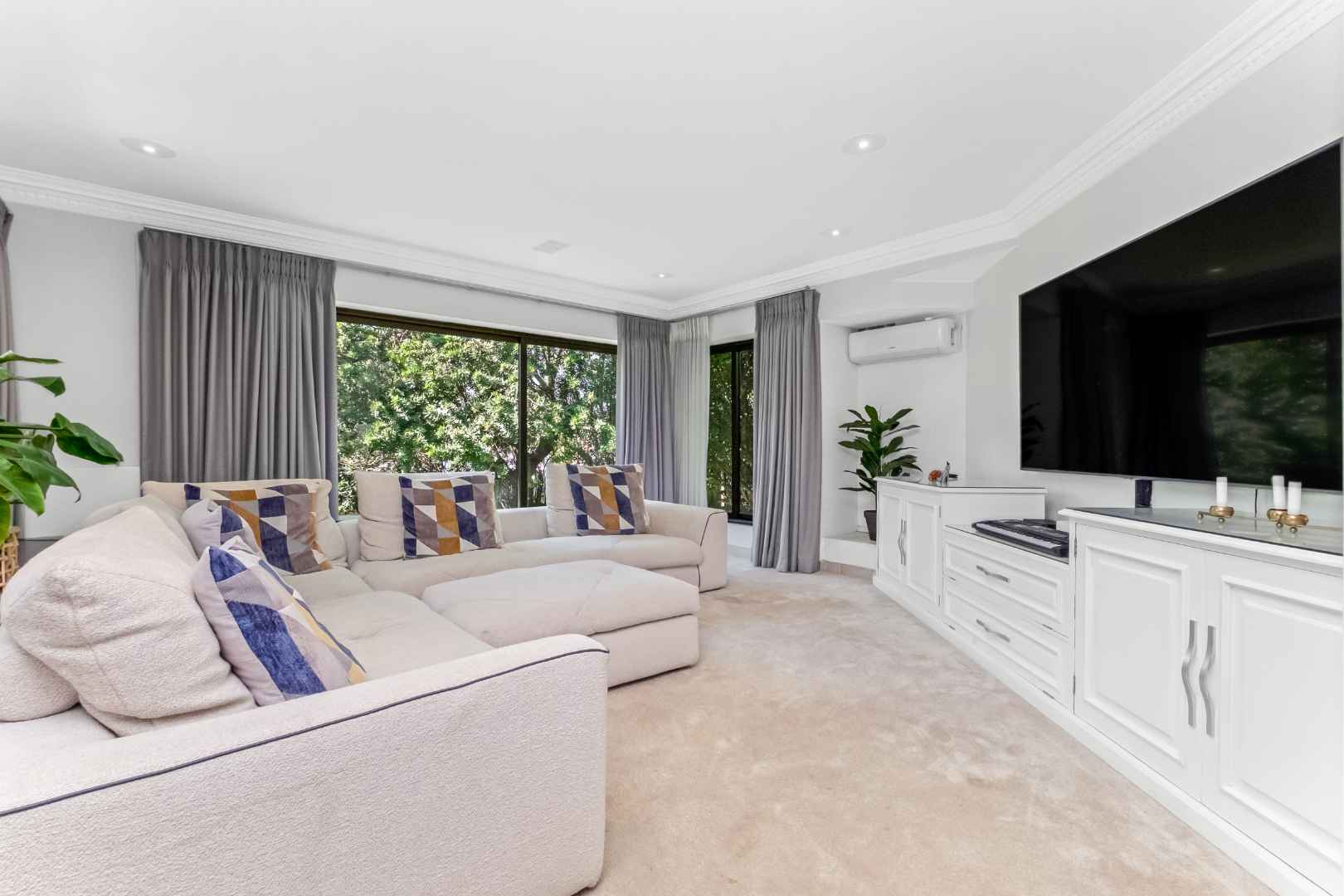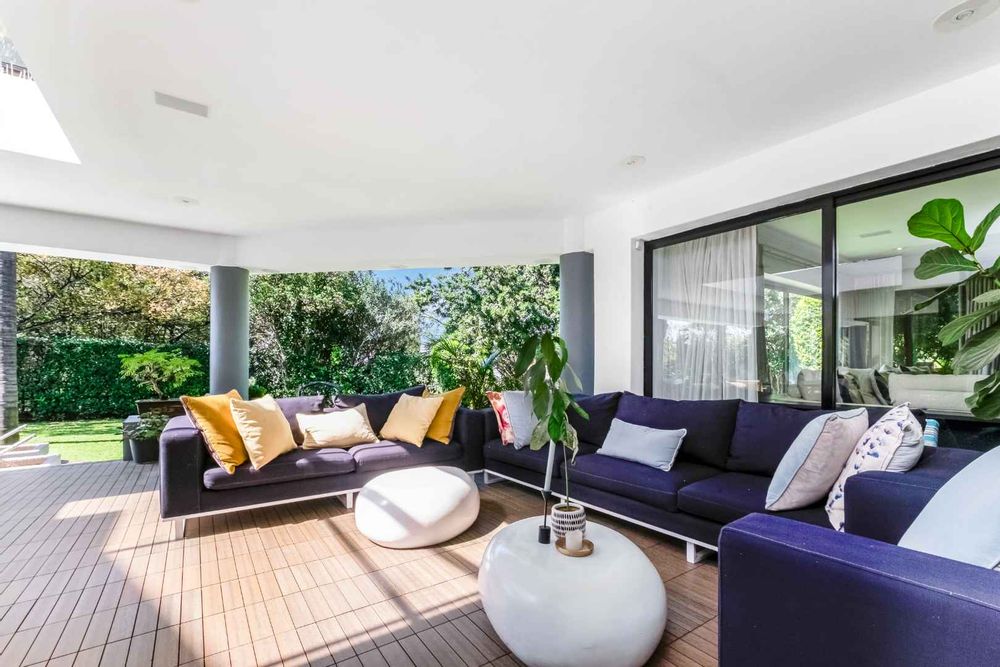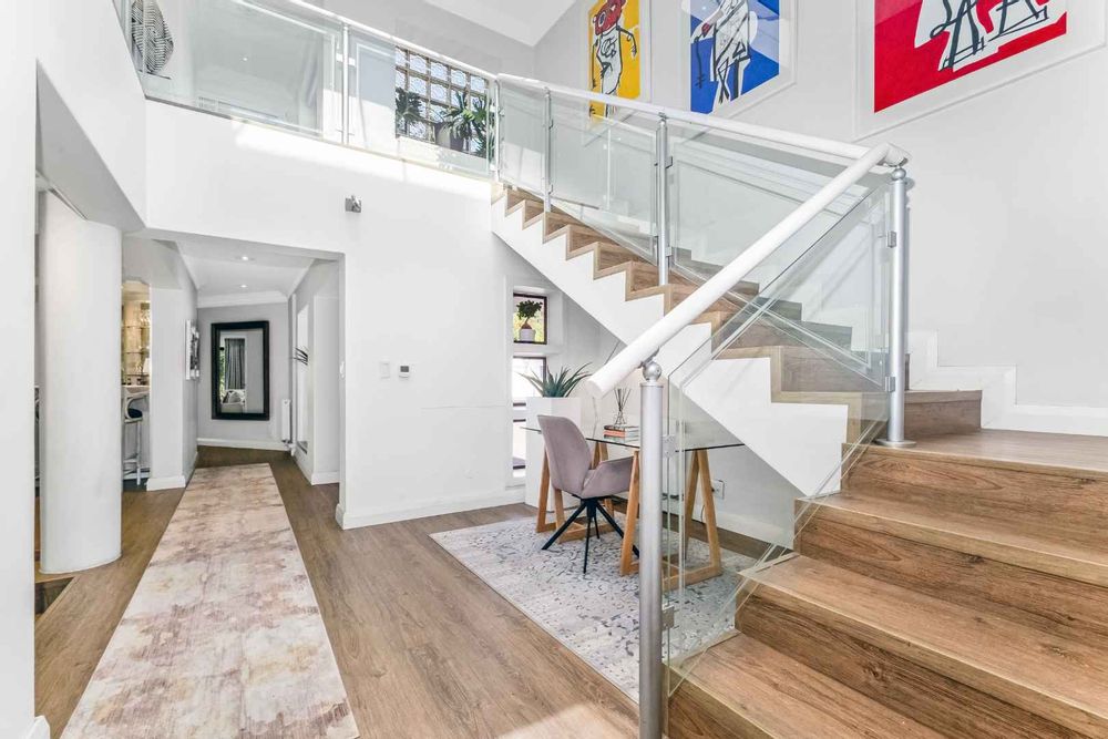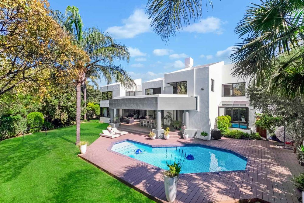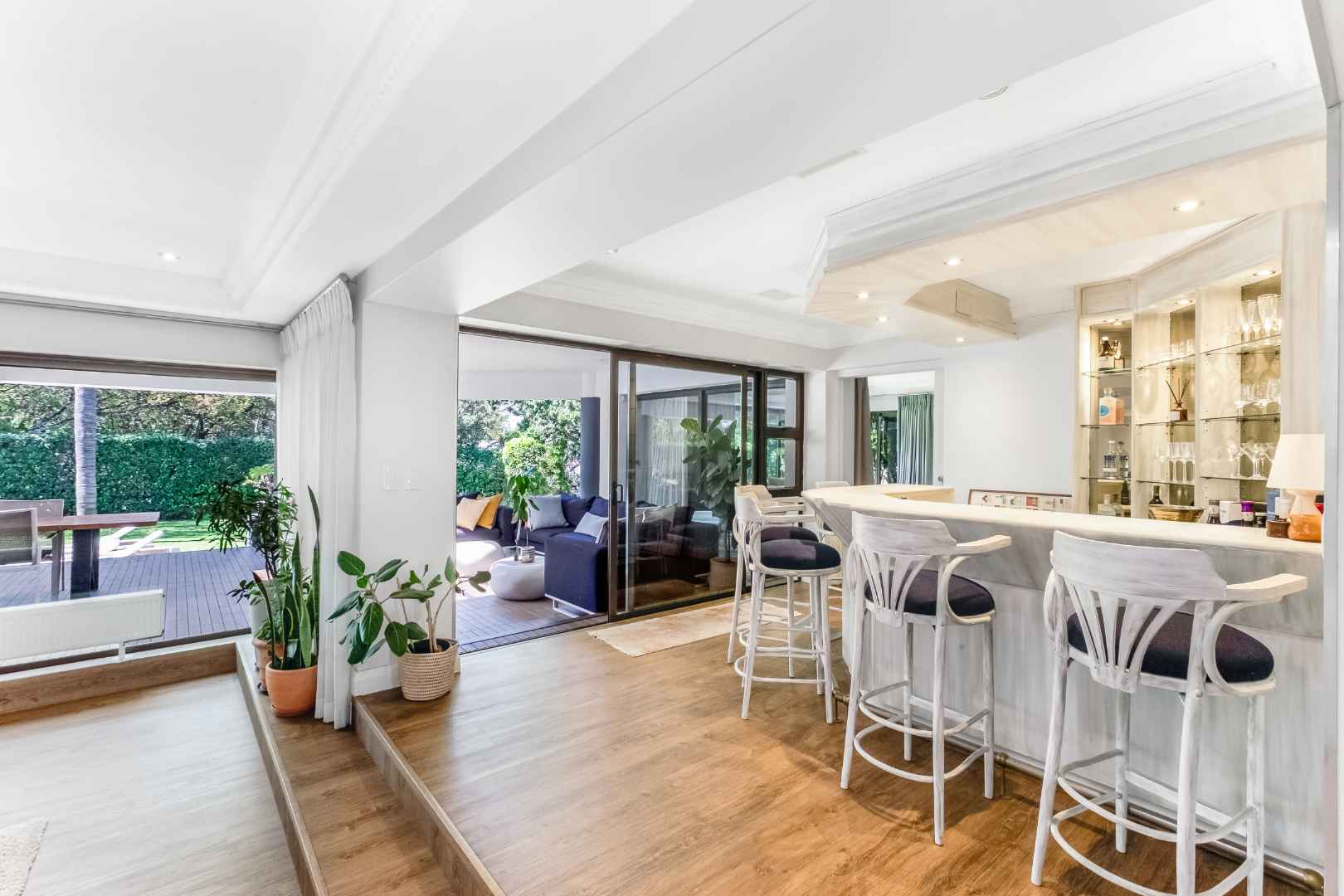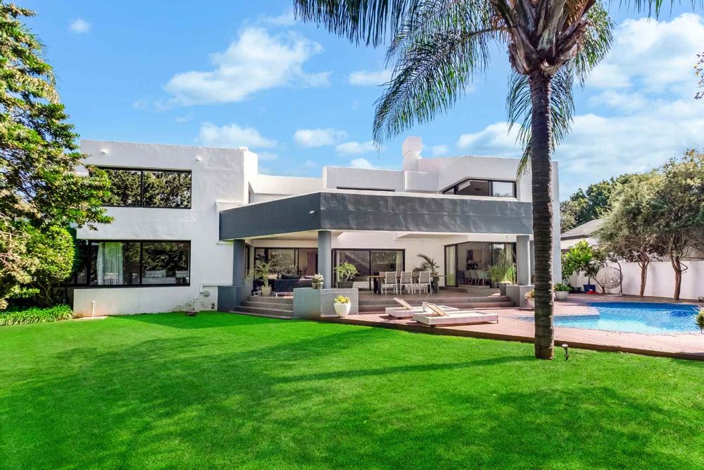 As you enter, you are welcomed by voluminous living spaces filled with natural light, flowing seamlessly from the designer kitchen and scullery to the stylish dining area and multiple lounges—perfect for both entertaining and relaxed family living. Large sliding doors open onto a covered patio. At the heart of the outdoor space is a sparking swimming pool, ideal for Summer days and effortless entertaining. The garden seamlessly connects to the covered patio, providing a relaxed setting for hosting family and friends or simply enjoying peaceful afternoons.