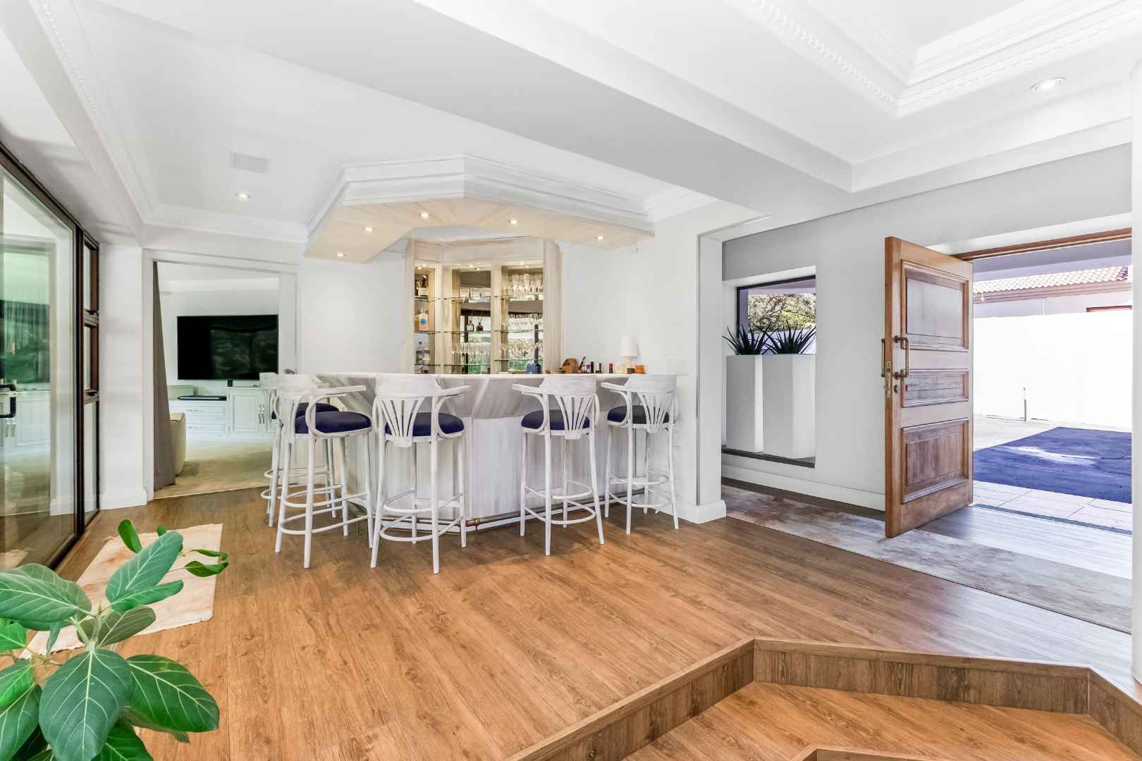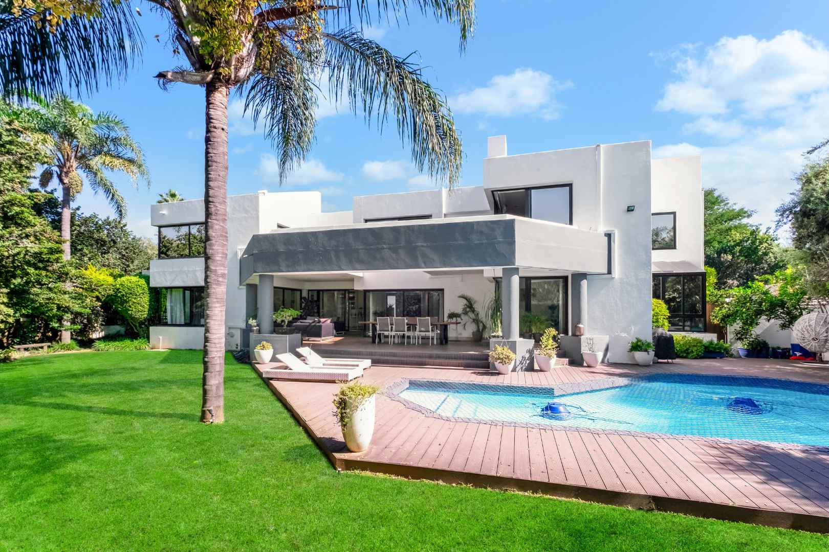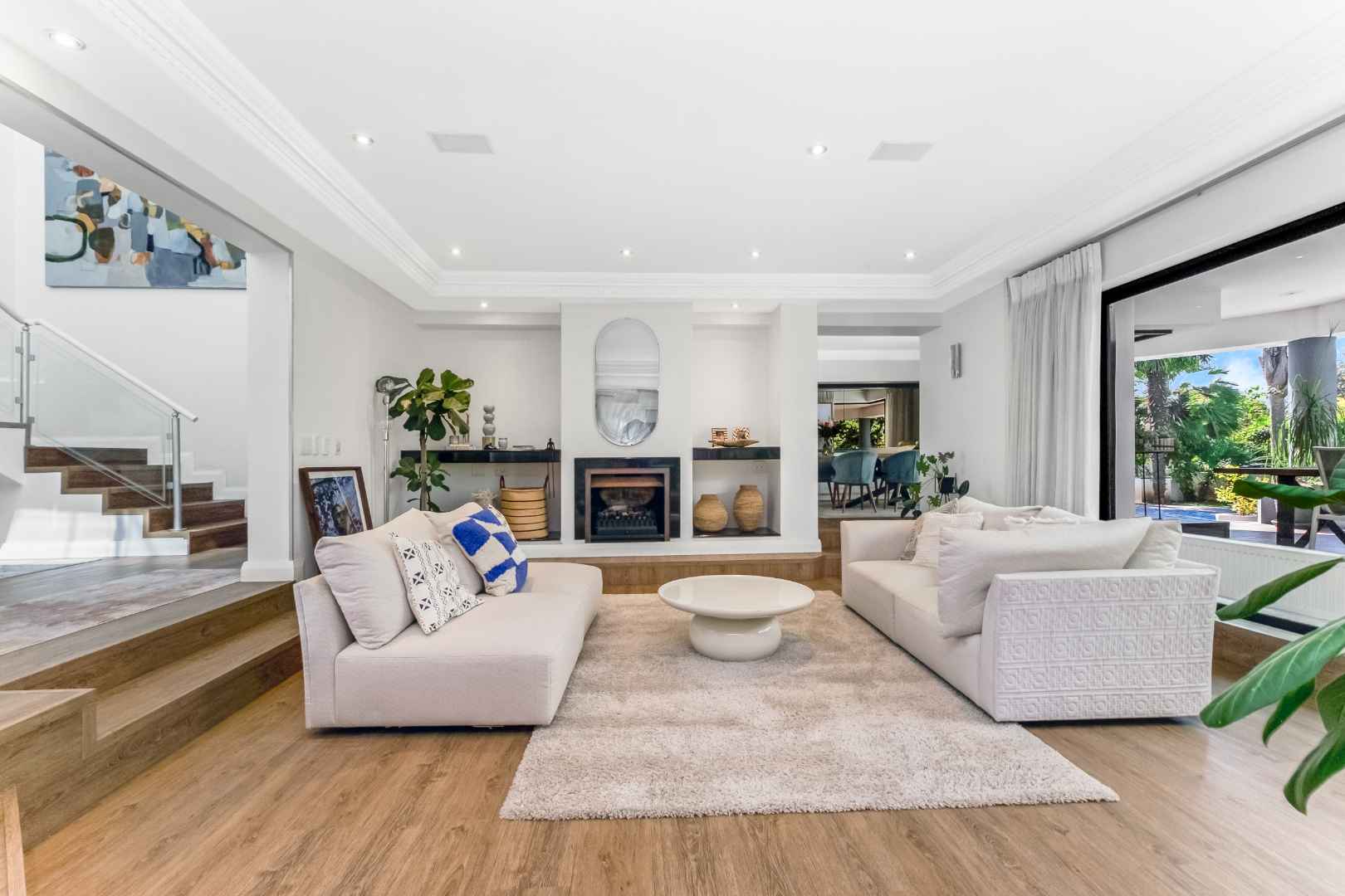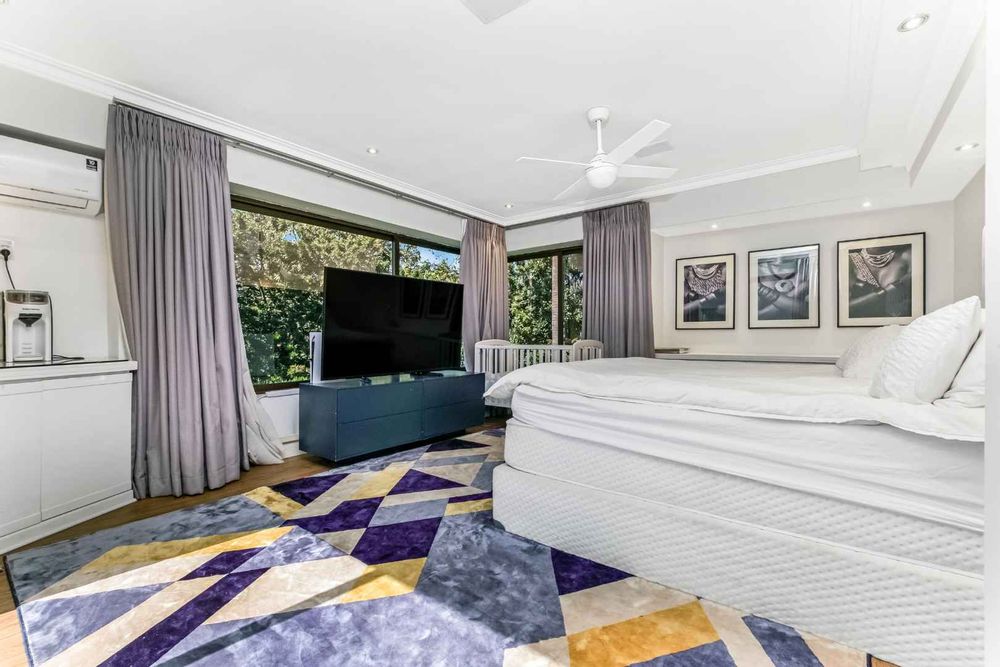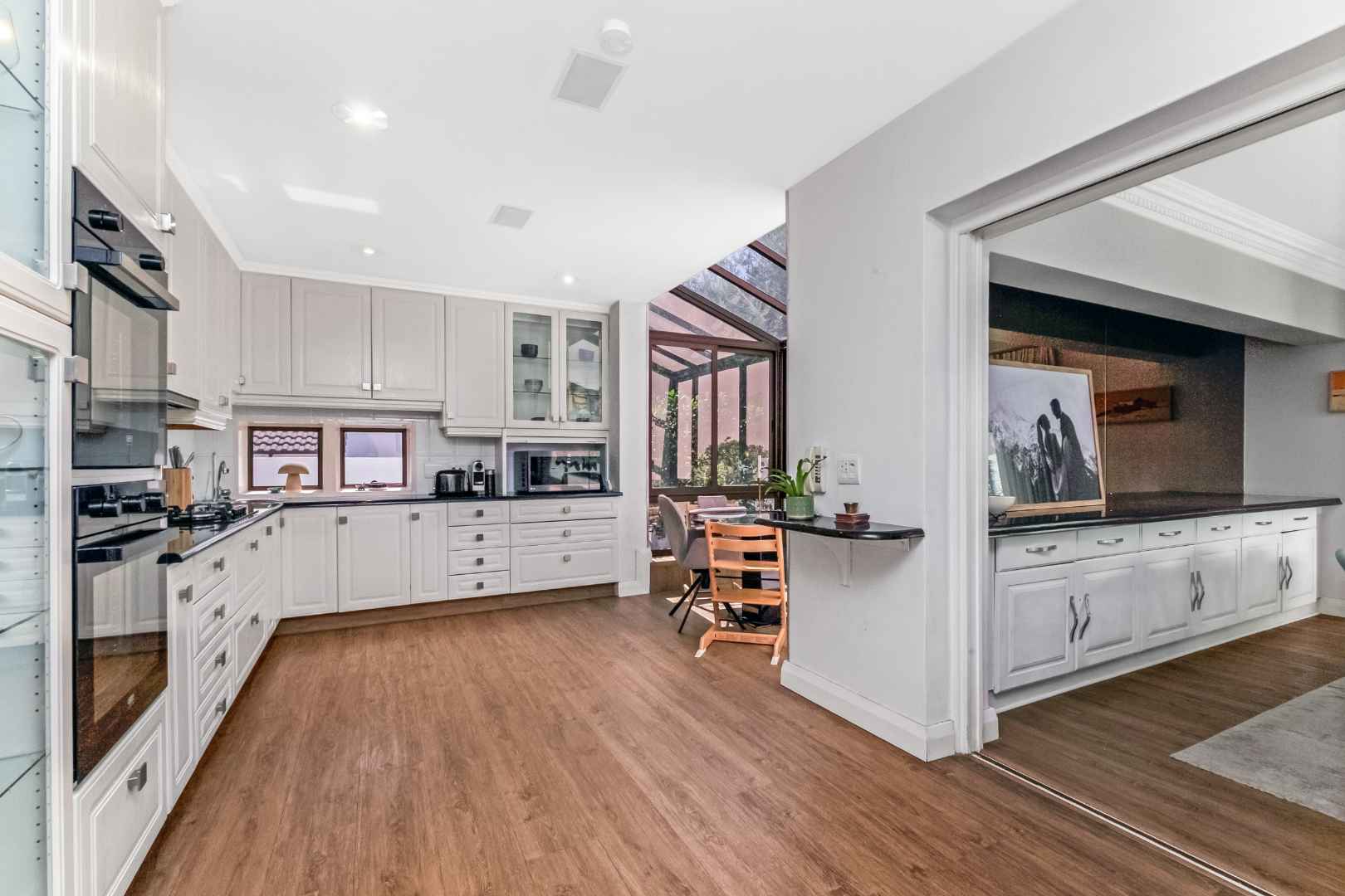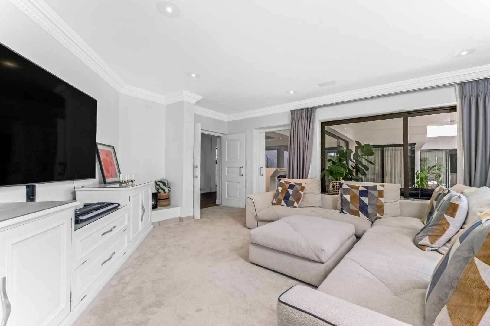 As you enter, you are welcomed by voluminous living spaces filled with natural light, flowing seamlessly from the designer kitchen and scullery to the stylish dining area and multiple lounges—perfect for both entertaining and relaxed family living. Large sliding doors open onto a covered patio. At the heart of the outdoor space is a sparking swimming pool, ideal for Summer days and effortless entertaining. The garden seamlessly connects to the covered patio, providing a relaxed setting for hosting family and friends or simply enjoying peaceful afternoons.