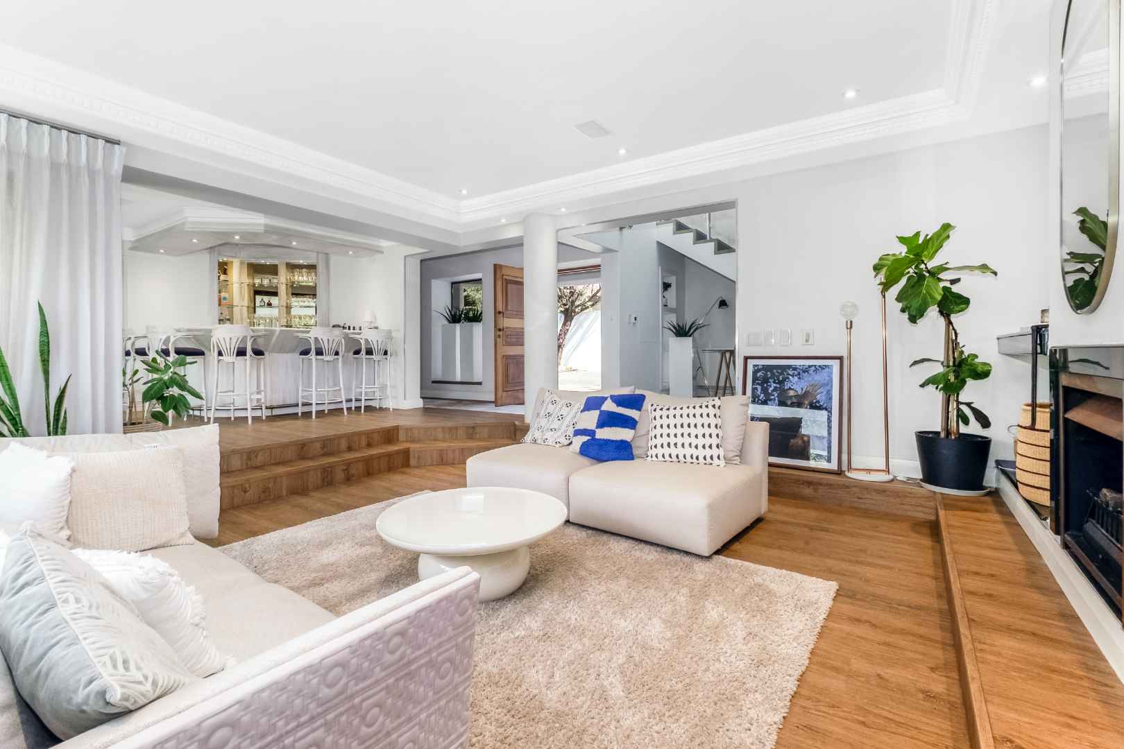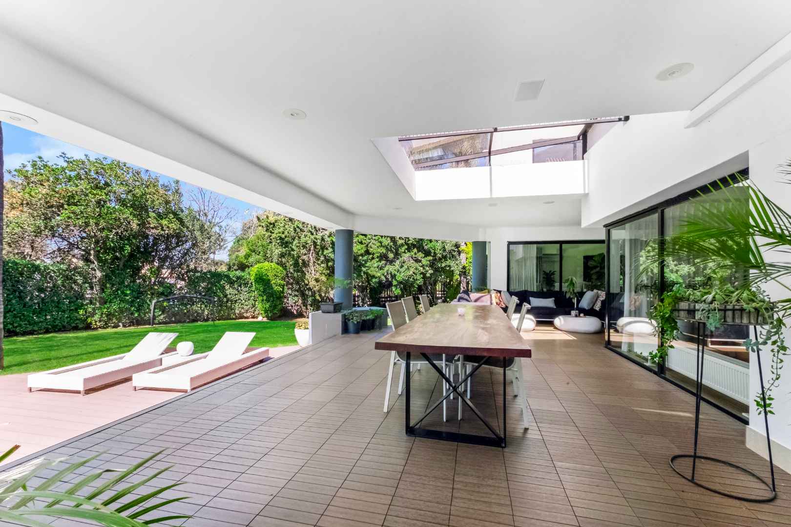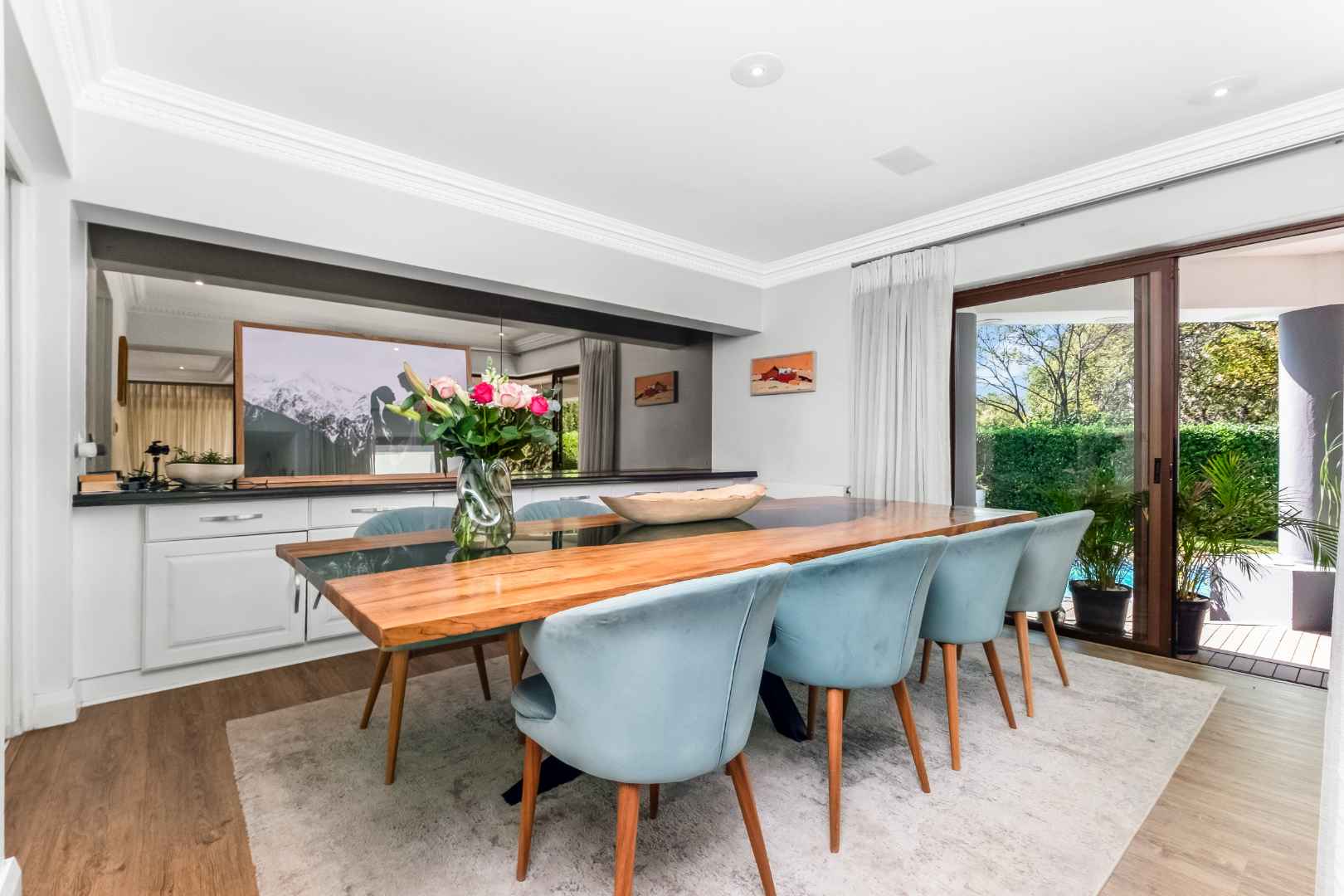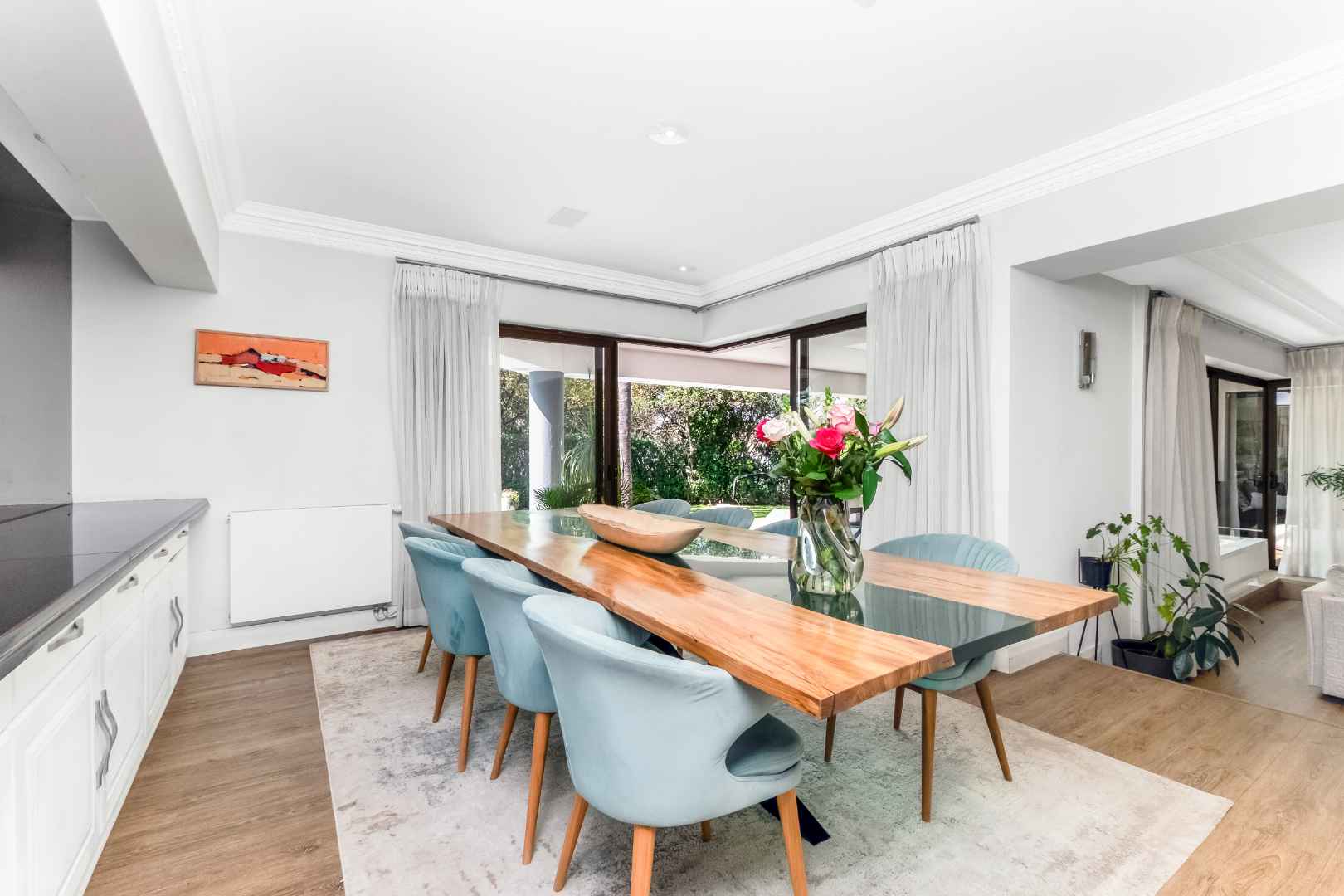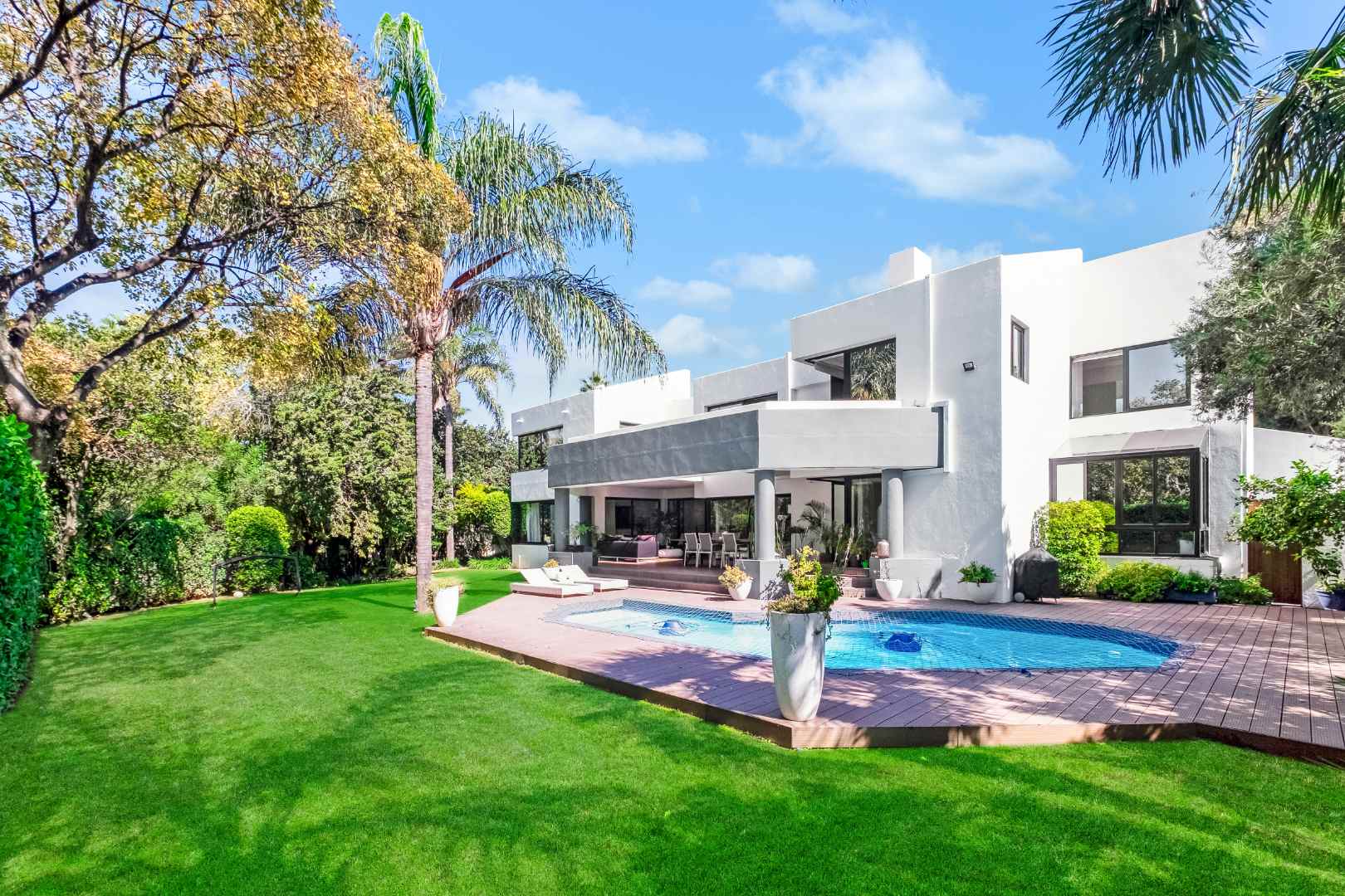 As you enter, you are welcomed by voluminous living spaces filled with natural light, flowing seamlessly from the designer kitchen and scullery to the stylish dining area and multiple lounges—perfect for both entertaining and relaxed family living. Large sliding doors open onto a covered patio. At the heart of the outdoor space is a sparking swimming pool, ideal for Summer days and effortless entertaining. The garden seamlessly connects to the covered patio, providing a relaxed setting for hosting family and friends or simply enjoying peaceful afternoons.