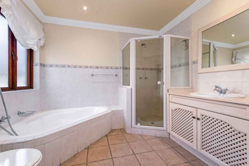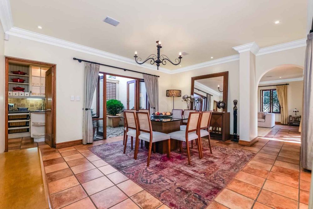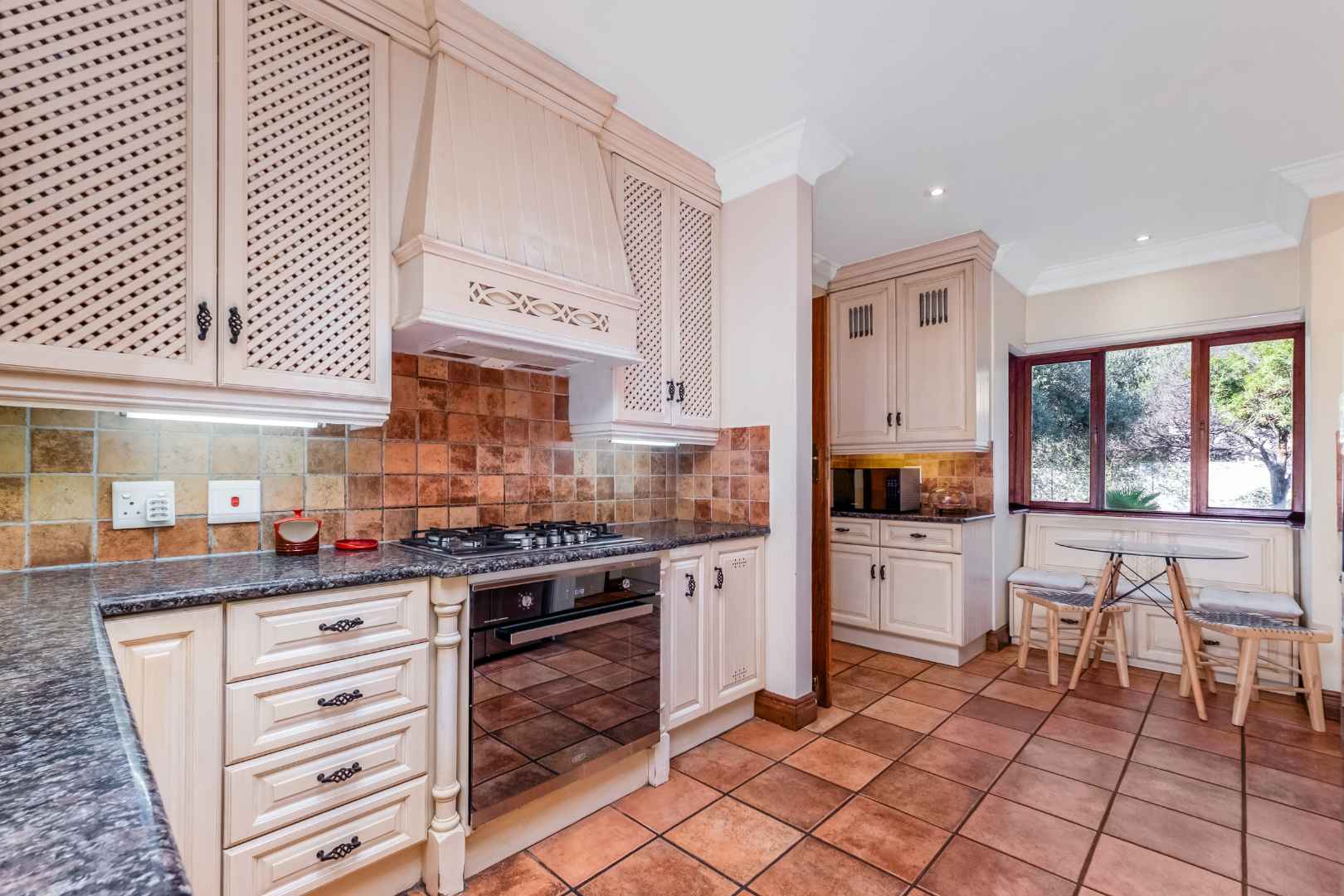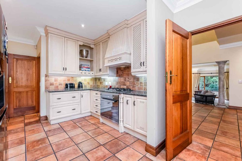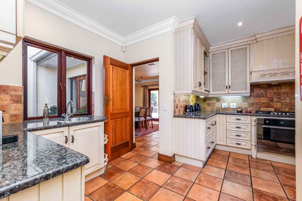 This spacious and inviting home is designed for comfortable living and entertaining. The generous living areas include: a formal lounge boasting a cozy gas fireplace – perfect for relaxing on chilly evenings as well as a bright and airy family room featuring its own built-in cellar for your favourite collection. The elegant dining room offers ample space for memorable family gatherings and dinner parties. The Tuscan-style kitchen boasts granite countertops, a 5-plate Defy gas hob, separate scullery and spacious walk-in panty to ensure plenty of storage and prep space, while the cozy breakfast nook provides the perfect spot for casual meals.