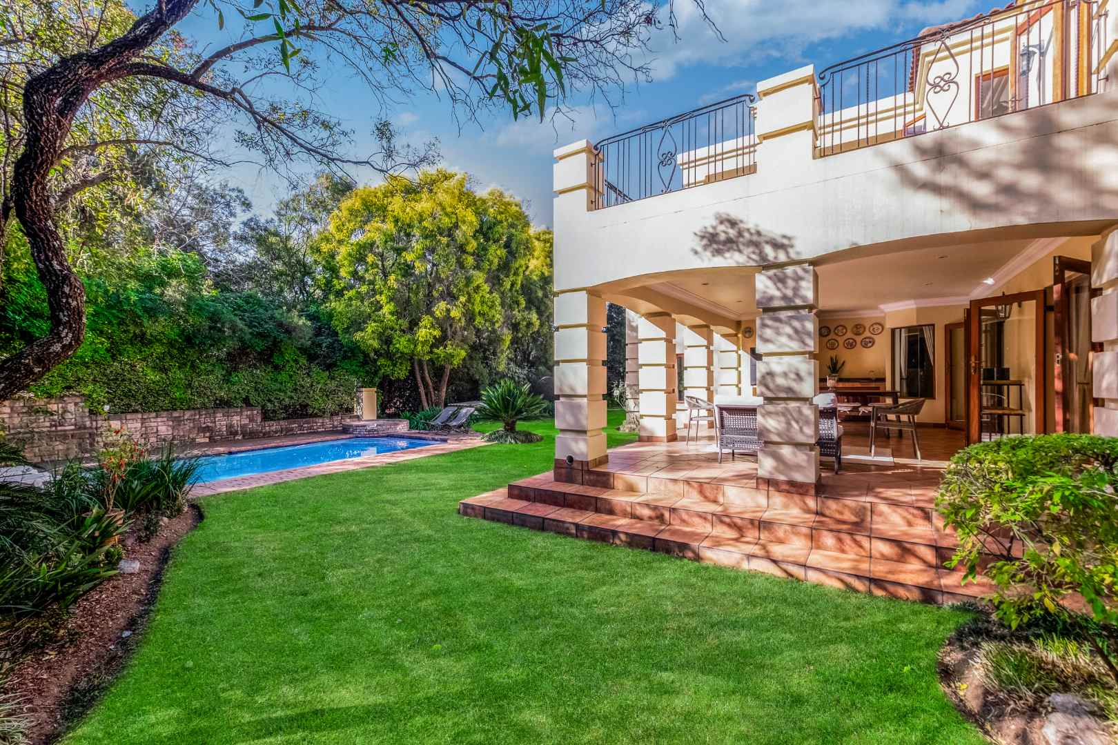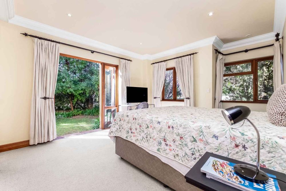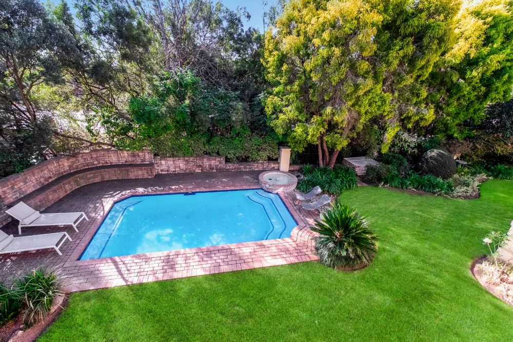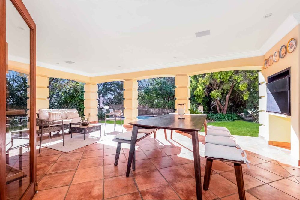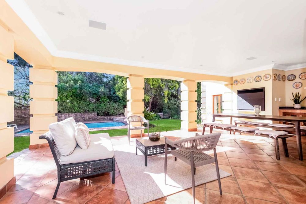 A generous-sized covered patio, complete with a built-in gas braai, offers the ideal space for hosting guests or enjoying laid-back weekends. Overlooking a spacious, beautifully maintained garden and sparkling swimming pool, this tranquil outdoor area creates a private oasis for relaxation and family fun all year round.