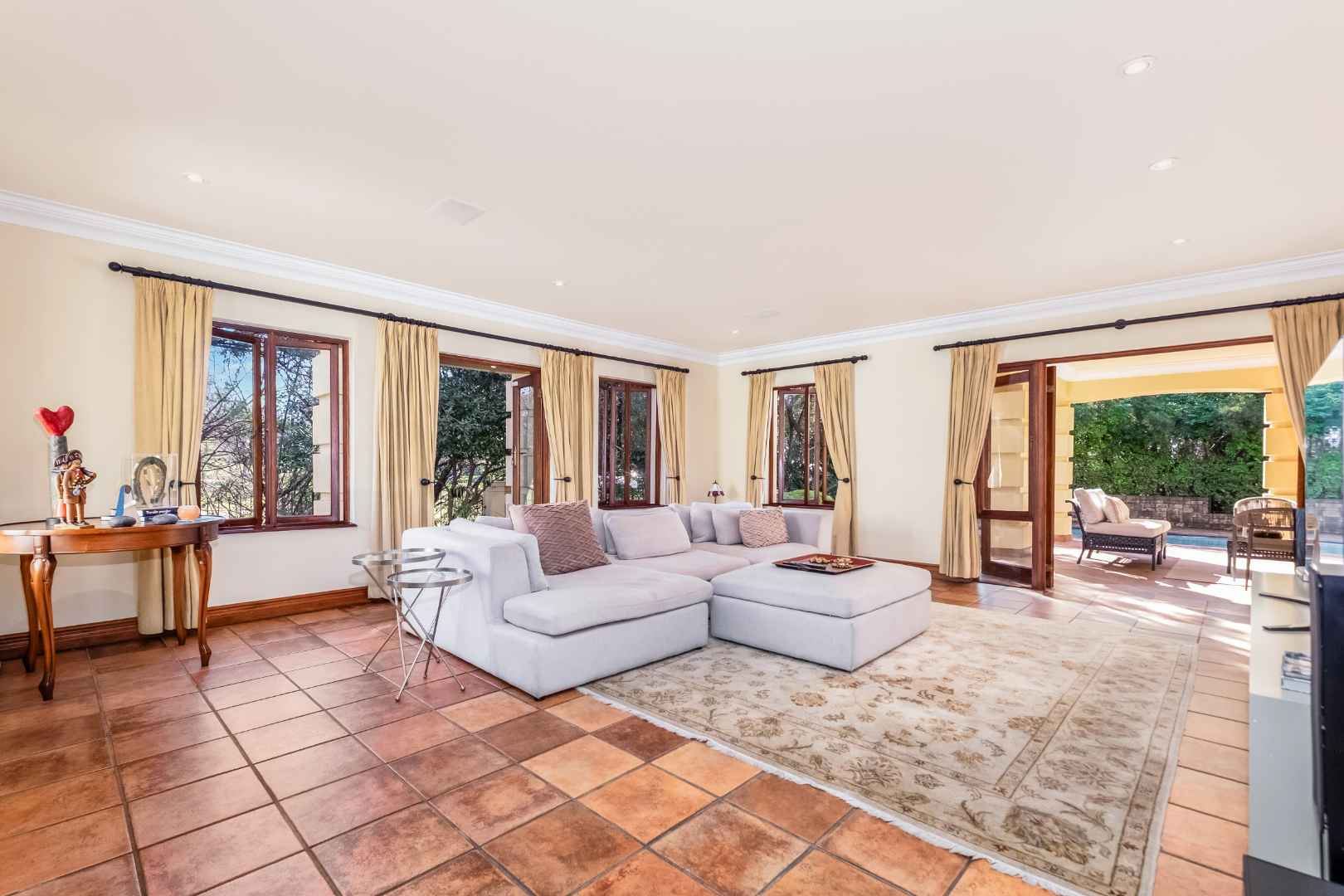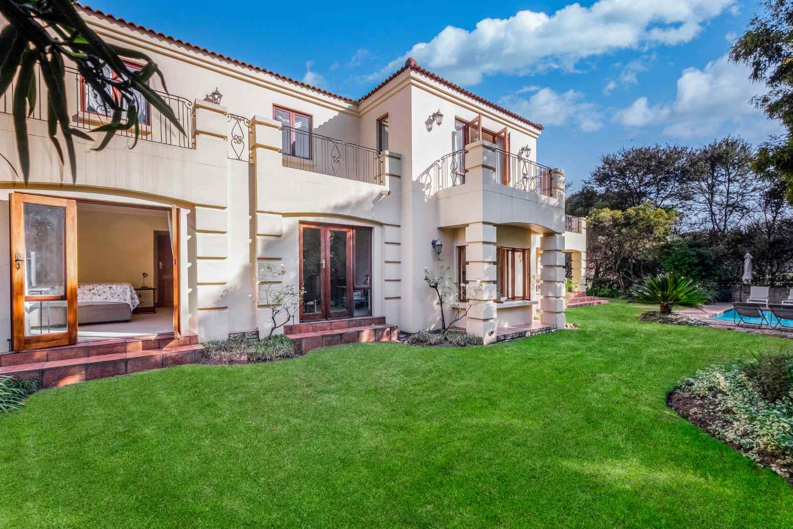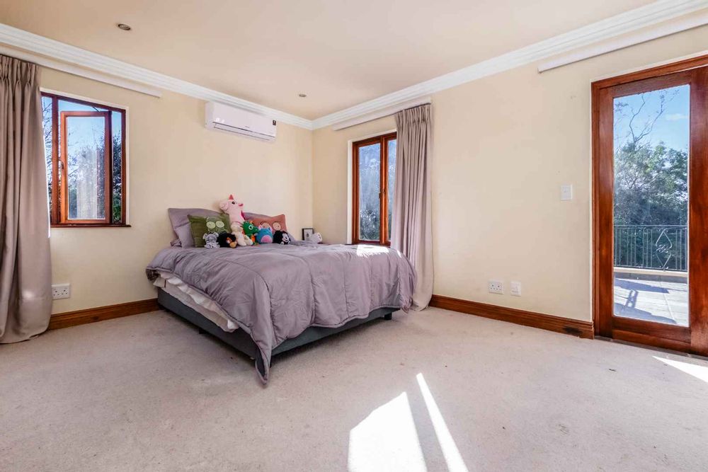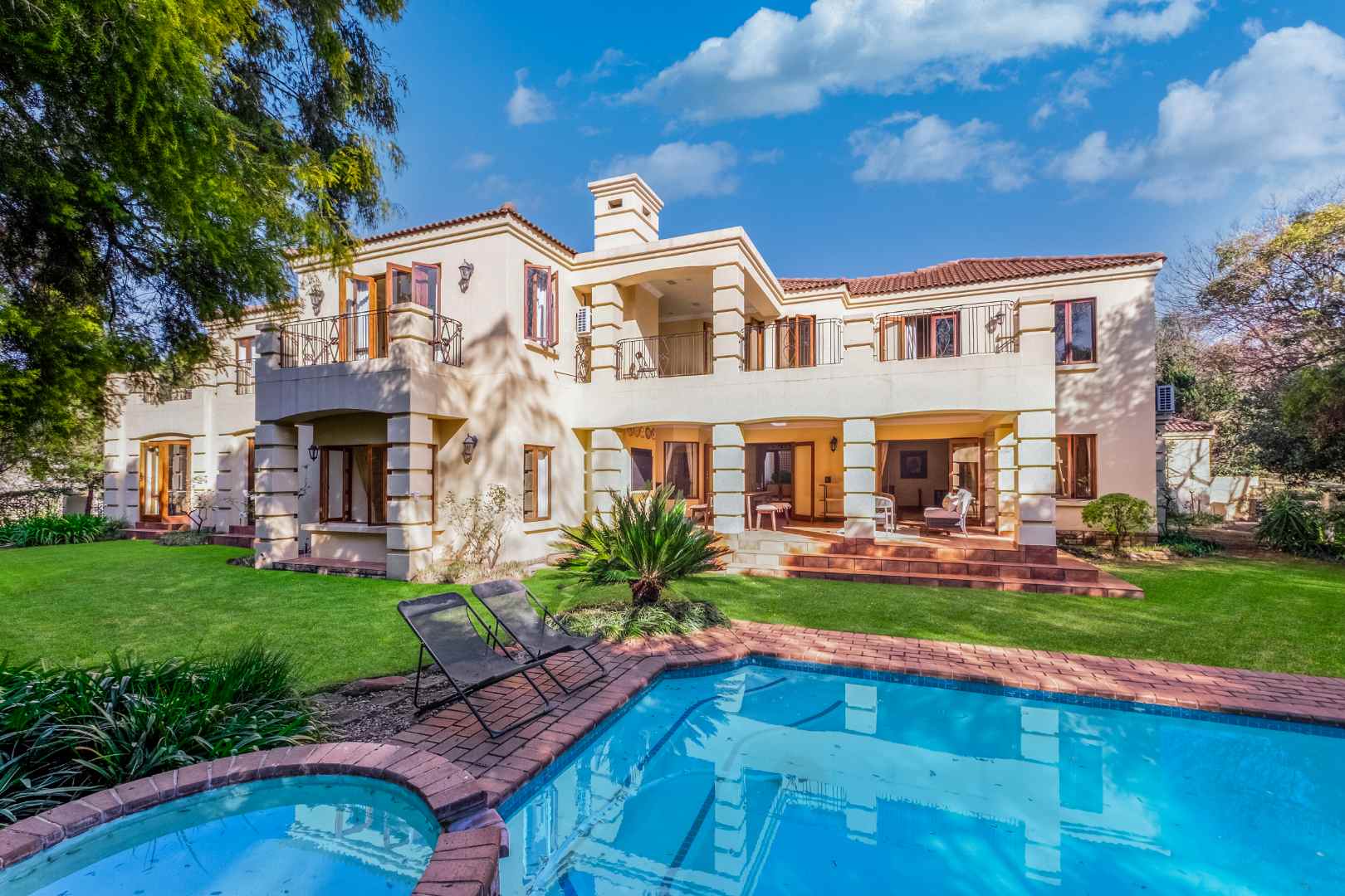 A generous-sized covered patio, complete with a built-in gas braai, offers the ideal space for hosting guests or enjoying laid-back weekends. Overlooking a spacious, beautifully maintained garden and sparkling swimming pool, this tranquil outdoor area creates a private oasis for relaxation and family fun all year round.