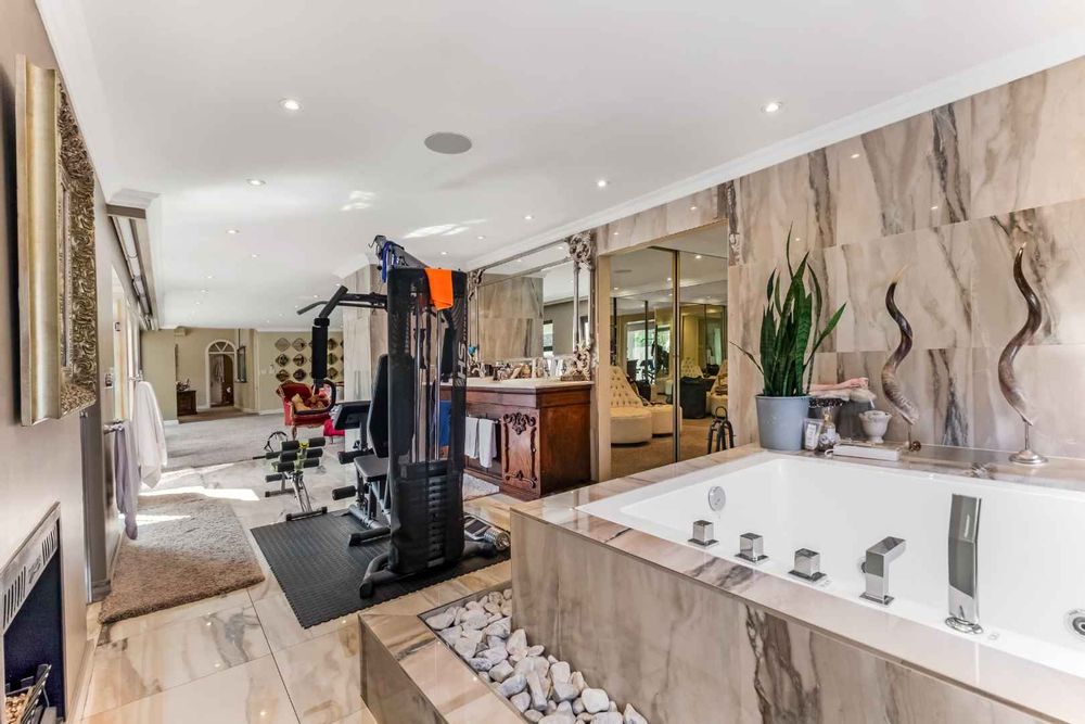 The outdoor area is an entertainer’s dream, featuring a large covered patio with built-in servers and a gas braai, perfect for hosting gatherings in style. Overlooking the expansive landscaped garden, the patio flows effortlessly to a sparkling swimming pool, a full-sized tennis court, and a dedicated jungle gym area for children to play.