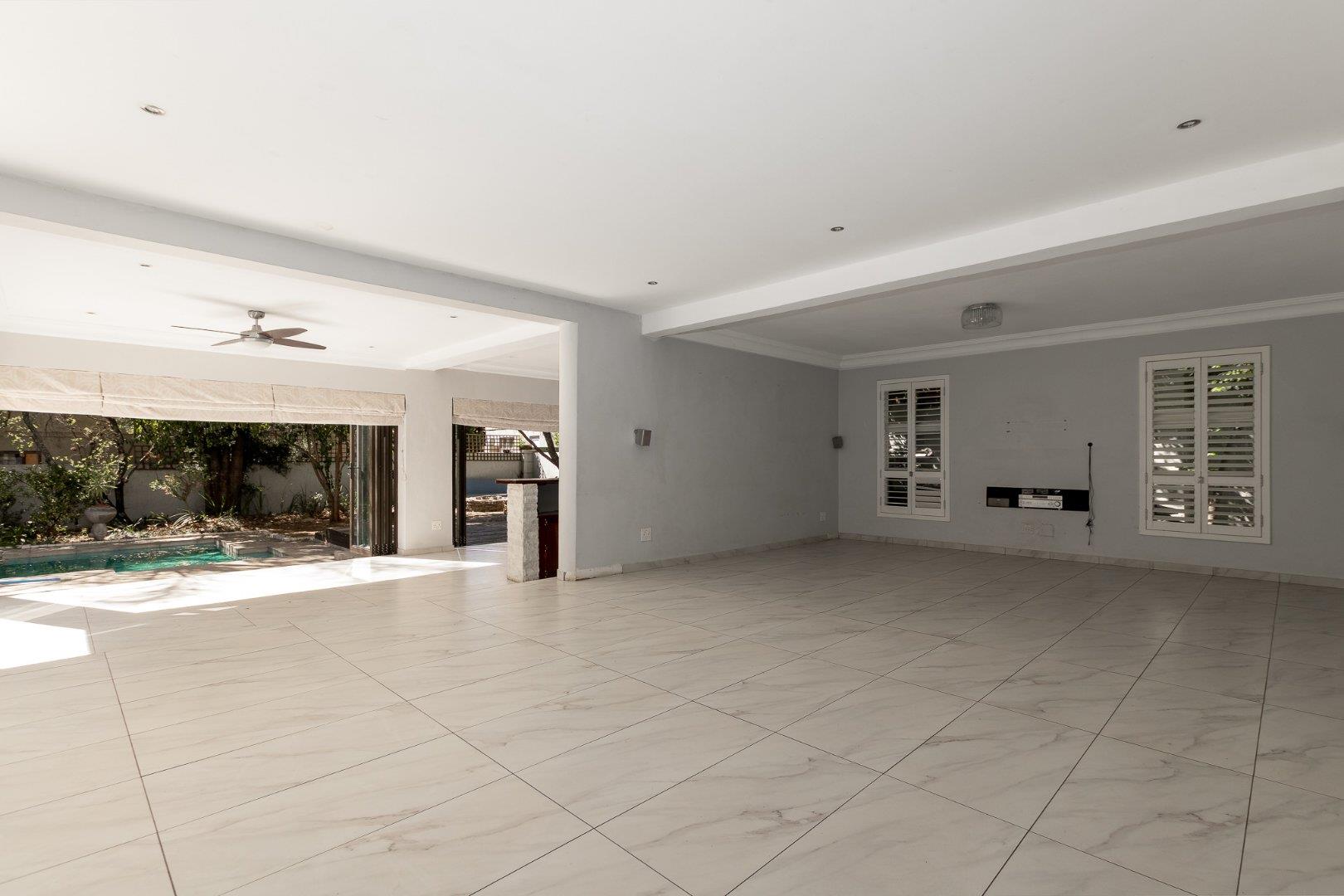 The living areas flow effortlessly to a covered patio, designed as the ultimate entertainment space. Complete with a fitted bar and a built-in wood / coal braai, this area is perfect for year-round gatherings. From here, stacking doors open out to the expansive garden and sparkling pool, creating a seamless indoor-outdoor lifestyle. Whether hosting friends, enjoying family braais, or watching the children play in the garden, this space offers the perfect balance of relaxation and entertainment.