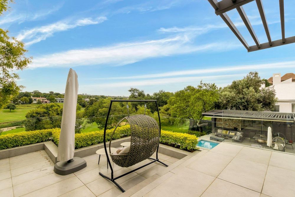 The outdoor space is equally impressive, featuring stylish composite decking that surrounds a sparkling swimming pool and a comfortable seating area. A built-in gas braai with an electronic awning creates the perfect setting for entertaining, while the elevated position offers views of the lavish garden and the pristine golf course, seamlessly extending the home’s luxurious living experience outdoors.
