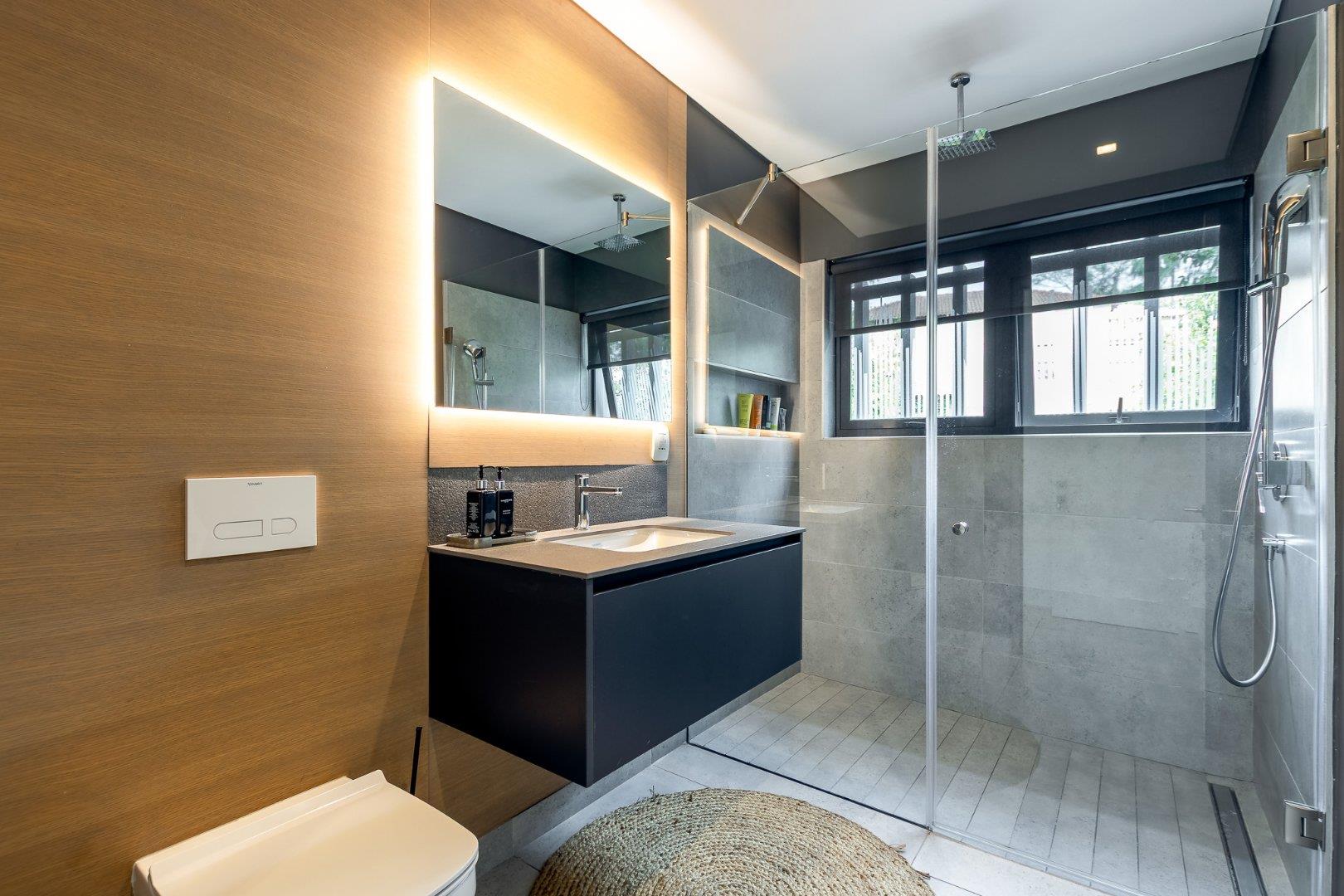 This five-bedroom residence exudes refined luxury and thoughtful design, offering an elevated lifestyle in every sense. The master suite is nothing short of spectacular, featuring a private dresser with abundant cabinetry, air conditioning unit, and a sumptuous en-suite complete with a sauna — a sanctuary of relaxation. Upstairs, three additional bedrooms are generously proportioned, each appointed with built-in cabinetry, individual air-conditioning units, and access to exquisitely renovated bathrooms adorned with high-end Duravit fittings.