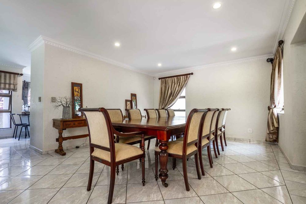 Tucked away in a quiet cul-de-sac, close to the golf course for easy access for your evening walks. This furnished home with spacious living consists of open plan lounge with fireplace and dining room with built-in wooden cocktail bar. Private lounge or playroom plus open plan, eat-in kitchen with granite tops, breakfast nook and Britta filter for filtered drinking water and separate scullery. 4 Bedrooms, 4 bathrooms (2 en-suite), 3 bedrooms are upstairs , guest suite downstairs. Main bedroom has a small study, fireplace, private patio and air-conditioning. All the bedrooms have brand new carpets. Upstairs also offers an open study area on the landing. Large established garden with swimming pool (heated) under roof and a lovely entertainment area with built-in braai, small bar area with plumbed-in fridge with cold water and ice maker. Double automated garage and staff accommodation.
