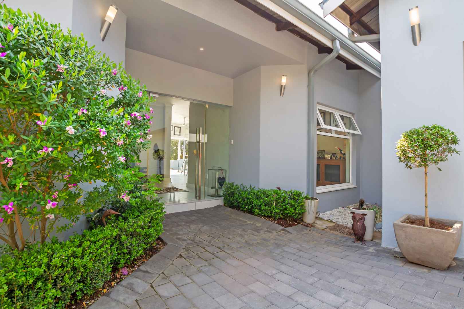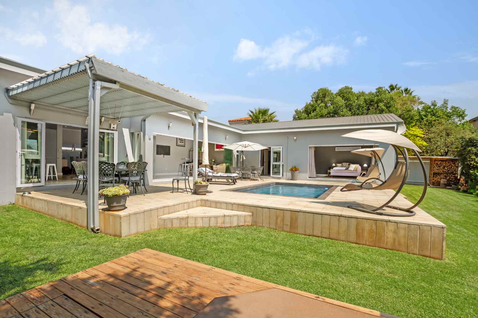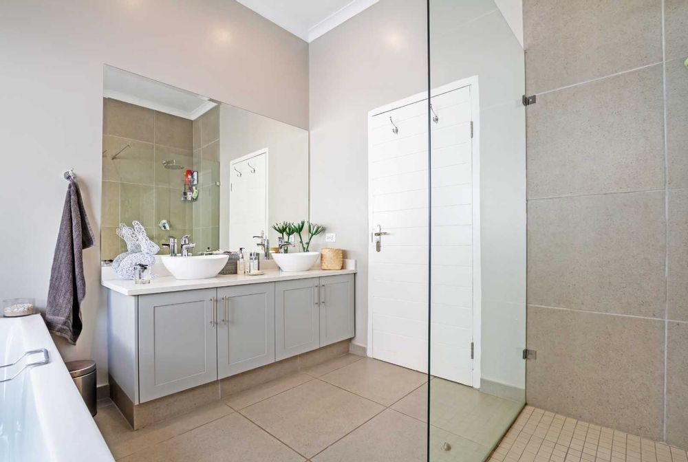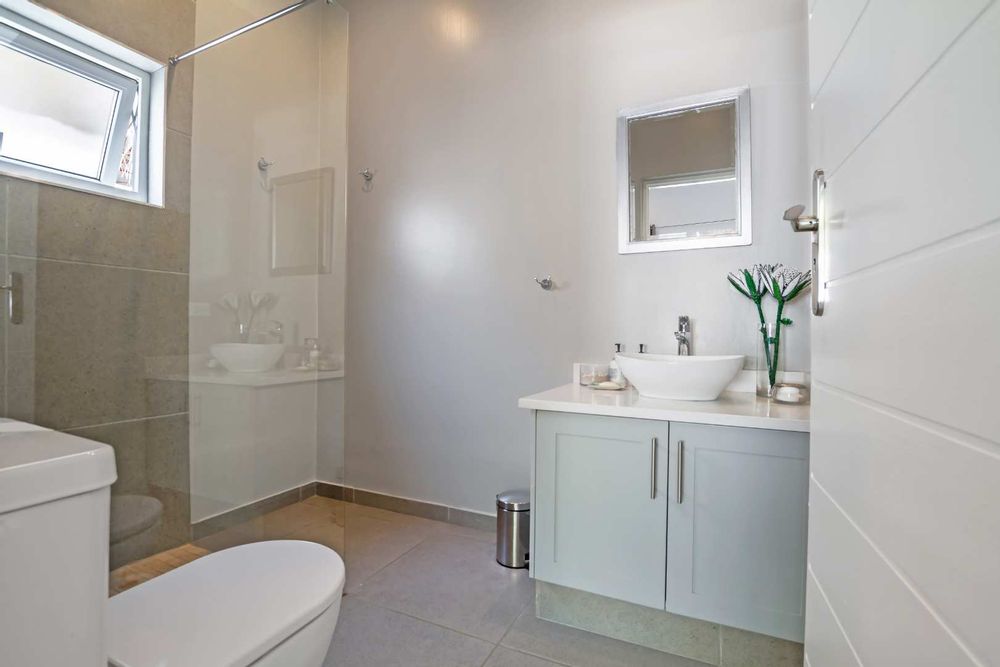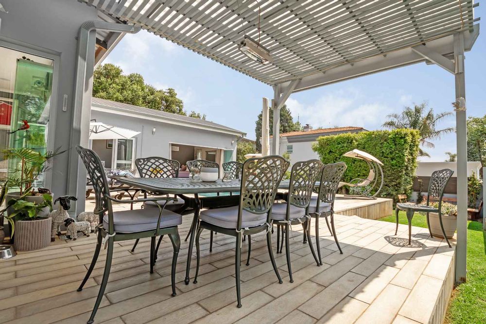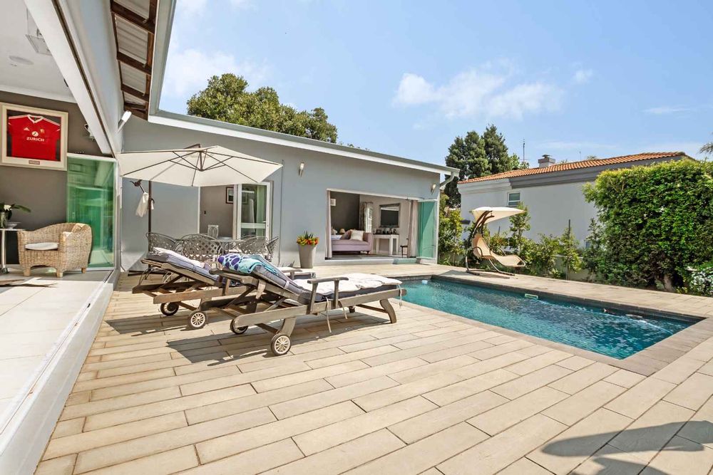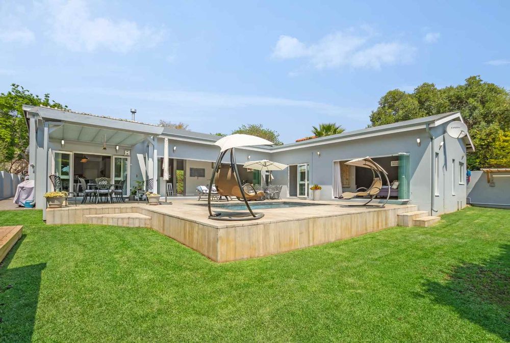 There are 4 bedrooms and 3 bathrooms, 2 are en-suite. The main bedroom has an inverter friendly air-conditioner. The study area is fitted and designed for modern living. Stunning covered entertainment pagoda outside for those warm summer evenings having a private heated Jacuzzi and fire-pit area nearby, with a storeroom for wood. This house is eco-friendly having isotherm in the ceiling, double glazing German profile windows and stack-back doors in white coated PVC, solar powered geysers, bore hole with 5000 L water tank and filtration system ensuring purified water into the home. All the bedrooms have aircons, and a piped sound system in the living rooms. Double garage with direct access into the home, good staff accommodation, plenty of visitors parking complete this home. Making this a desirable home with simple clean lines.