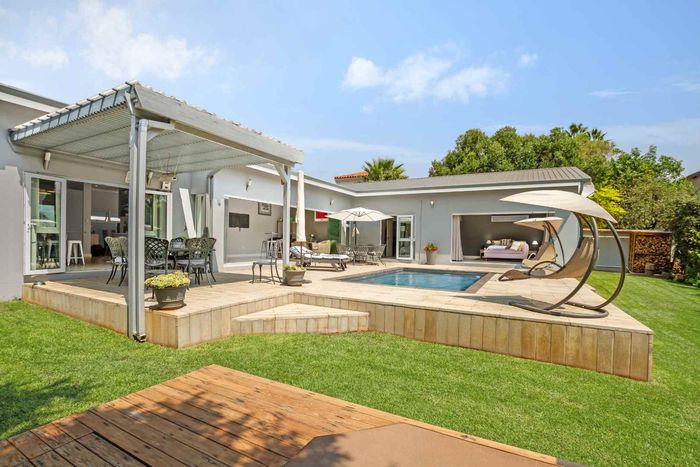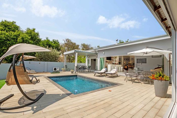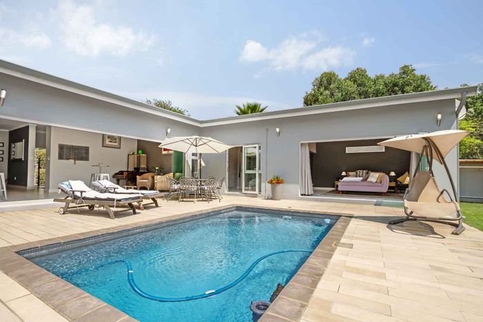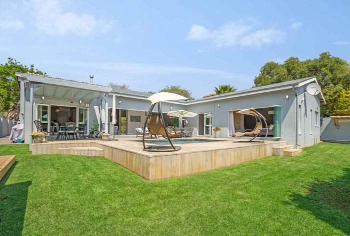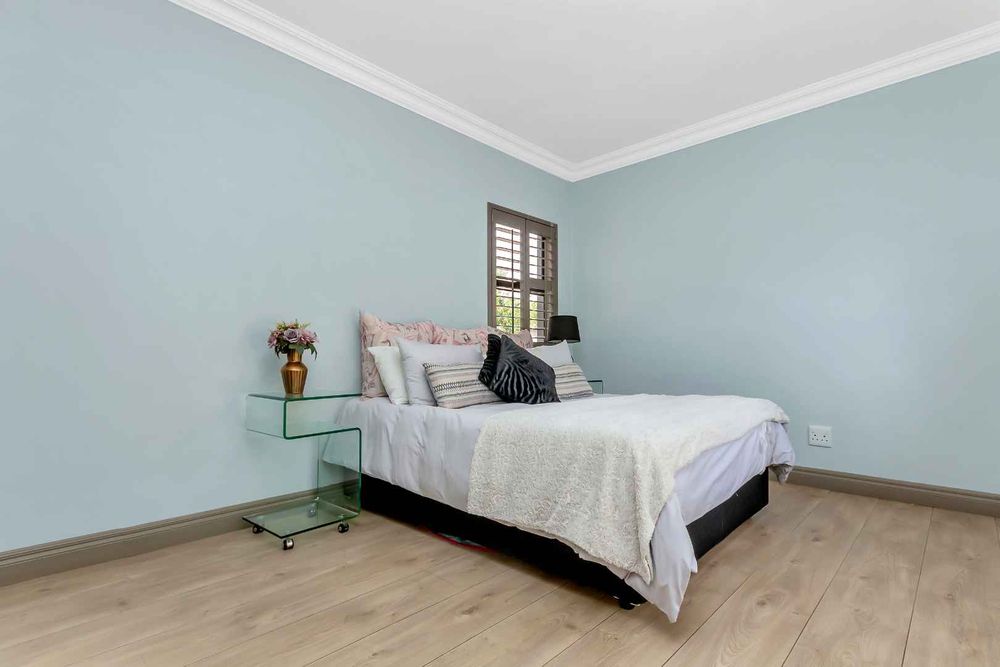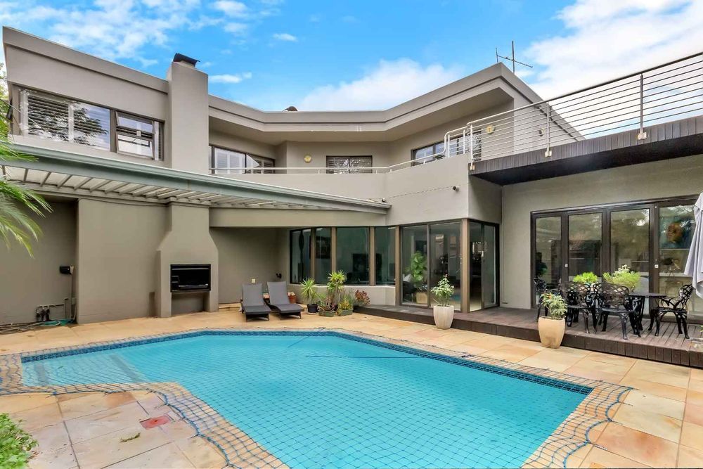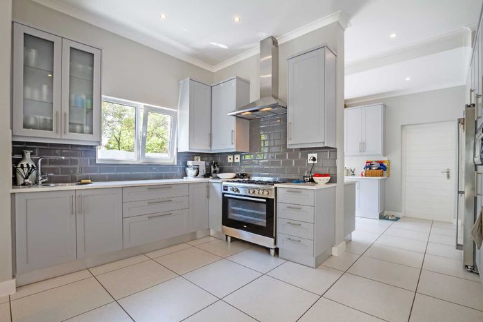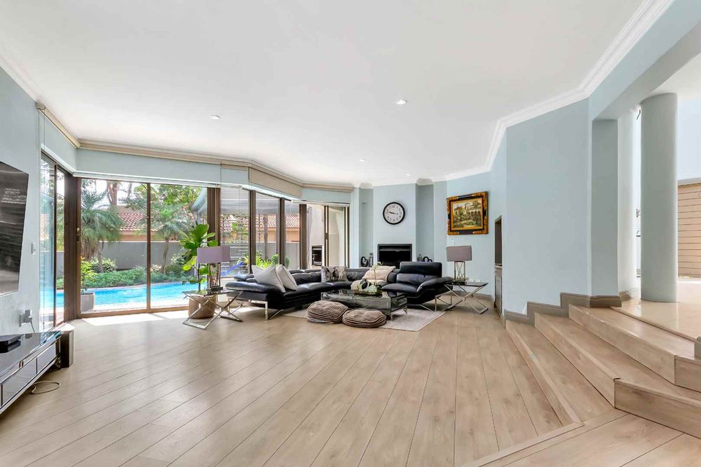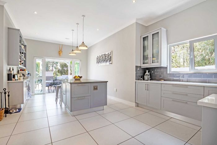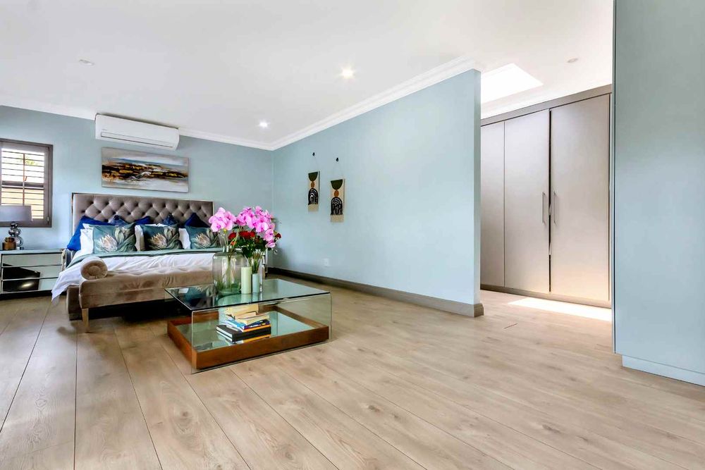 This 5-bedroom home is full of natural sunlight; the double-volume entrance area welcomes you by having a striking large skylight. The downstairs open plan living areas are ideal for entertaining. The kitchen is a Chefs Delight – modern, having hand-painted cupboards, Caesar stone counter tops, gas hob with electric oven, integrated appliances, breakfast bar, walk-in pantry cupboard, and a separate scullery. The lounge and dining rooms are open into the family room which has a wood burning fireplace – perfect for those Winter evenings.