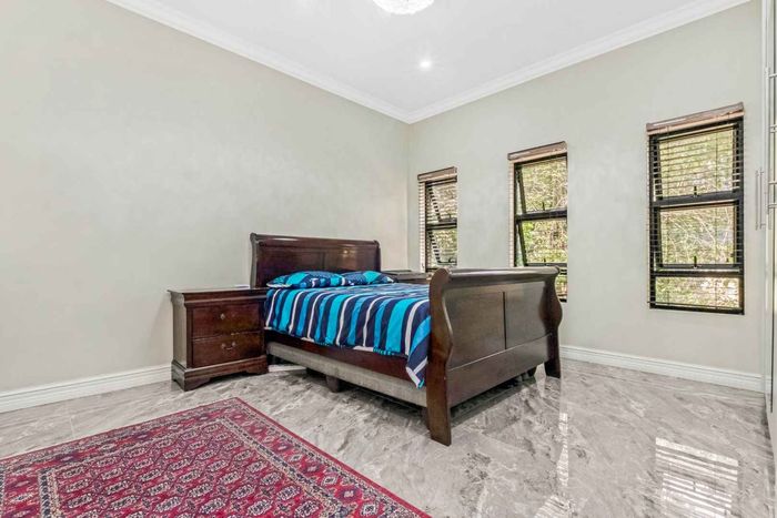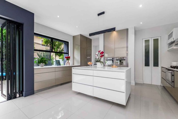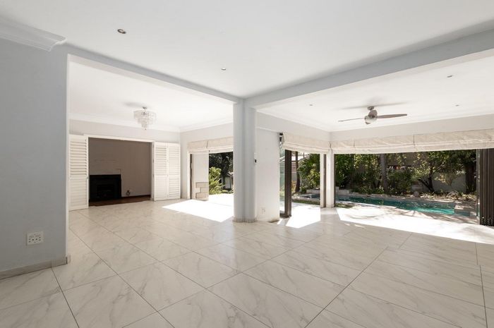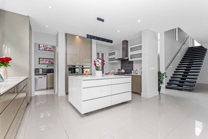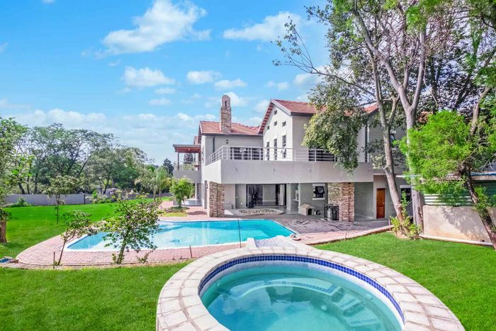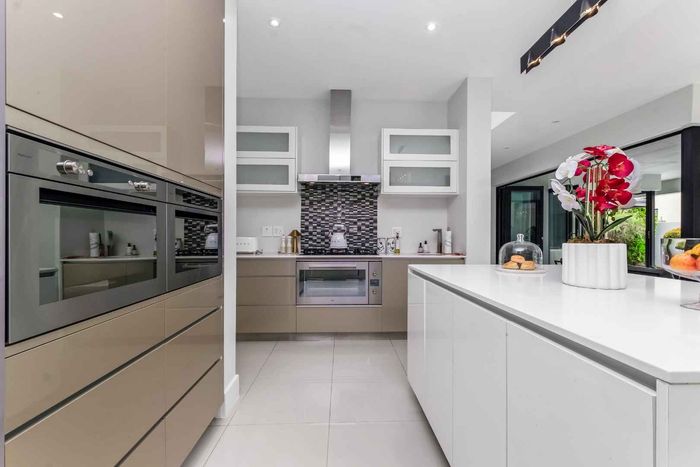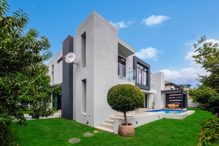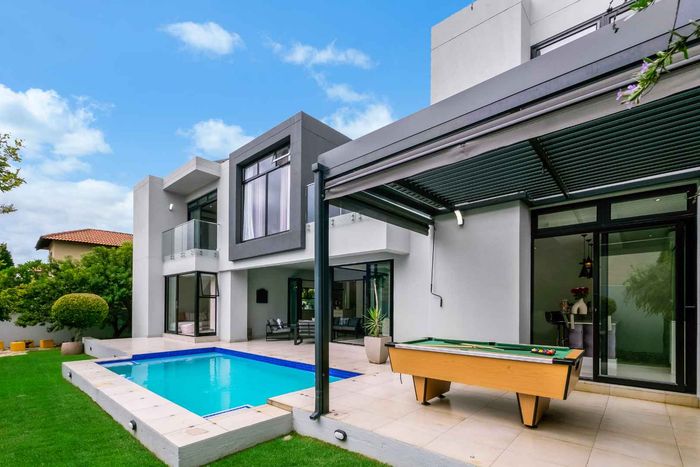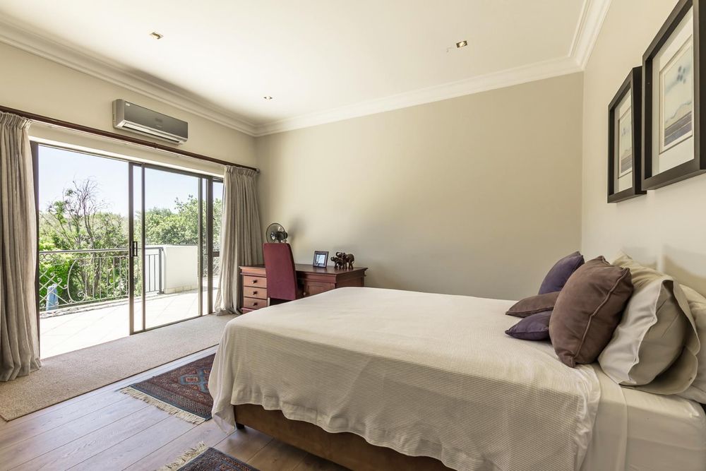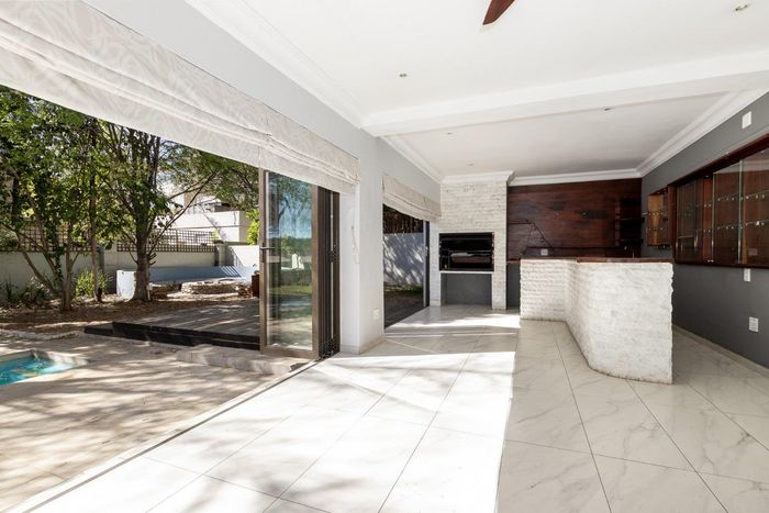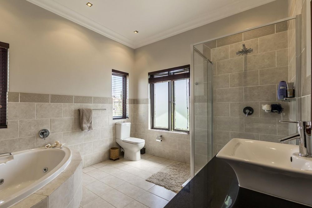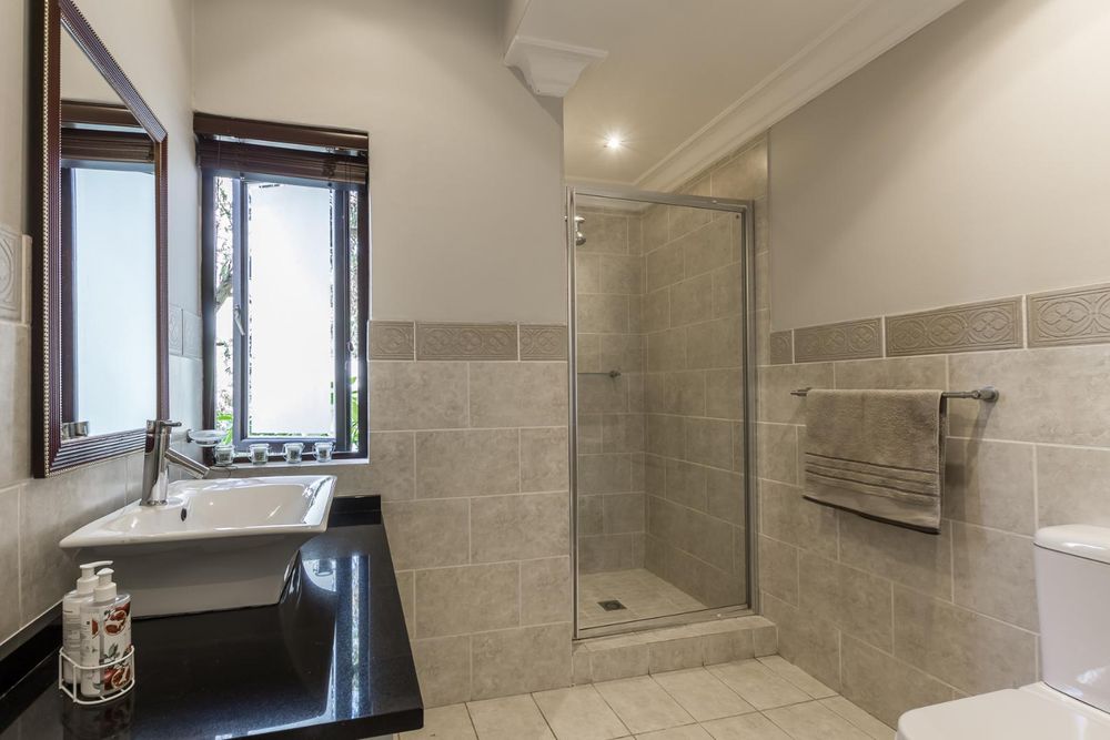 A very special grand home located in a leafy, established, and very secure Estate, with gorgeous walks and parks. The elegant and classical design will stand the test of time! This is a very good buy for a family that need a large extra en-suite bedroom downstairs, with its own entrance. The flow is excellent, with all three reception rooms leading out onto the triple size covered patio, pool and garden. There is a lovely garden and it opens onto the greenbelt so, no neighbour in front of you! There is a built in braai on the patio. Enjoy a very spacious lounge with air-conditioning and a very elegant dining room with loads of natural light from the huge double volume windows. The kitchen is modern country in style, with a gas/electric hob and oven, large pantry and a huge scullery/laundry area.