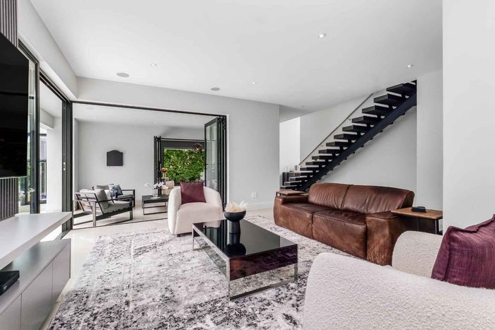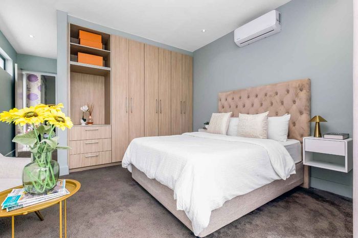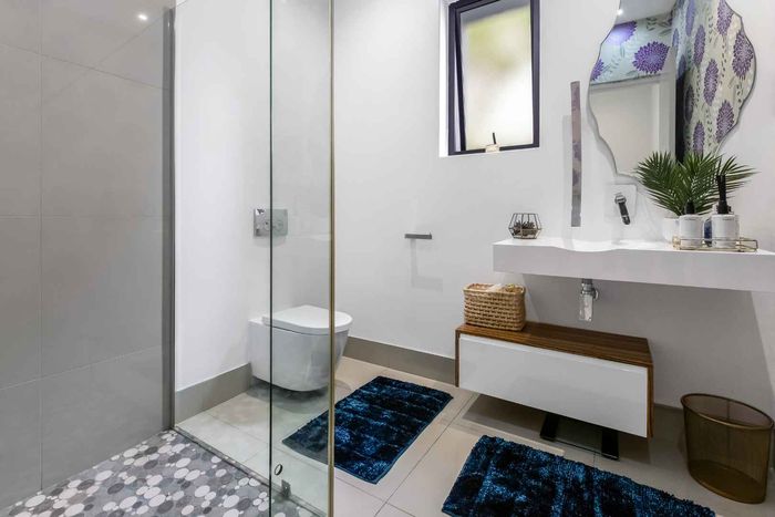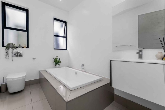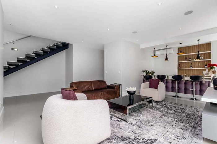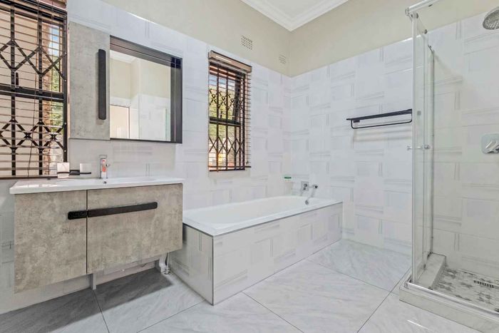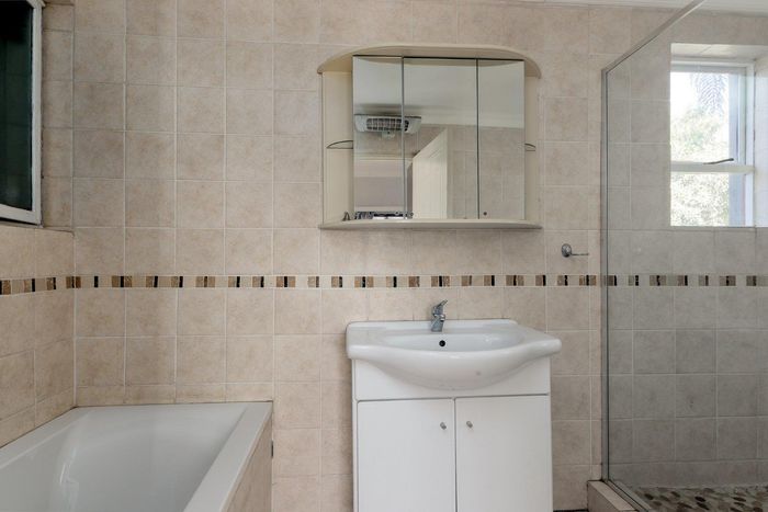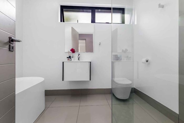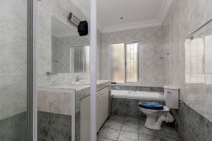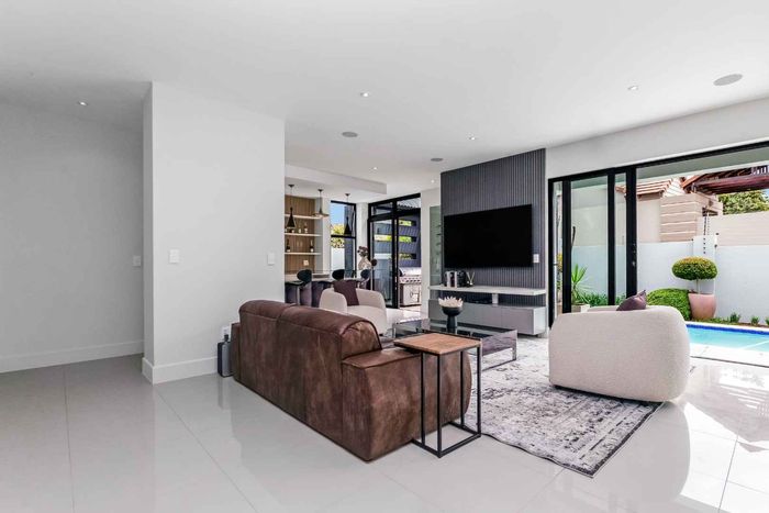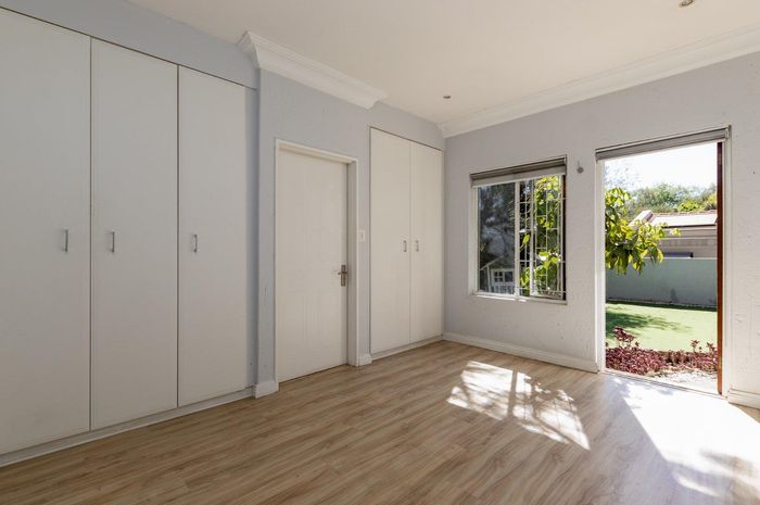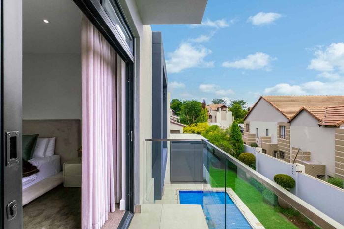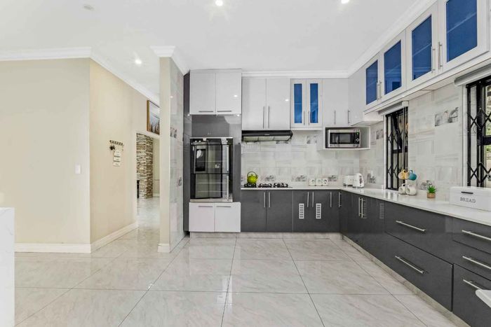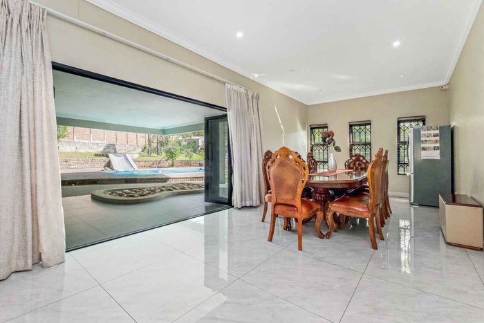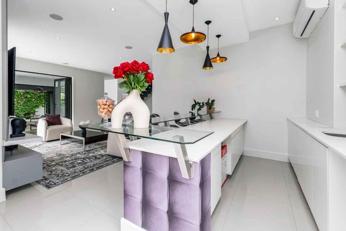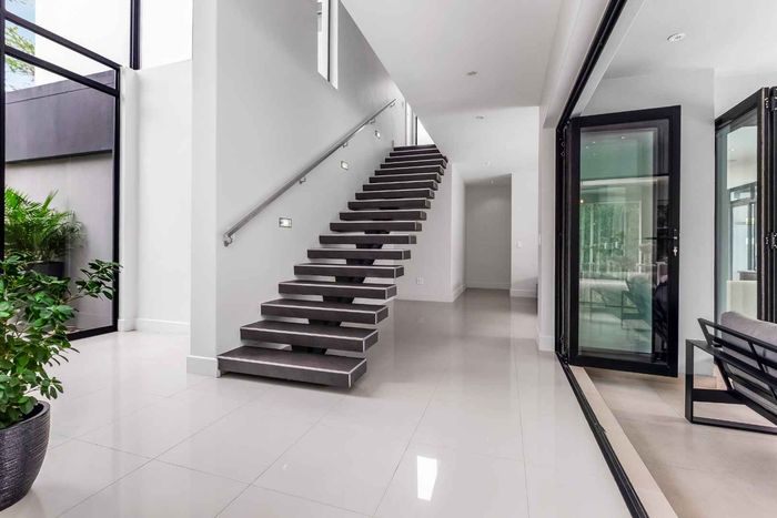A very special grand home located in a leafy, established, and very secure Estate, with gorgeous walks and parks. The elegant and classical design will stand the test of time! This is a very good buy for a family that need a large extra en-suite bedroom downstairs, with its own entrance. The flow is excellent, with all three reception rooms leading out onto the triple size covered patio, pool and garden. There is a lovely garden and it opens onto the greenbelt so, no neighbour in front of you! There is a built in braai on the patio. Enjoy a very spacious lounge with air-conditioning and a very elegant dining room with loads of natural light from the huge double volume windows. The kitchen is modern country in style, with a gas/electric hob and oven, large pantry and a huge scullery/laundry area.
