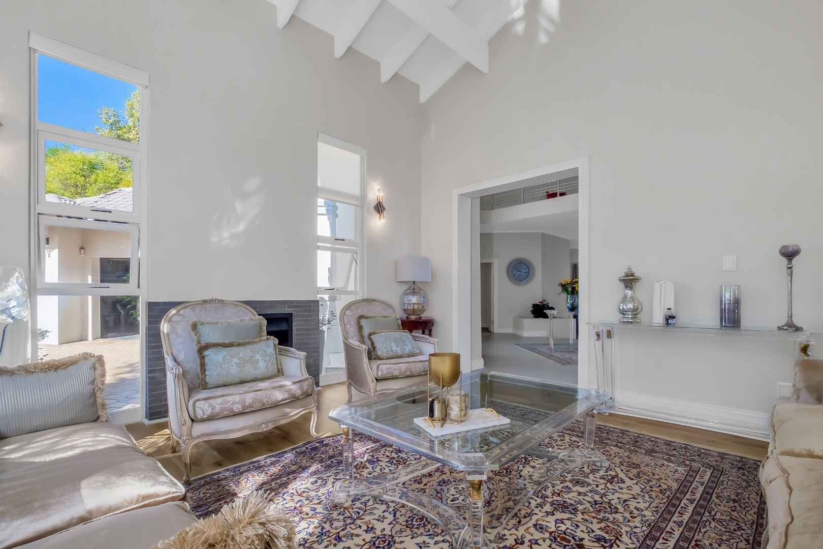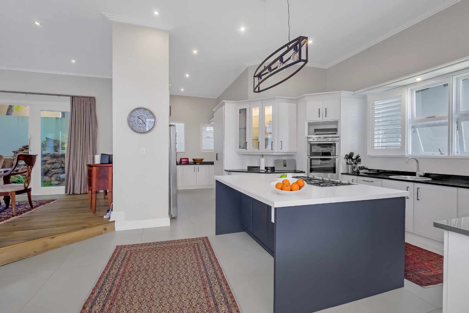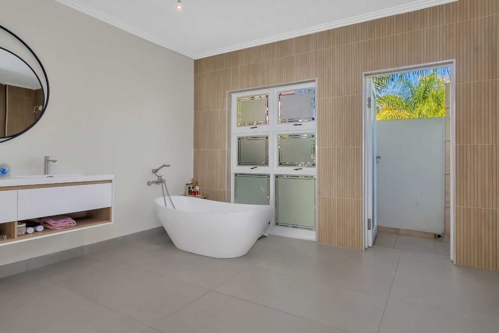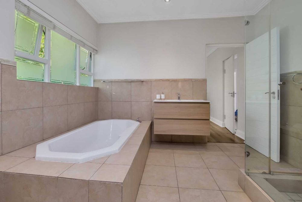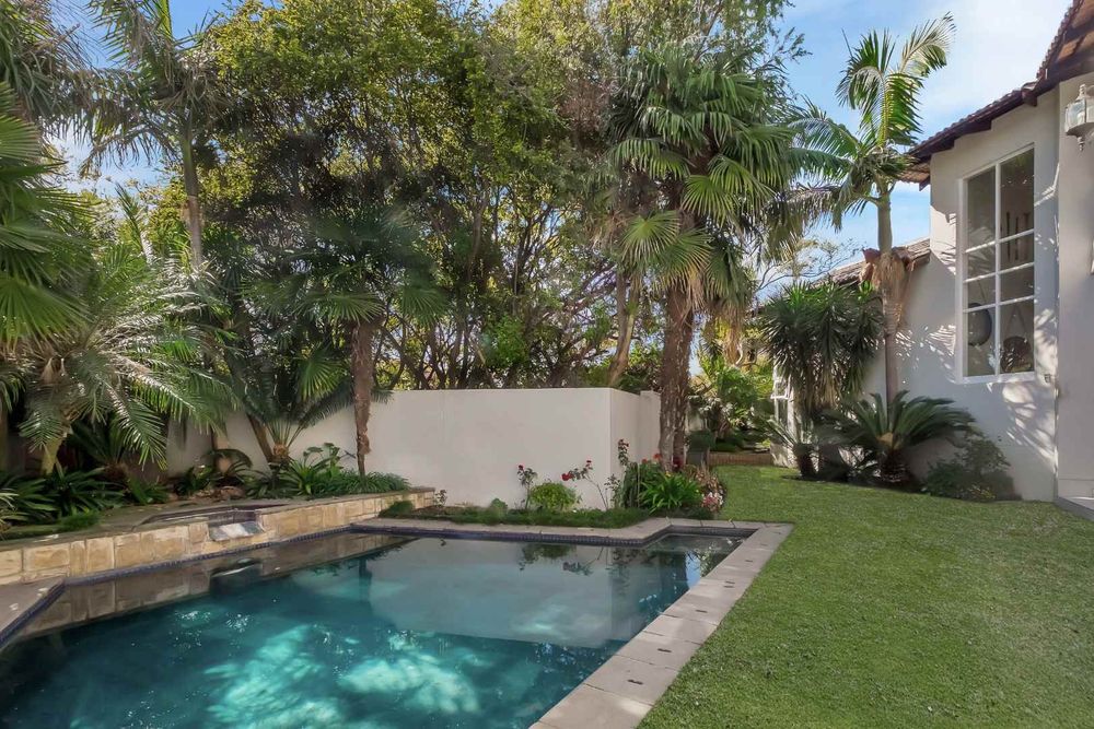 Grand, and beautifully renovated, with a sleek touch of elegance throughout. .. Visually pleasing, with so much natural light, and gorgeous wood vinyl flooring, in today’s modern look. The high ceilings and double volume entrance add to the glamourous ambience of this home. A quiet lounge with huge glass windows and fireplace, overlooks the garden. The dining room has a lovely water feature and opens onto the covered patio. The family room is absolutely stunning with large windows and a wonderful view of the pool and garden. The kitchen has a lovely central island with a gas hob and there are so many cupboards, including a huge utility area for storage and an additional cooking area. This kitchen is fit for a large family to enjoy cooking together. The covered patio has plenty of space to relax in peace and quiet with a view of trees.