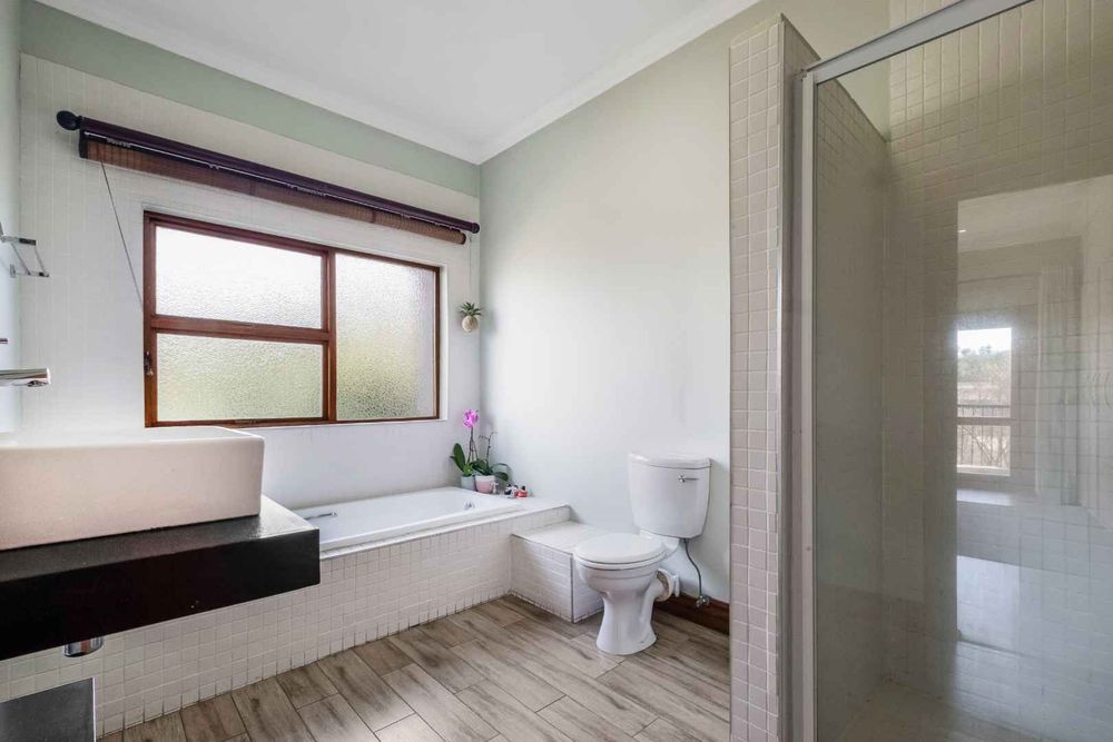 The house offers a world of calm serenity and nature as you relax on your patio, soaking up the river views. This North facing 3-level home has it all, the large entrance hall with solid wood floors opens onto 2 reception rooms that share a common wood burning fireplace, an excellent space and flow for the entertainer. Both these rooms lead out onto an expansive covered patio with gas braai, looking out over the rim flow swimming pool. The patio has all weather blinds which can be lowered to create an additional enclosed room to entertain friends during the winter months. Stylish eat-in kitchen has a centre island, granite tops, loads of solid wood cupboards and is open to the family room, which creates the perfect space to entertain family and friends whist cooking. There is a good size separate scullery, walk-in pantry room and has access to a single garage. Guest cloakroom and en-suite guest bedroom with its own entrance completes the lower level.
