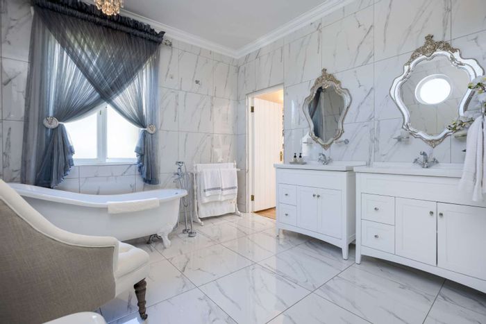 The kitchen is very spacious with a huge walk-in pantry and separate scullery. Upstairs there is a PJ lounge area with 4 very generous sized bedrooms, and 3 bathrooms, 2 are en-suite. The main bedroom and second bedroom have access to a lovely balcony overlooking the pool and garden. The huge en-suite guest room has an exterior staircase, ideal for visitors or a work from home office. There is a double garage and staff accommodation. This is a lovely family home with so much charm, you cannot go wrong with this buy. Call the Agents to view.